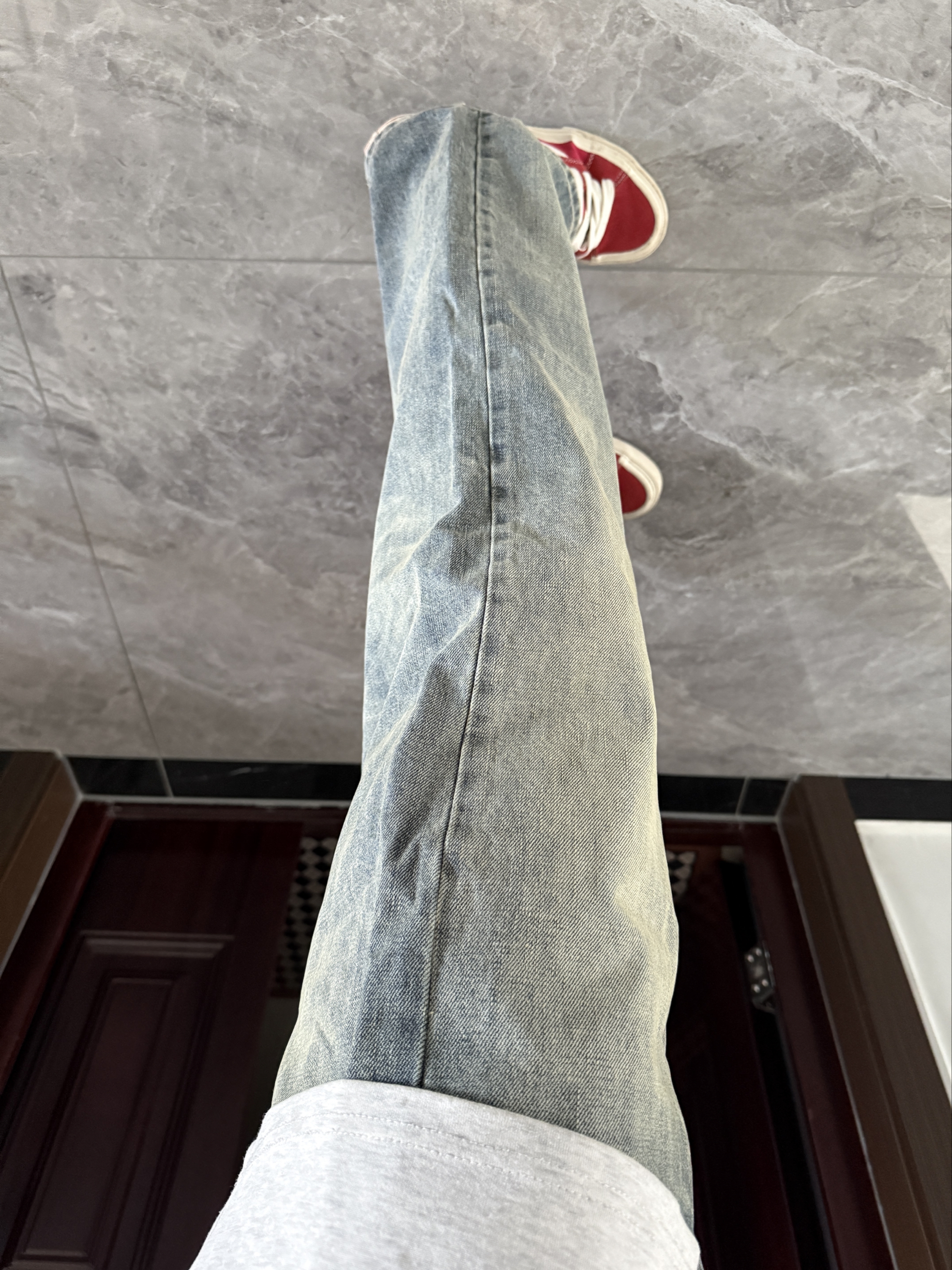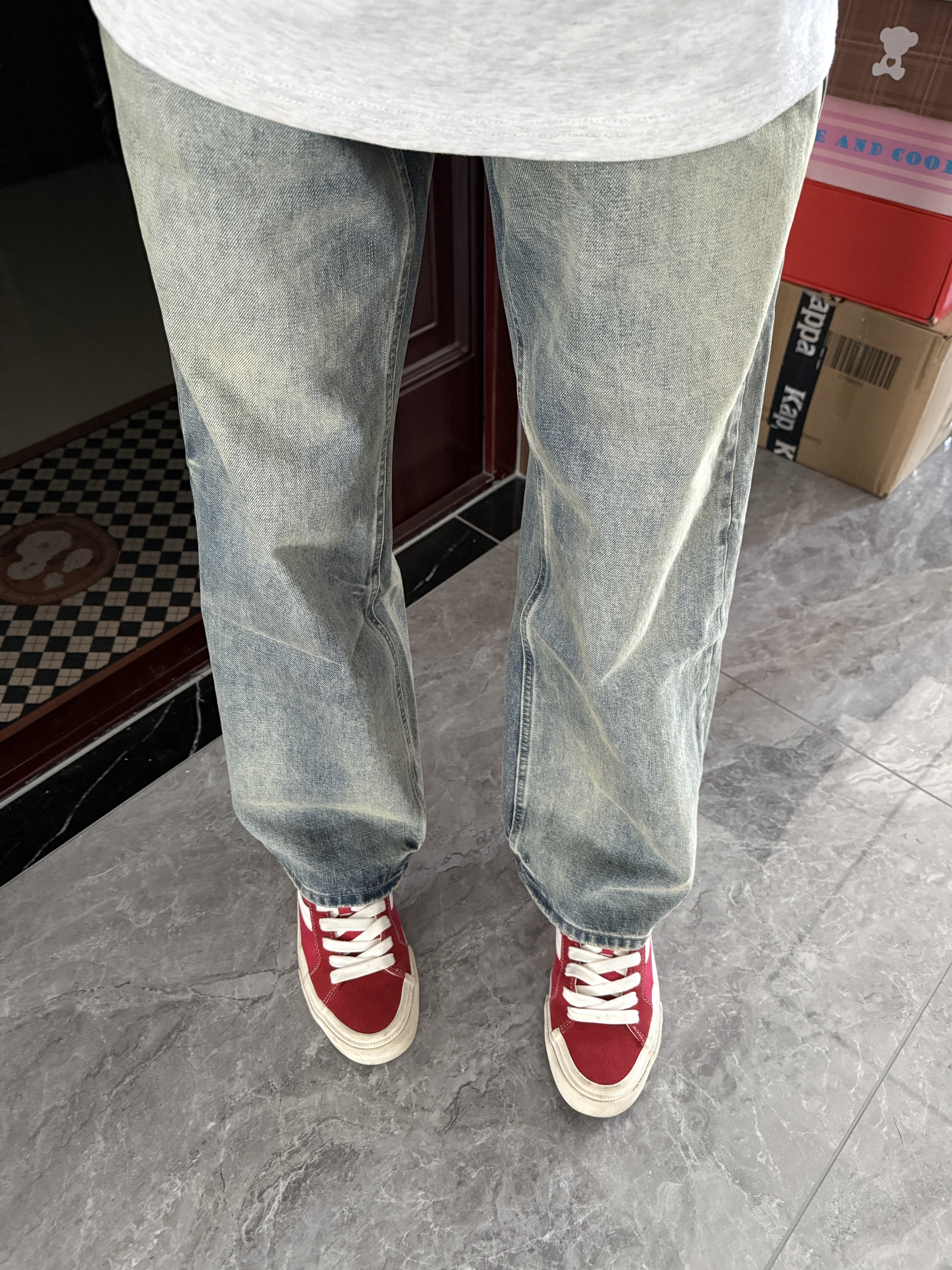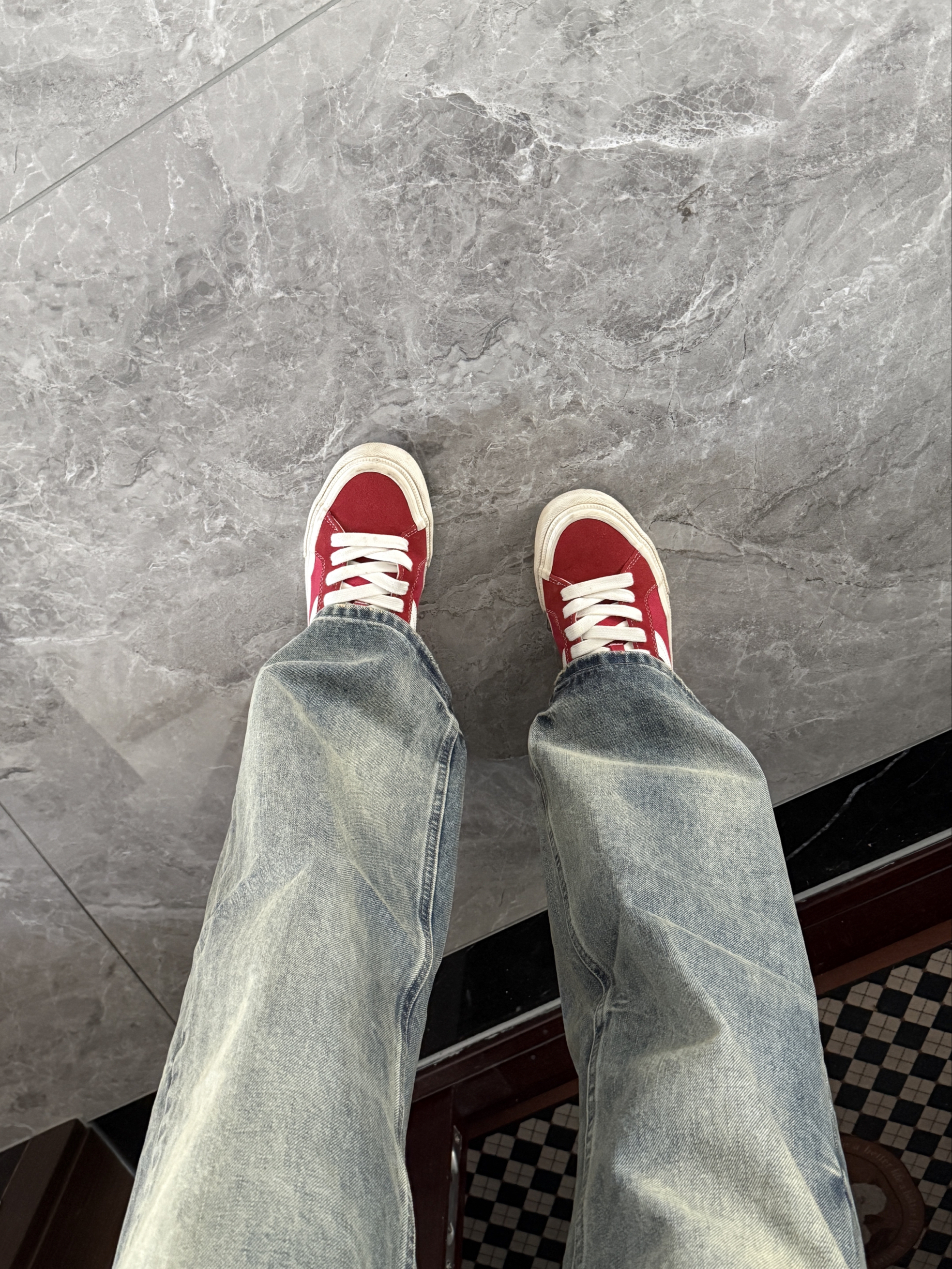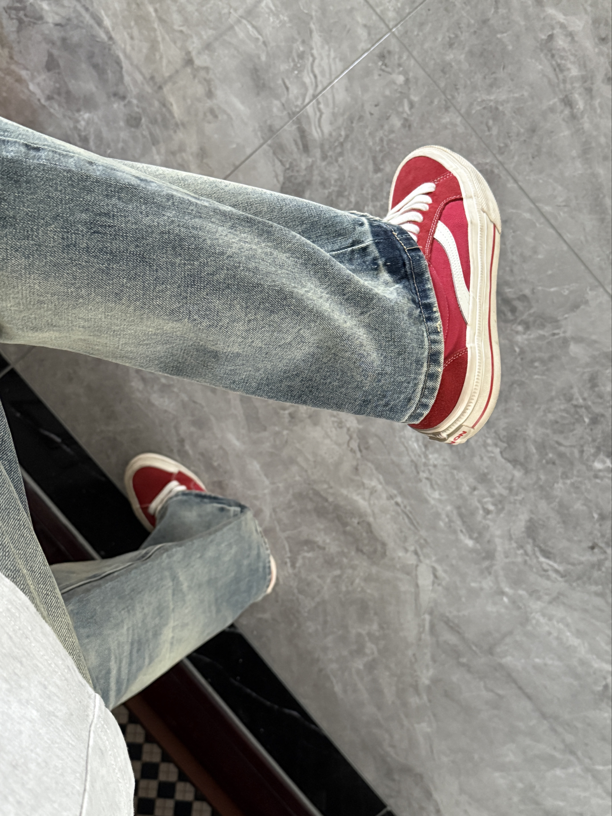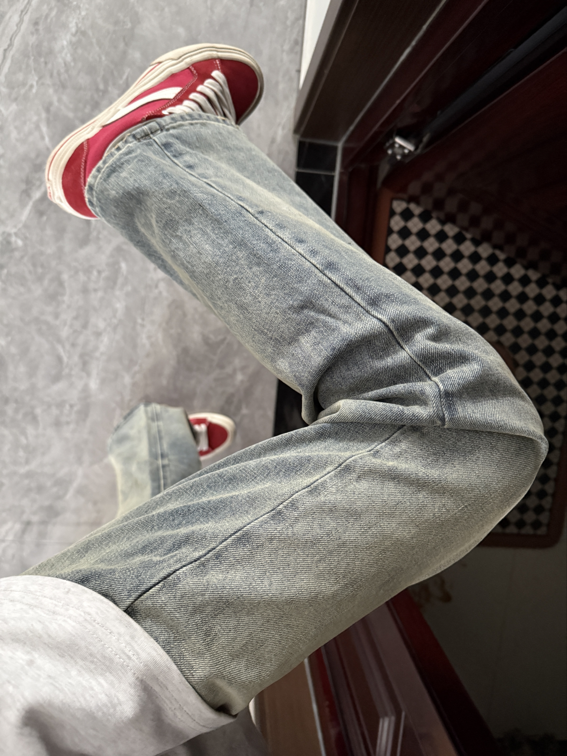 很喜欢这种简单干净的穿搭~ 裤子是一条猫须做旧复古牛仔裤 直筒阔腿的版型就很适合日常休闲穿 简单百搭的基础款随便搭就很帅 搭双红色复古板鞋一套复古潮流穿搭太帅啦