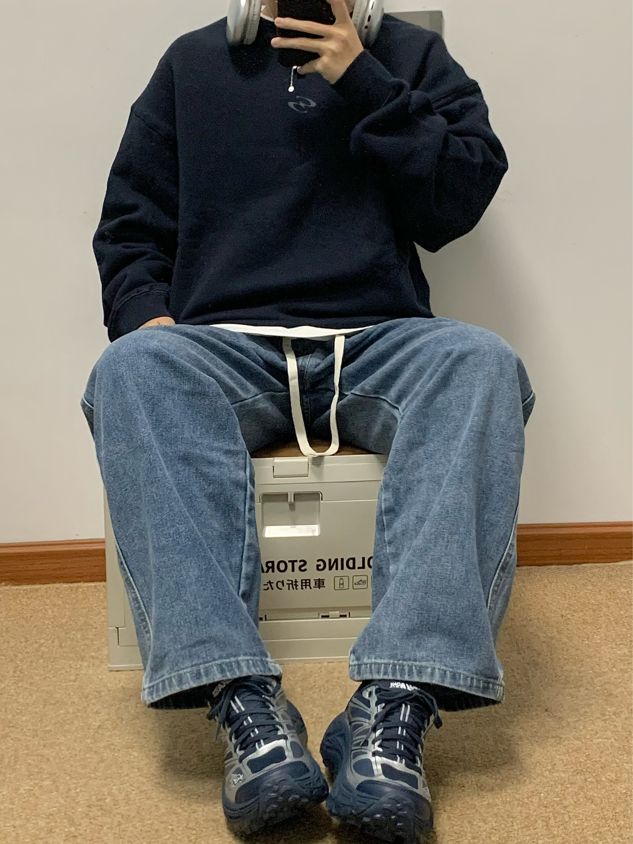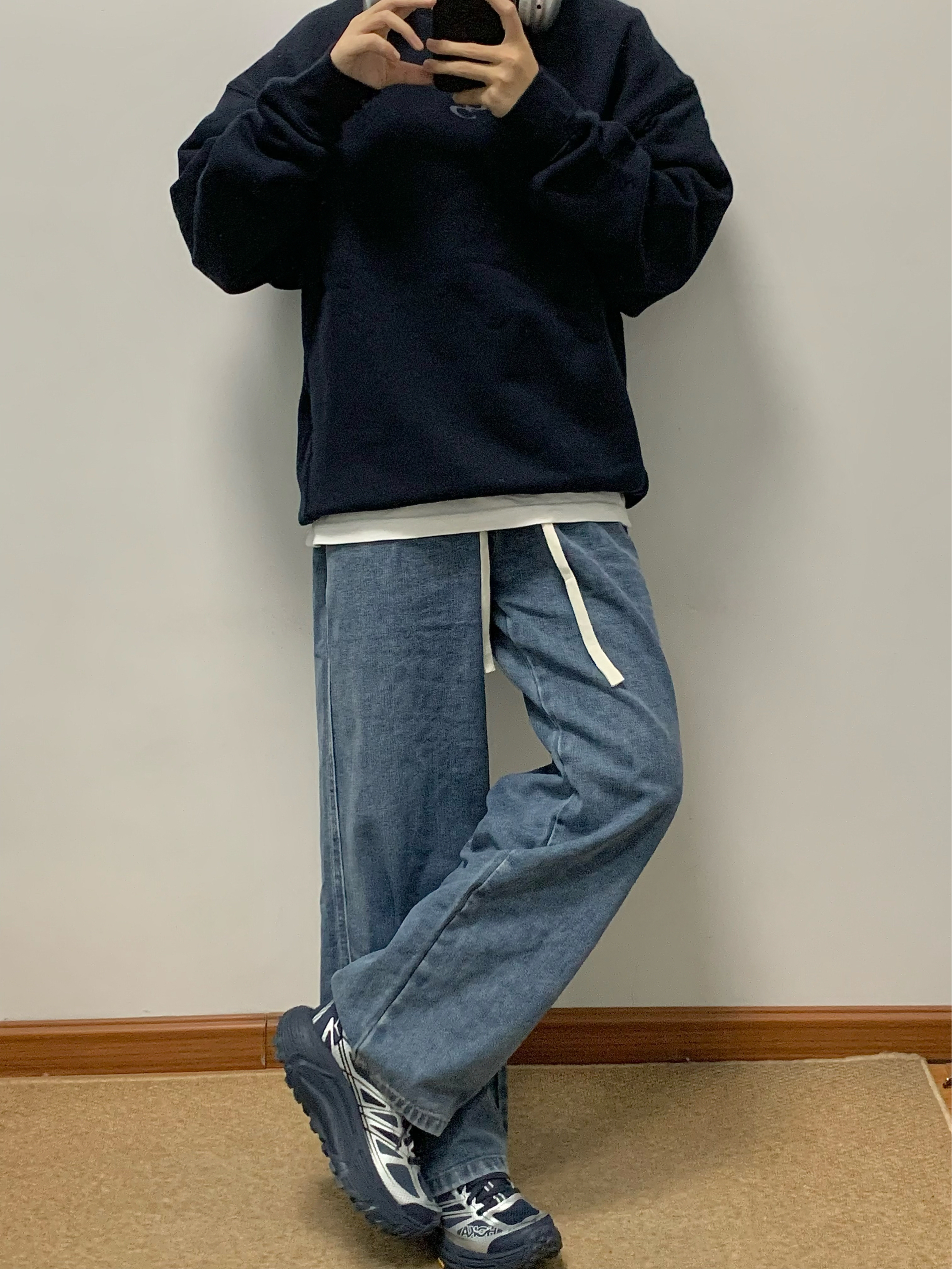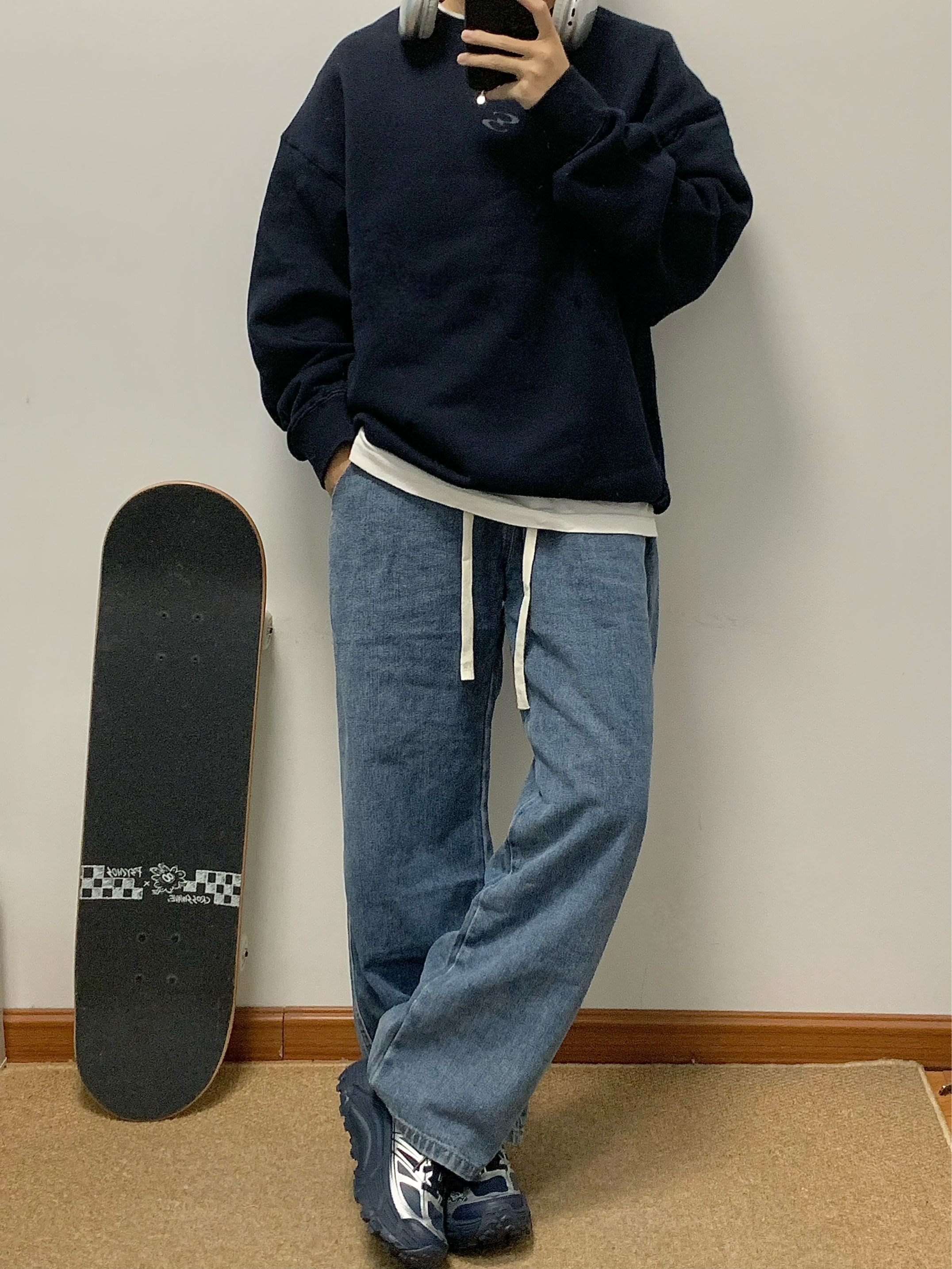 藏青色卫衣搭配蓝色牛仔裤 少年感十足 整体水洗面料 上身很有质感 宽松直筒的版型 显高显瘦 日常搭配卫衣或者外套都可 入秋就穿这一身 包帅的! 👔:真维斯