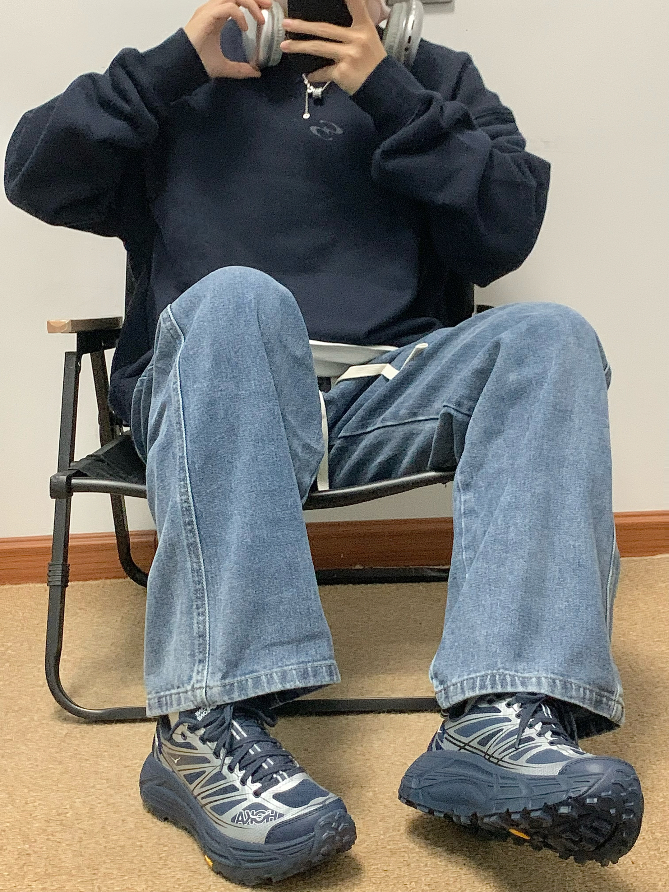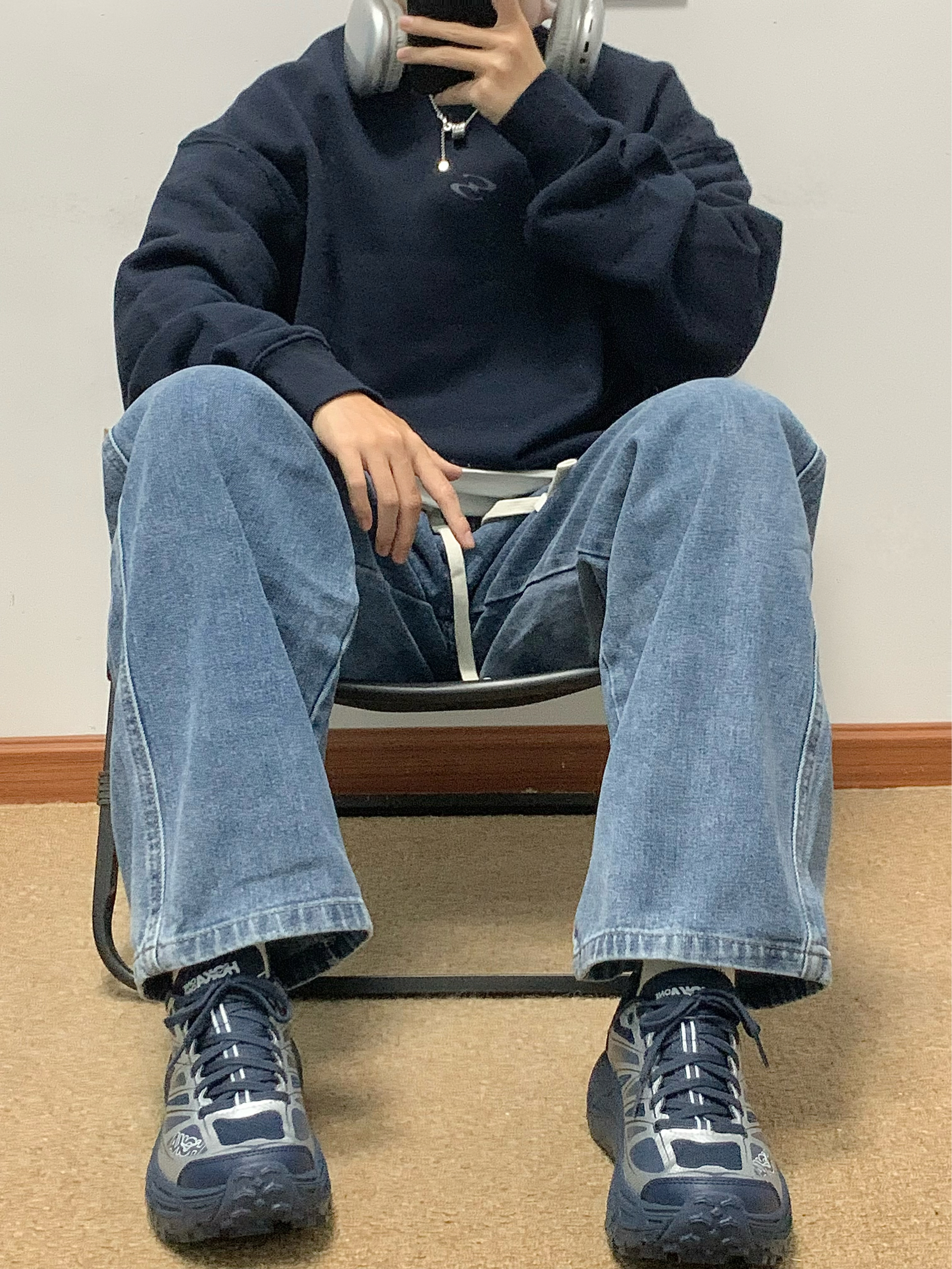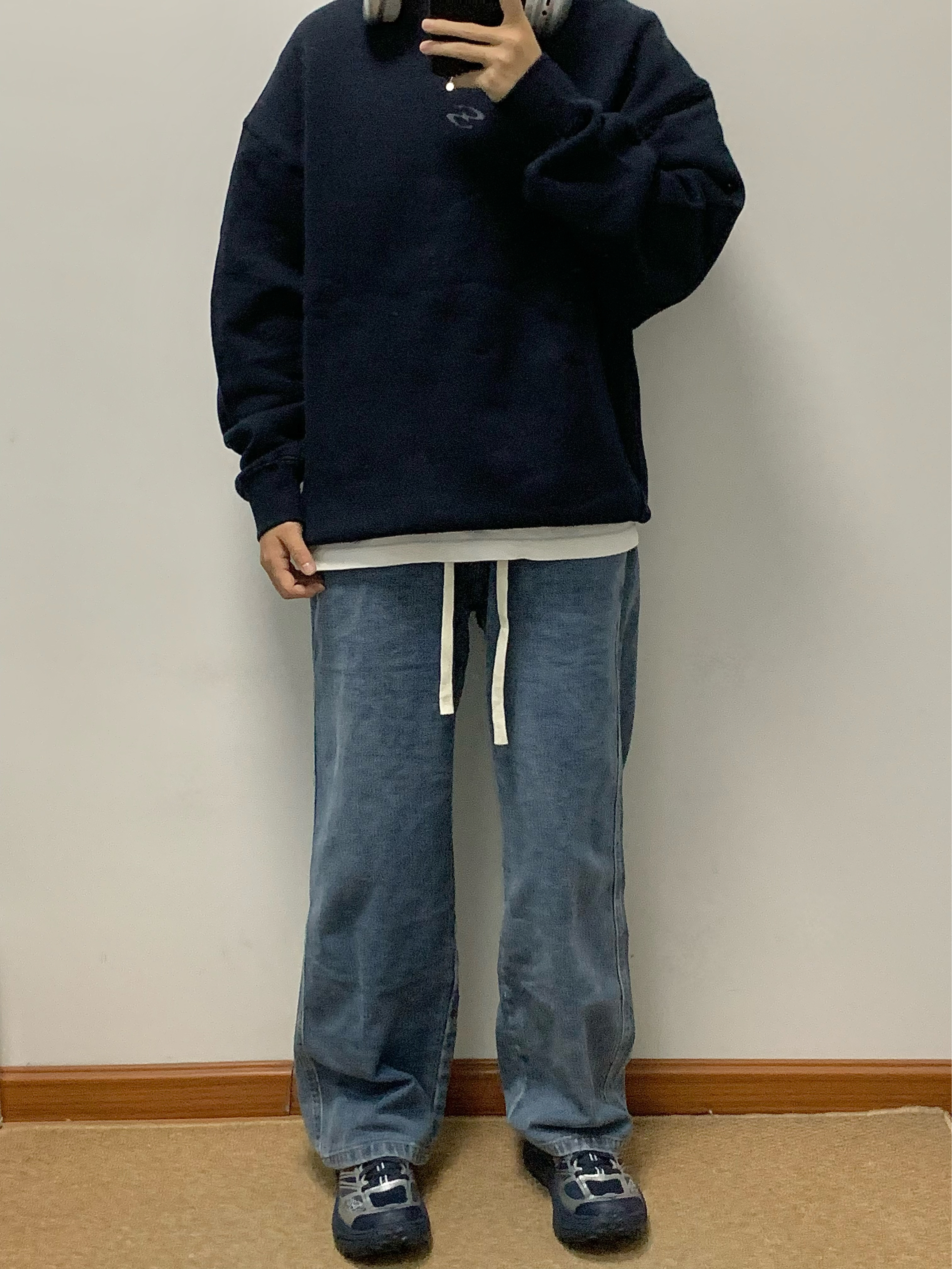 藏青色卫衣搭配蓝色牛仔裤 少年感十足 整体水洗面料 上身很有质感 宽松直筒的版型 显高显瘦 日常搭配卫衣或者外套都可 入秋就穿这一身 包帅的! 👔:真维斯