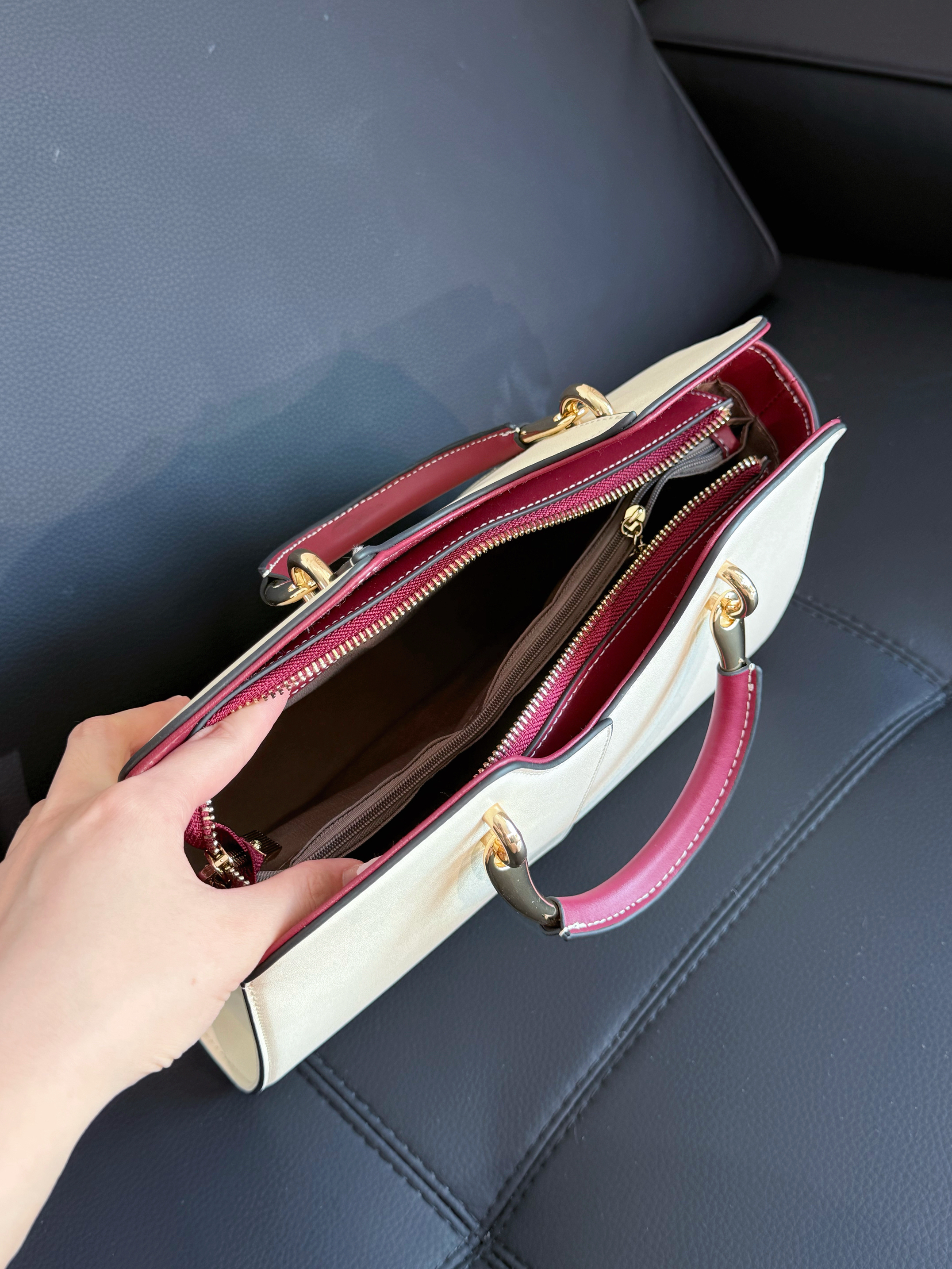 前阵子给妈妈挑日常用的包,看中了这款白色手提包,到手真的没失望。牛皮材质摸着很舒服,质感肉眼可见的好,白色干净又大气,妈妈背着去买菜、跳广场舞都挺合适,配她的碎花衬衫还挺搭。 我自己试了下,搭牛仔裤或连衣裙也不违和,上班装个笔记本、口红、钥匙啥的刚好,肩带能调,手提显气质,斜挎更方便。这种实用又不挑人的款,不管是给妈妈添个新包,还是自己日常用,都挺值的~ #到底谁是冬日显眼包 #晒出我的“C”...