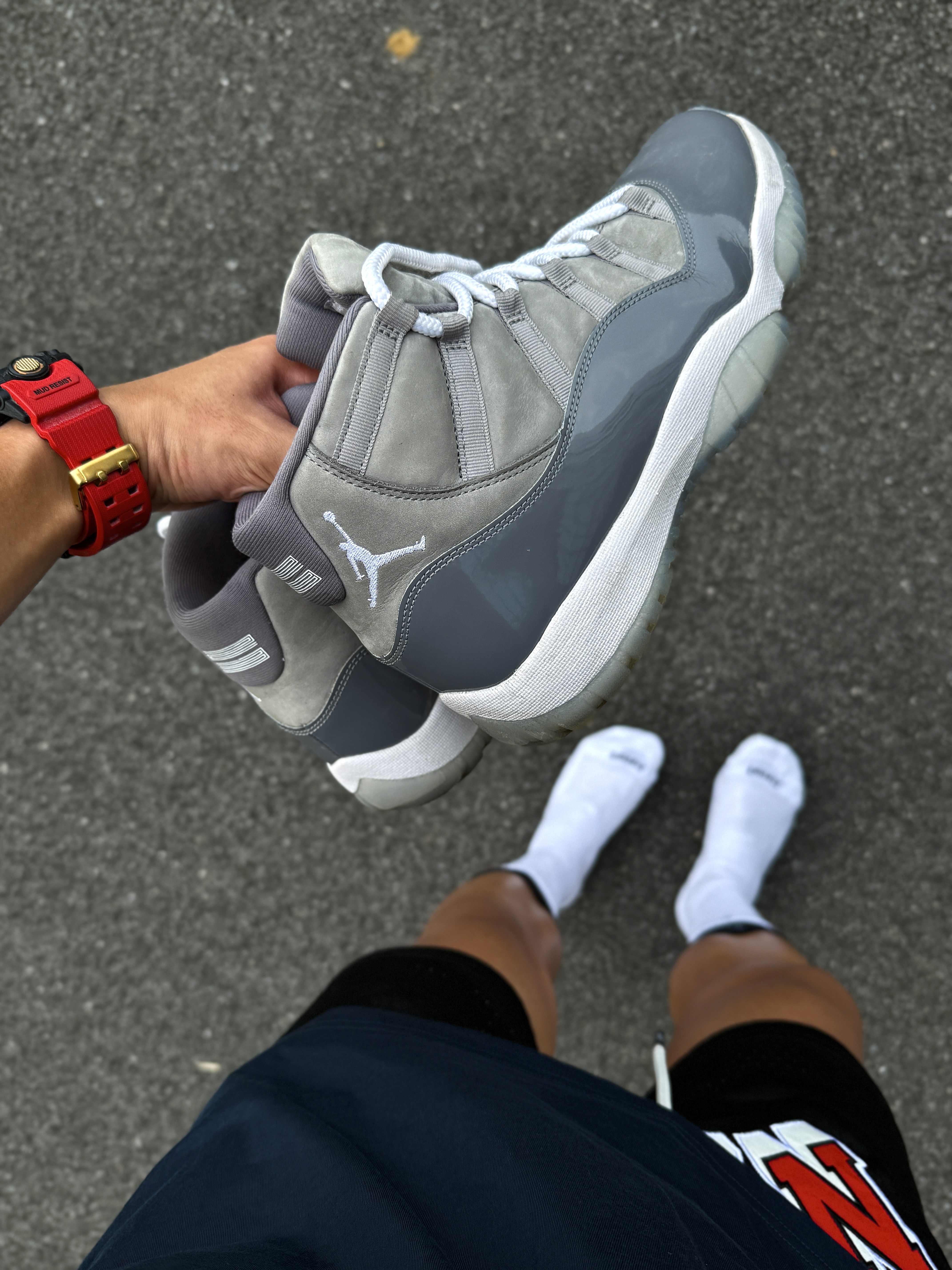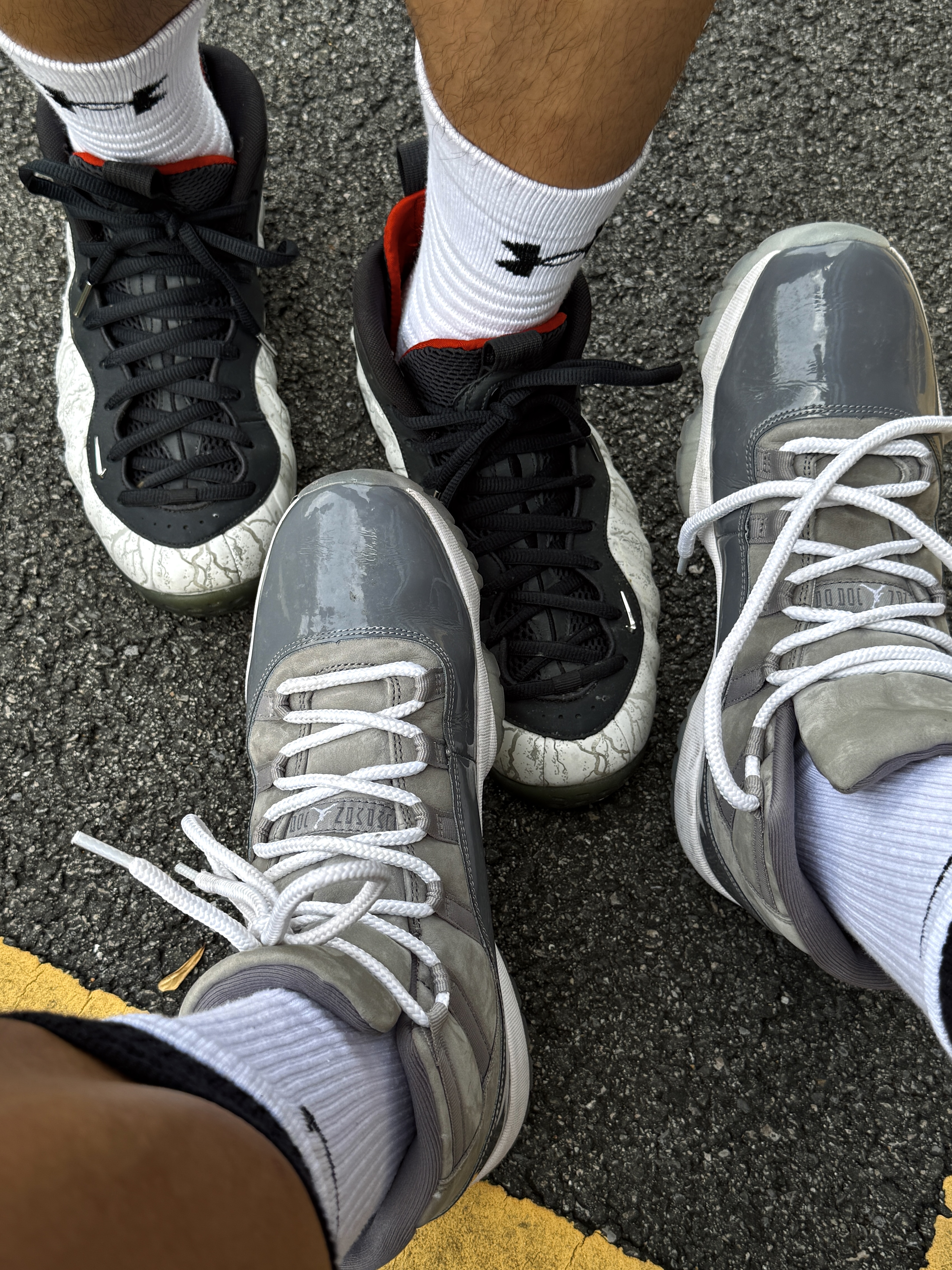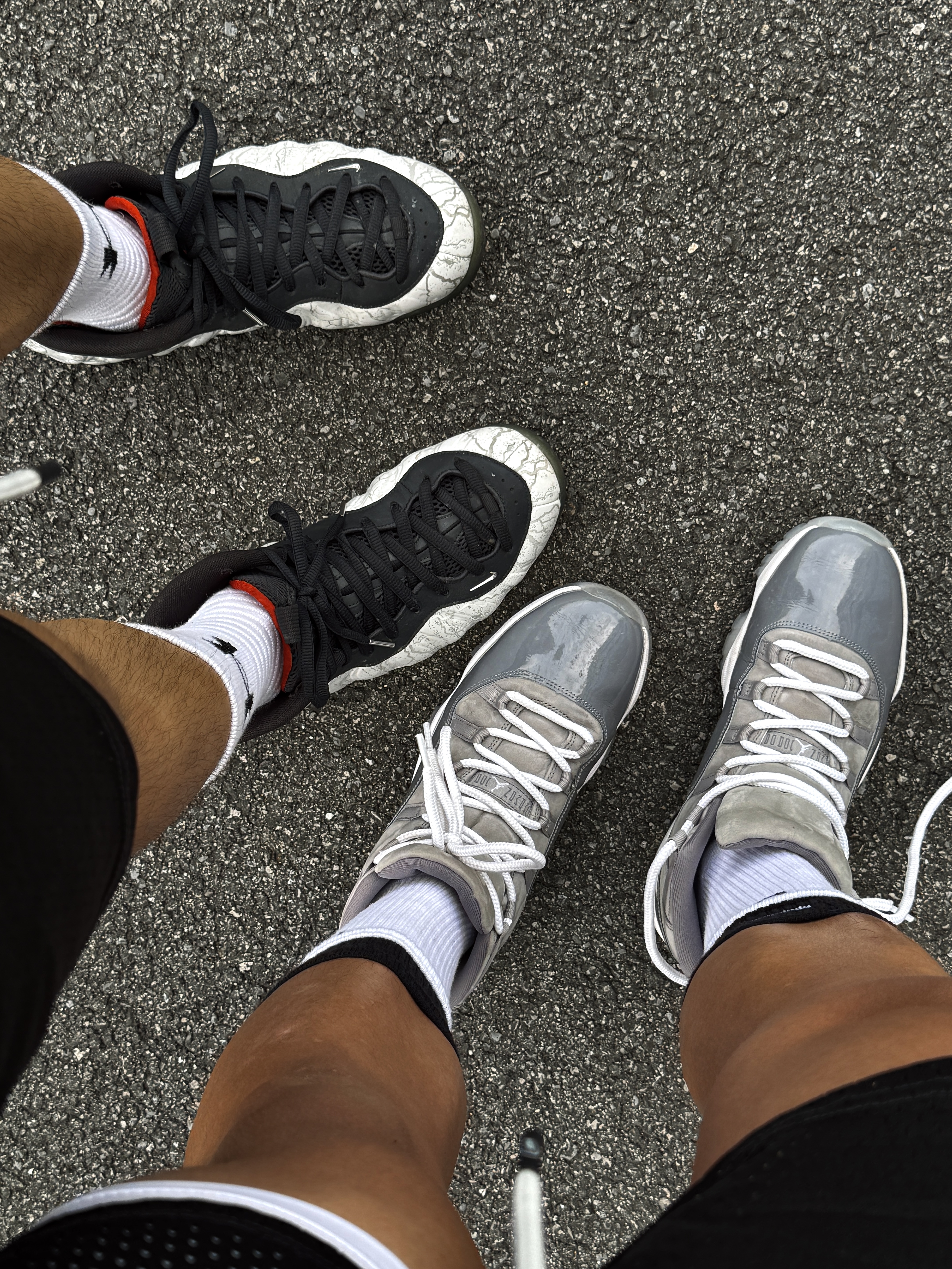 Hey bro‼️这里是小熊的球鞋日记 今天和兄弟各穿一双战靴 站在一块儿感受一下帅气球鞋的冲击力💯 ▪️ aj11酷灰 浅灰色麂皮搭配深灰色漆皮 白色中底和浅蓝色水晶底 整体低调又不失时尚感 全掌Air Sole气垫中底 缓震又稳定 脚感这一块儿没得说☑️ ▪️ 喷泡 铁拳喷 NIKE和《铁拳8》推出的联名喷泡 上脚的这双是风间仁配色 白色3M反光闪光纹理 8字logo的鞋舌设...