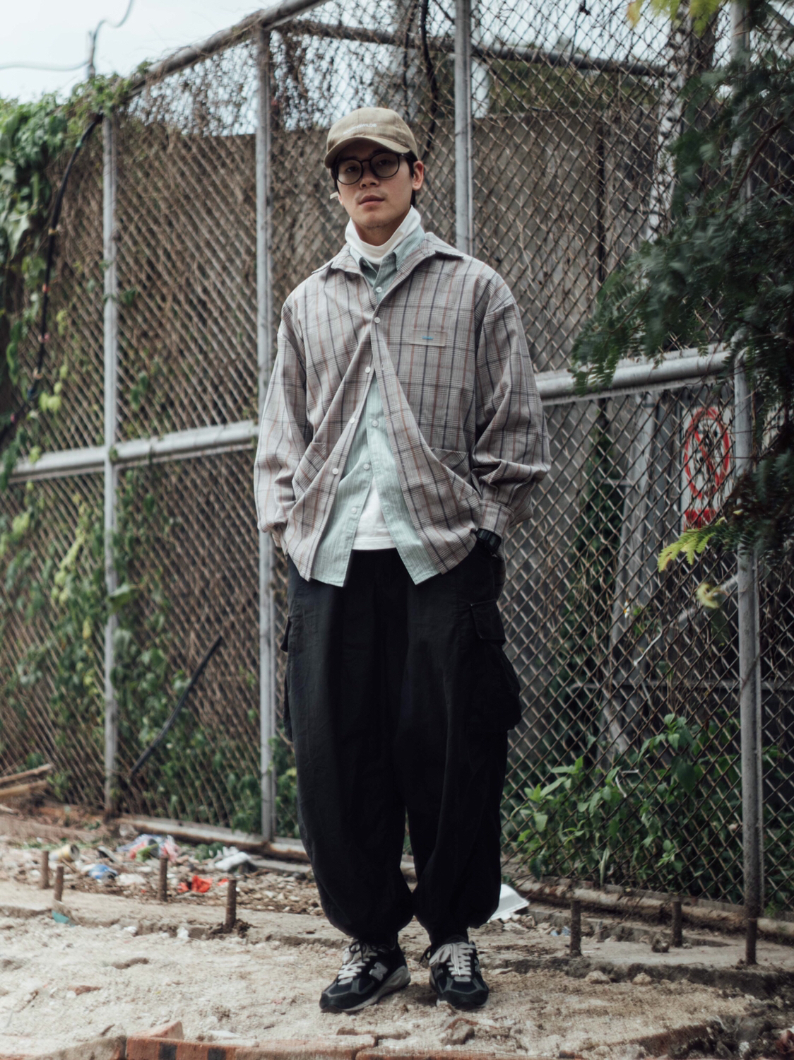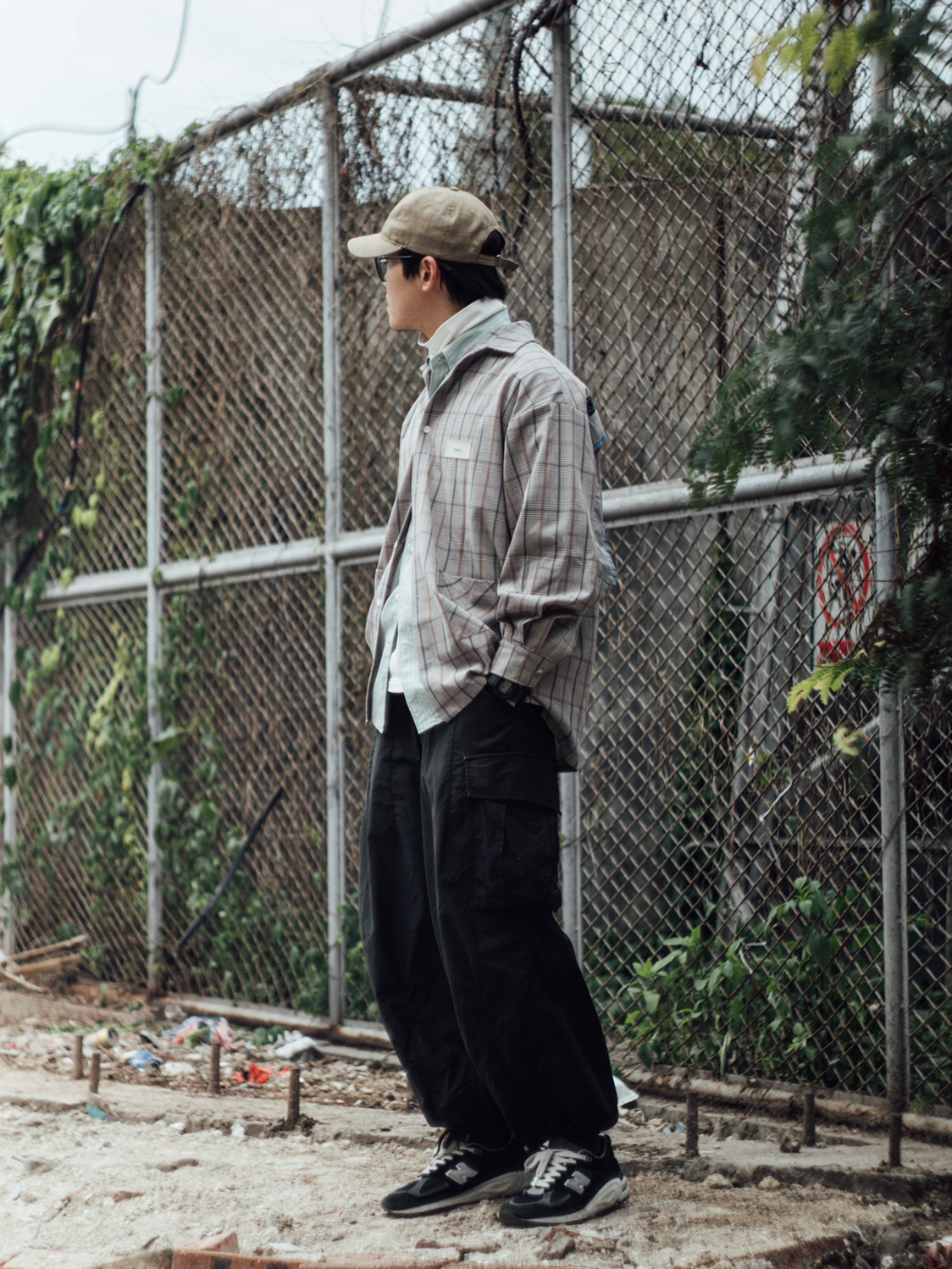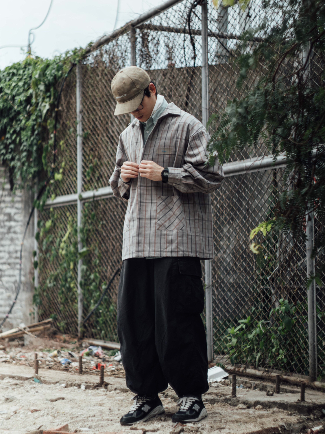 今天给大家分享一套工地男孩春夏季叠中叠穿搭,舒服百搭,层次感十足,小白也能轻松驾驭! - 图中上身单品🔗: 条纹衬衫:优衣库U系列 高领衫:优衣库U系列(19AW) 格纹外套:BLIND402 阔腿长裤:Needles 帽子:Roaringwild 鞋子:New Balance 990v2