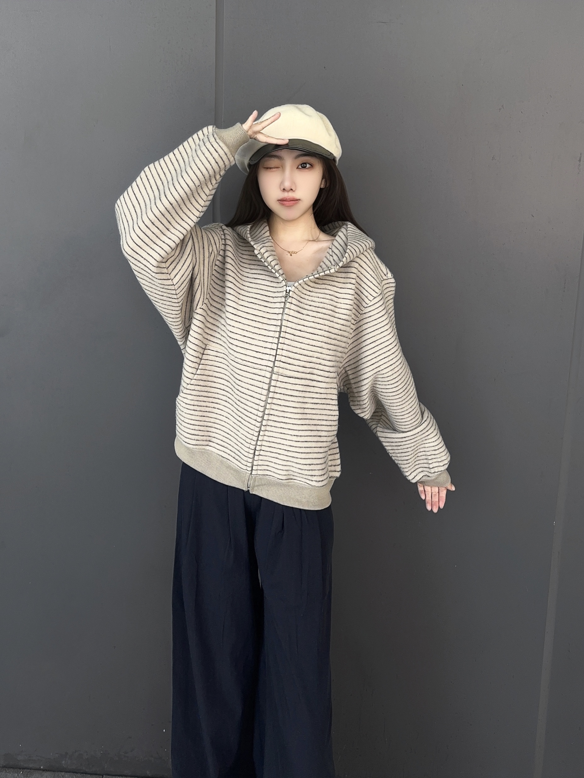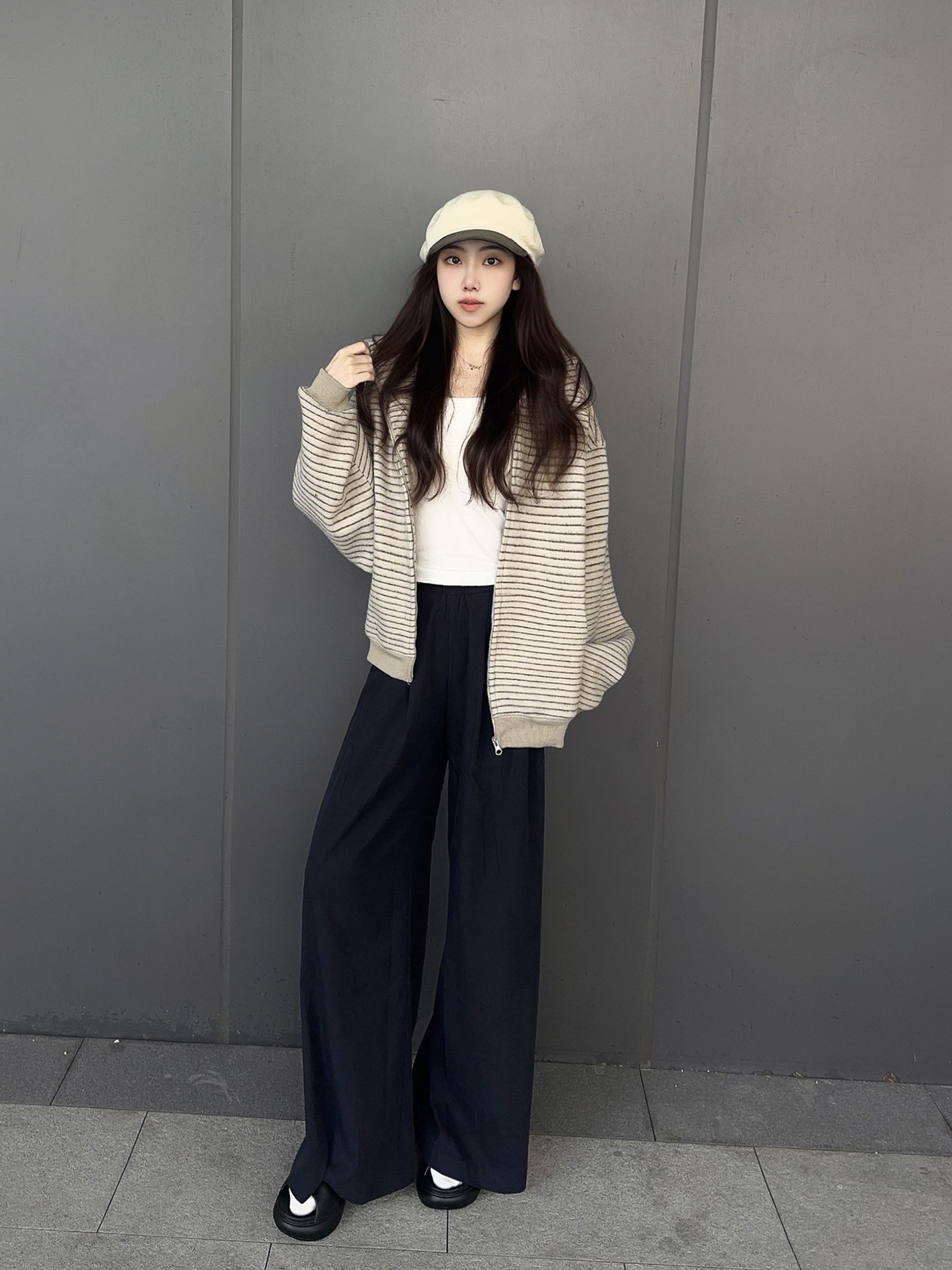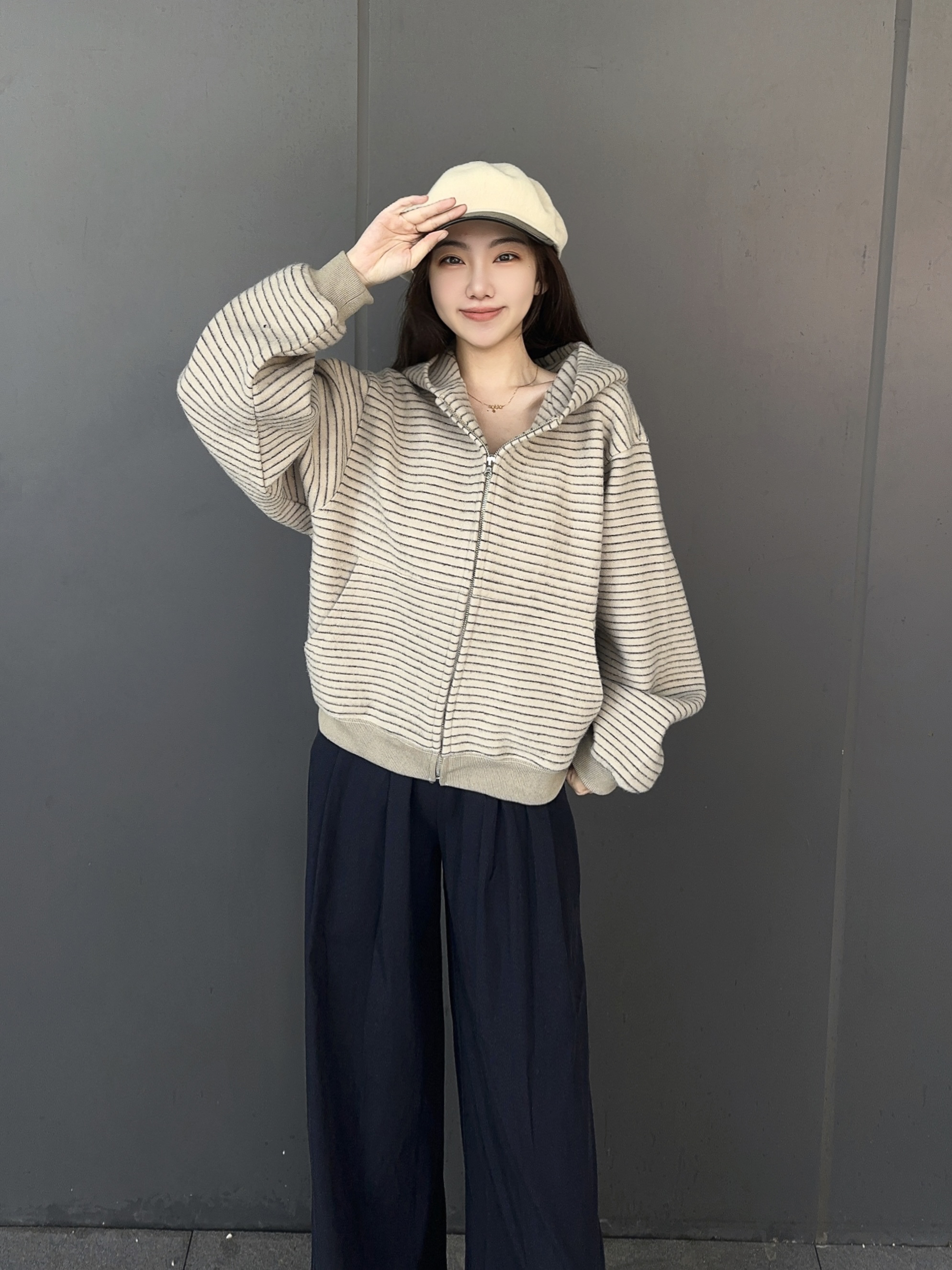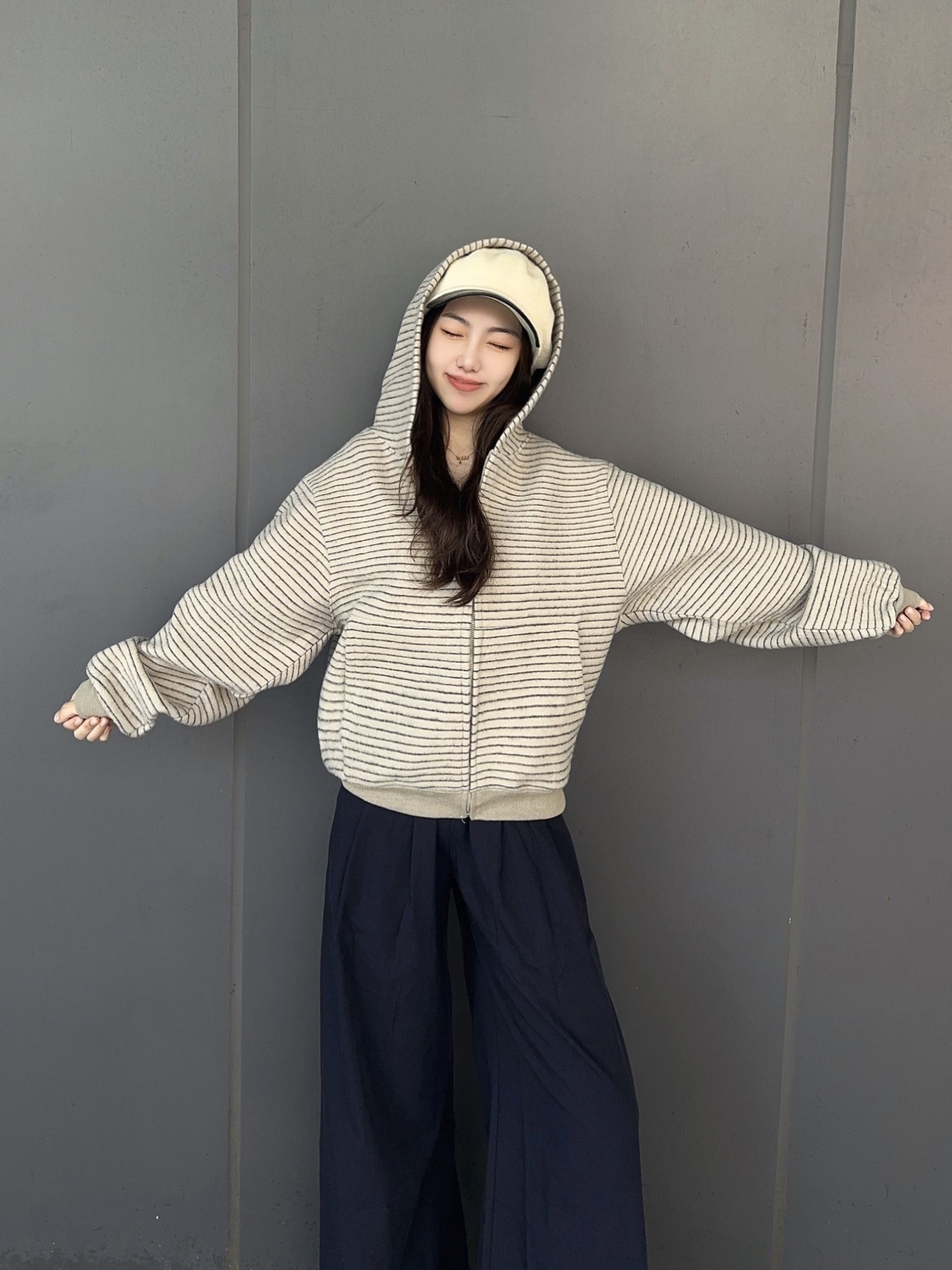 秋天正是适合穿开衫外套的季节 今天穿 条纹开衫外套+深蓝长裤 这件外套是宽松的版型,但一点不显臃肿