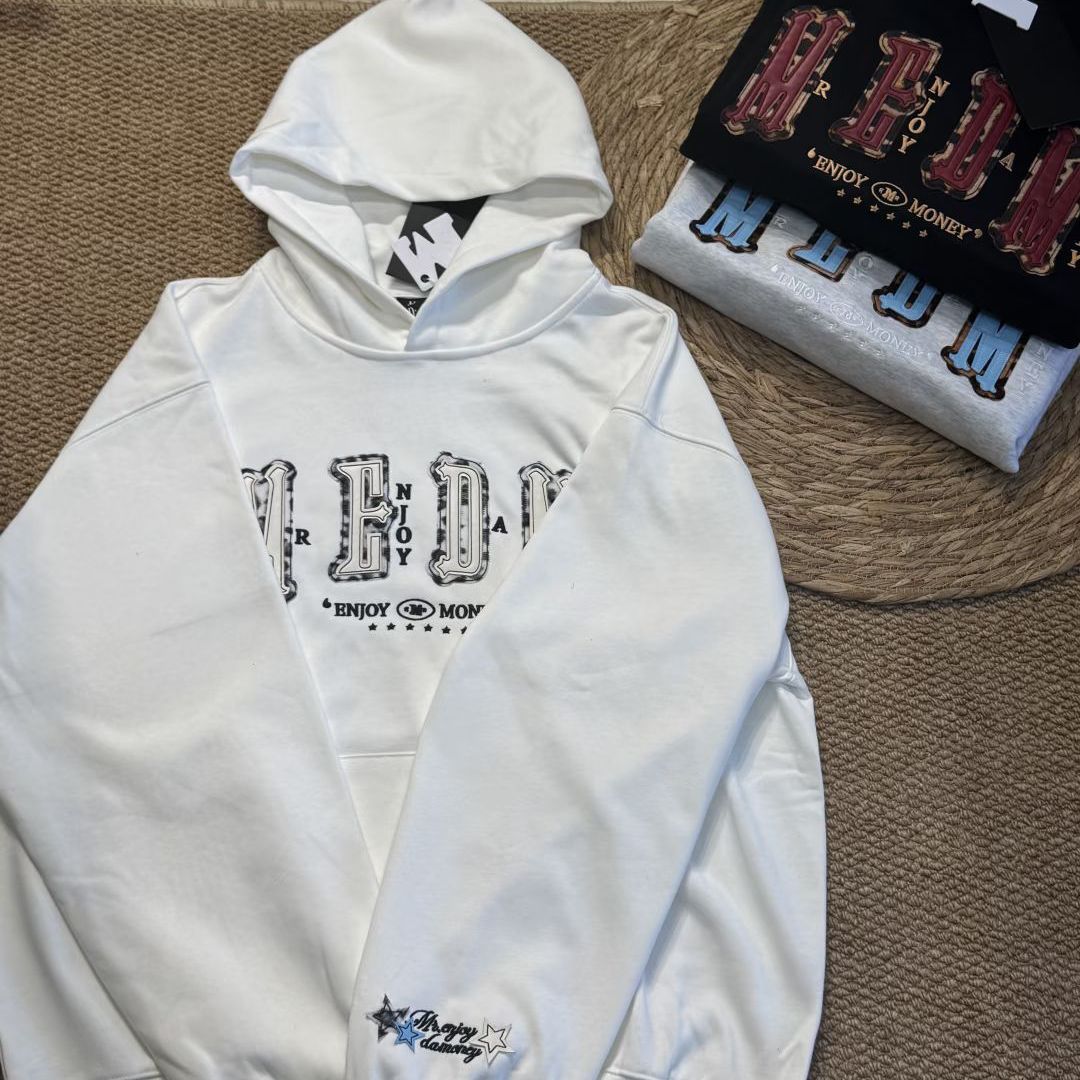 【MEDM街头宣言|解锁你的「吸金」体质】 🔥当经典卫衣成为态度画布—— ▫️白/黑/灰三色叠穿层次暴击,oversize版型裹挟街头基因 ▫️「ENJOY MONEY」字体炸裂出框,金钱游戏也要玩得漂亮 ▫️袖口刺绣/豹纹字母/镜面反光细节,暗藏反骨灵魂 MEDM实验室 用服装解构潮流哲学: 「MONEY」故意少一字?是留给穿的人自己定义! 红蓝撞色豹纹撕裂常规,黑色底纹下藏着跃动...