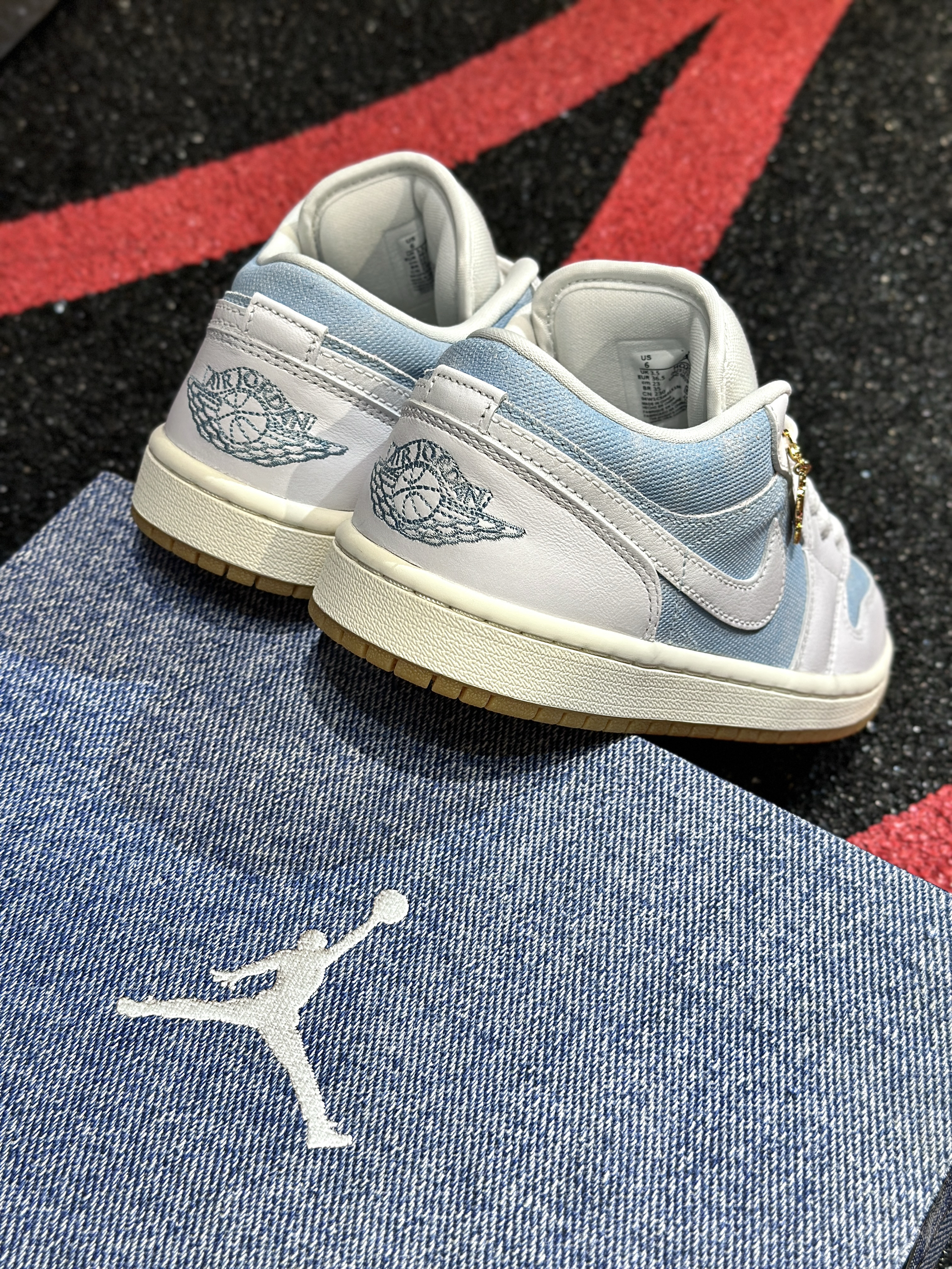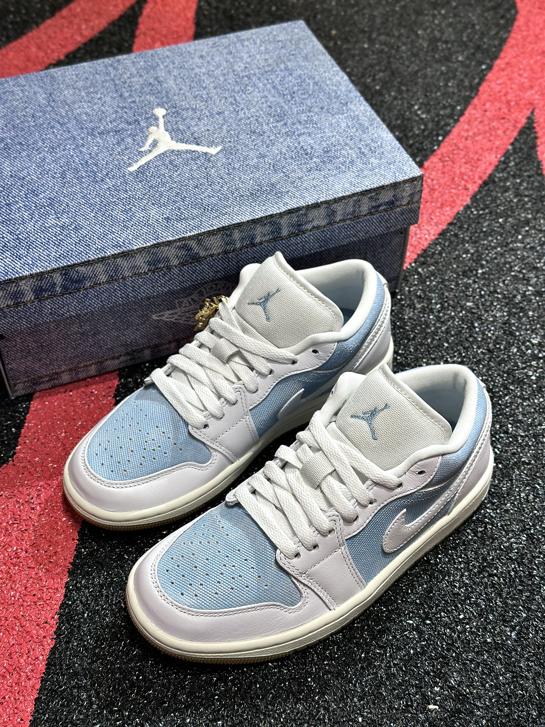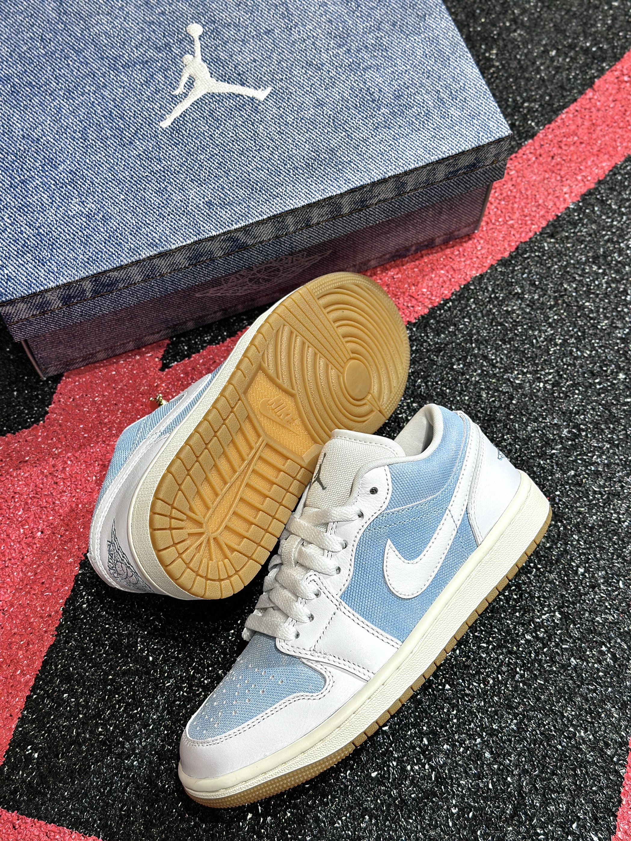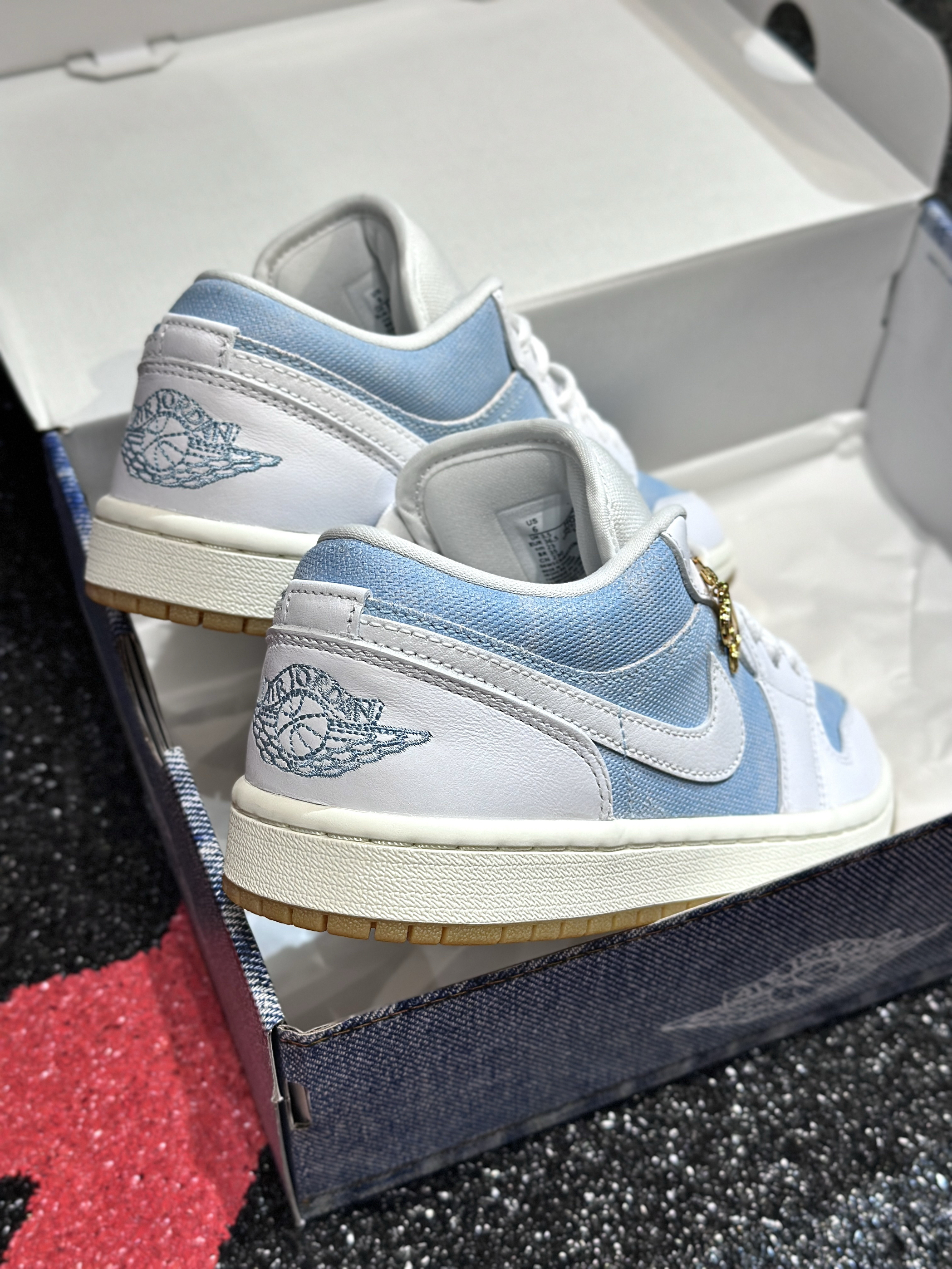 Jordan又来丹宁牛仔,这次可以称得上2.0! 开箱给的仪式很足,特殊牛仔印花鞋盒,实物质感不错的,白蓝色丹宁牛仔拼接设计,可盐可甜! 穿起来的脚感和正常的aj1一样,搭配起来的风格就更加多样啦~