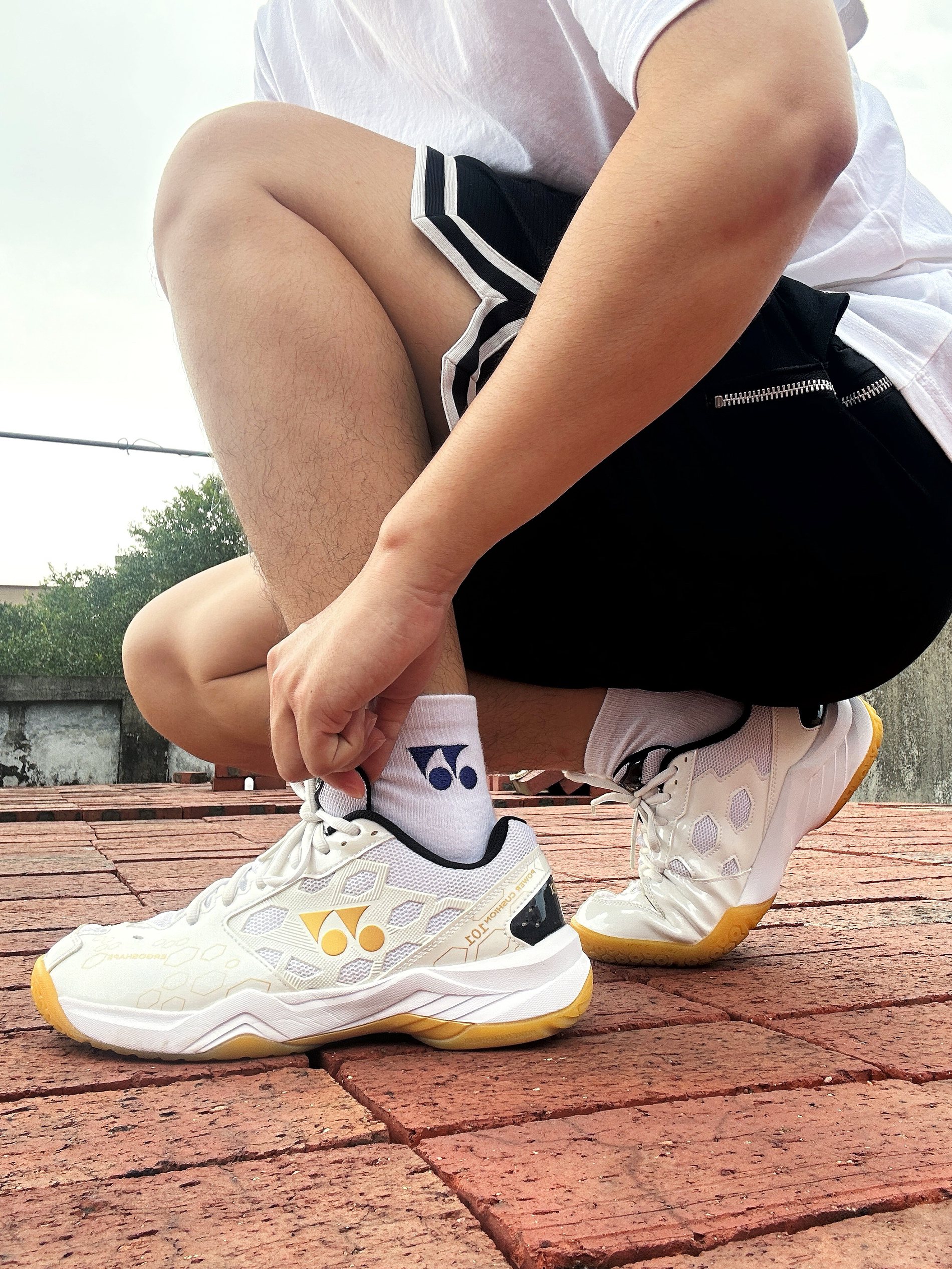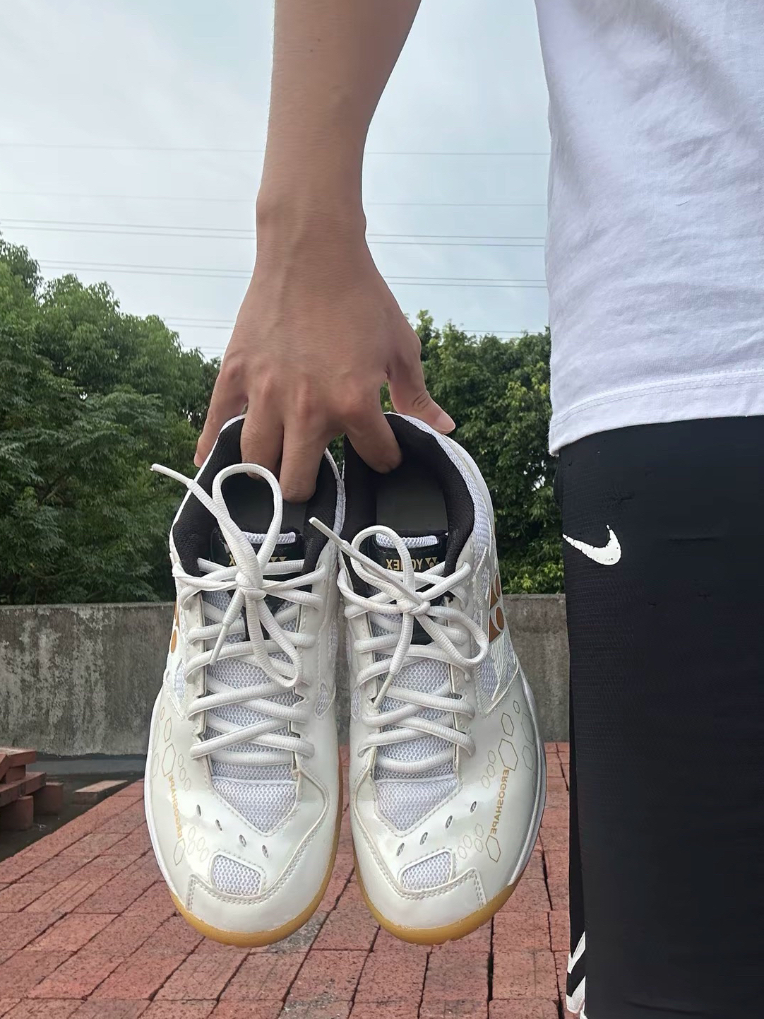 今天给大家推荐一双 YONEX 家的羽毛球鞋👟 这双鞋子是我大学那会入手的 朋友叫去打羽毛球的时候 是我必穿的 它是我羽毛球鞋里面的“宠儿”✨ - 这双鞋上脚很轻盈 没有笨重感 颜值很高 白/金配色 简单又高级 搭配 YONEX 家的毛巾底🧦 鞋子包裹性很强 能很好的保护我们的脚腕 鞋面网格设计 高强度的对抗 也能很透气 鞋底窝蜂巢纹理 抓力更强 移动过程中不易滑倒