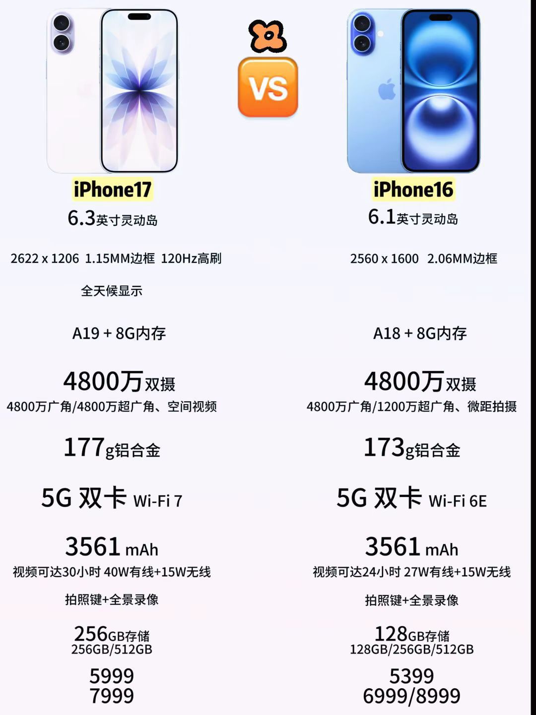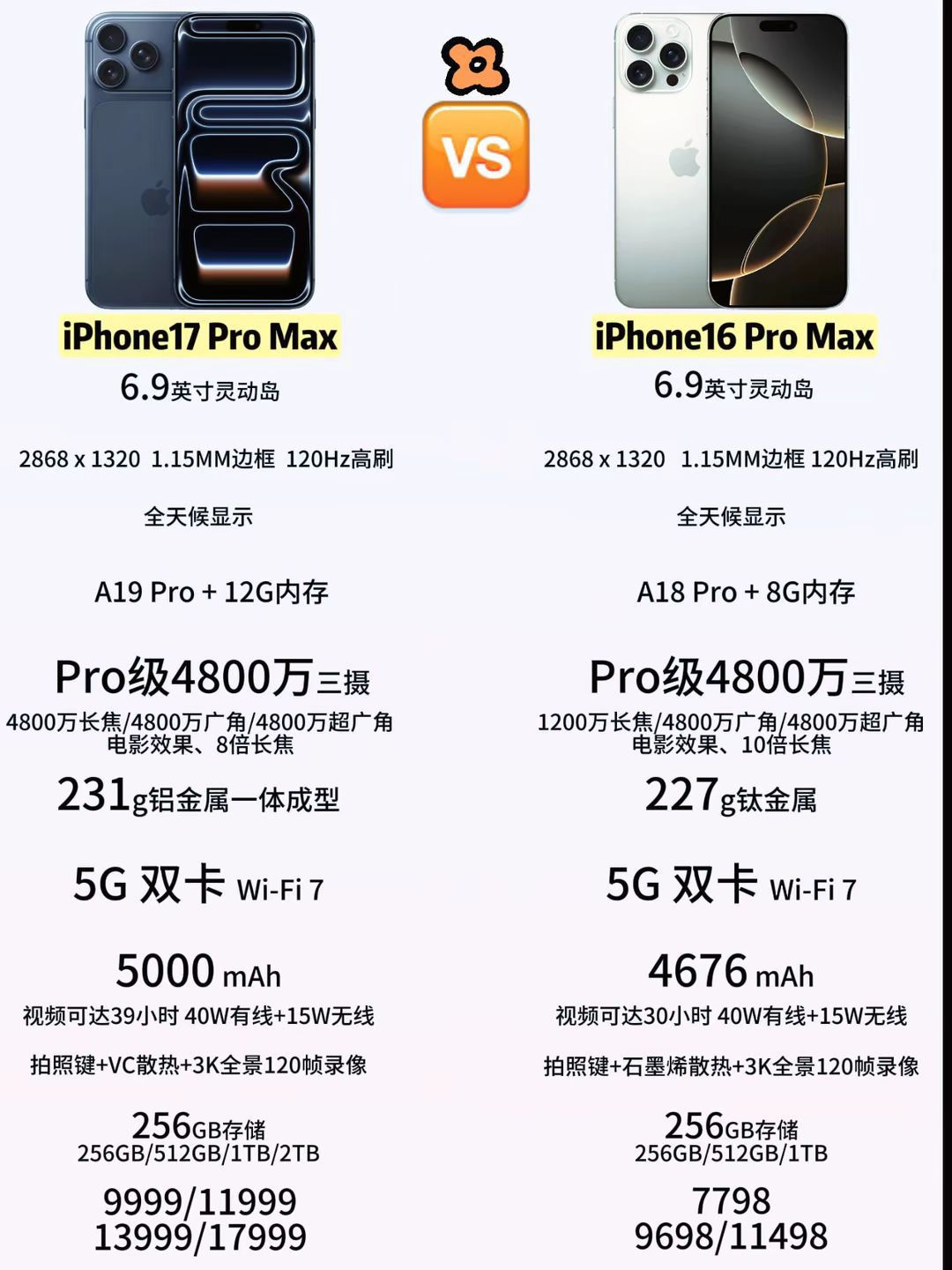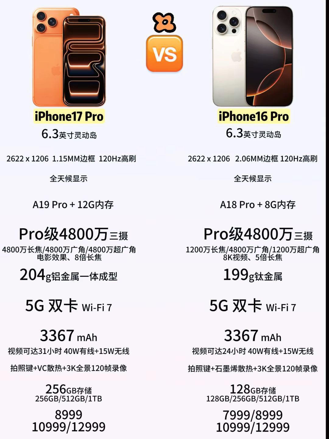 这次iPhone 17系列明显的升级点是:标准版屏幕终于支持120Hz刷新率,全系电池更大,也终于取消128GB的存储容量。 下面是详细的对比 🌟处理器: 除了基础款之外都升级到了A19 Pro,运行内存也增大了,对于影像处理,AI运算能力,游戏的帧率稳定性全都有了提升 🌟材质: Pro/Pro Max放弃钛金属,重新采用铝金属机身,官方解释称为了配合新的散热设计,但从工艺角度推测,铝金属更易一体...