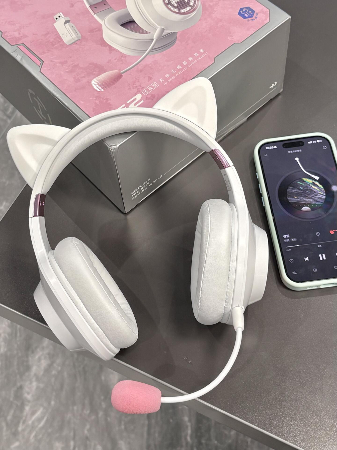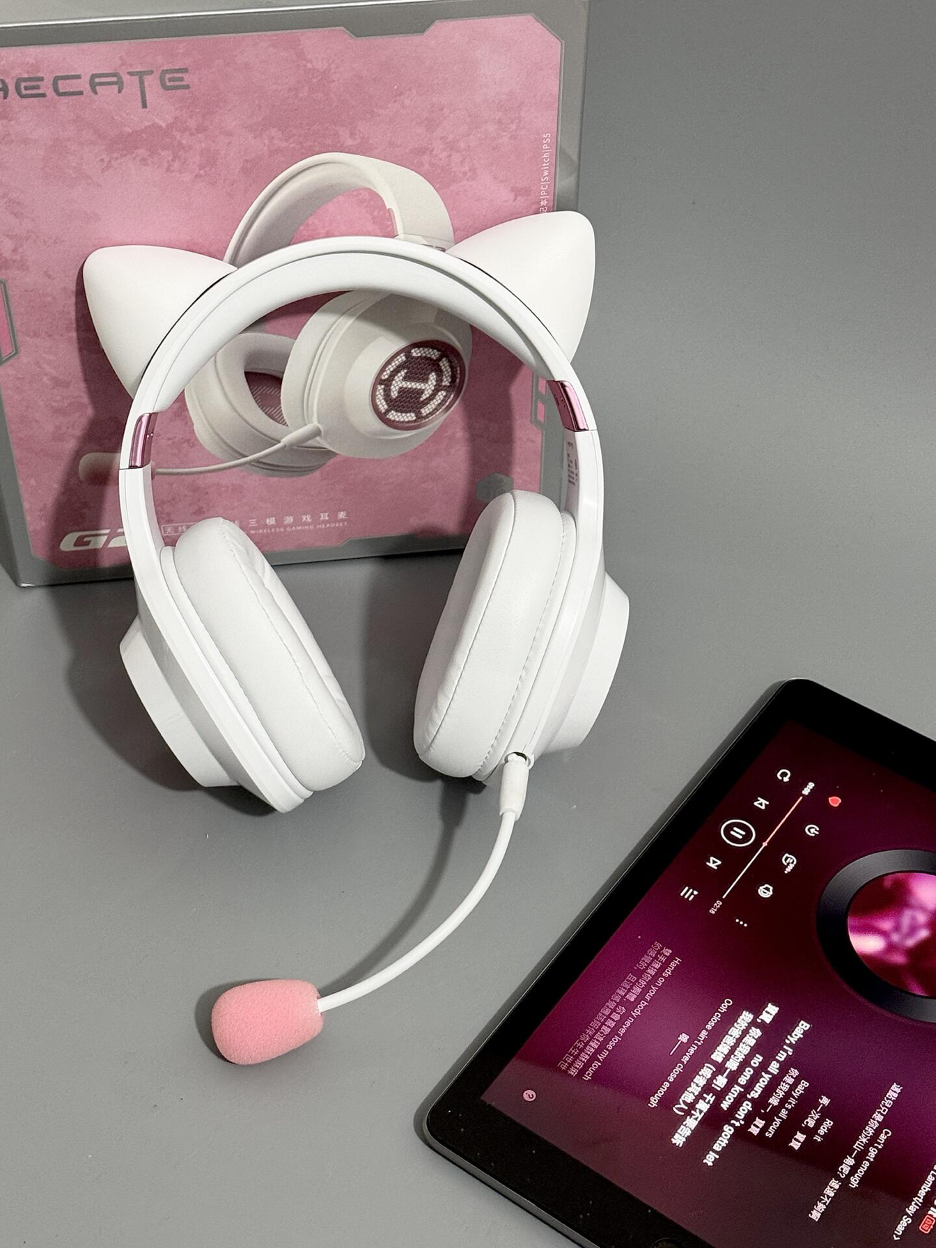 嘿嘿 爱打游戏的我装备也得跟上啊 选了漫步者家的粉白配色电竞耳机 这属实是满足了我的少女心 还有猫耳朵配饰 好可爱啊 开机自带氛围灯 仪式感妥妥的 麦克风也做了个粉色 太懂女孩子了叭 耳罩软软的佩戴着挺舒适的 主要是音质也好 打游戏听脚步或者听歌都ok的 还是精致的礼盒包装送人自用都有排面啊