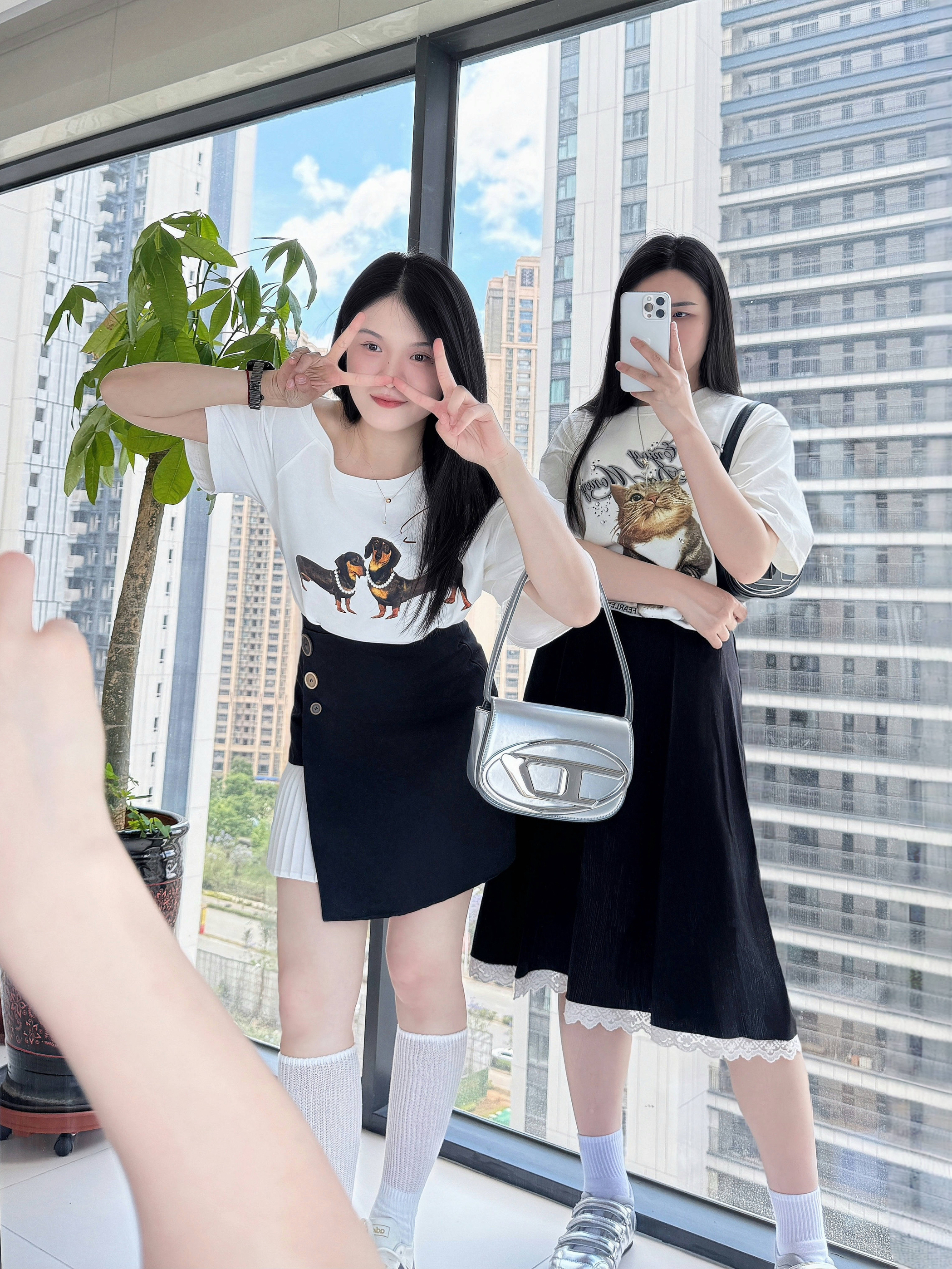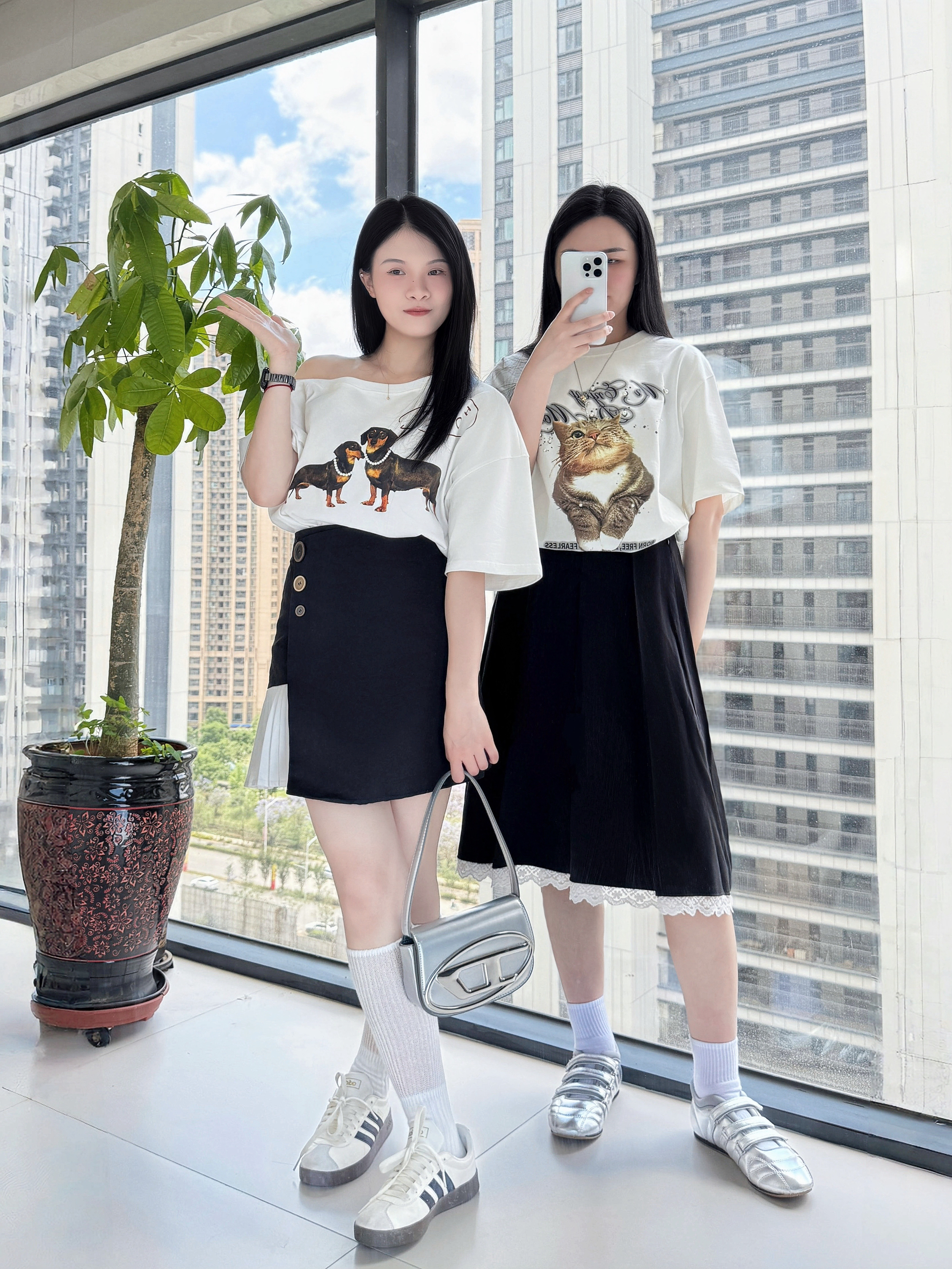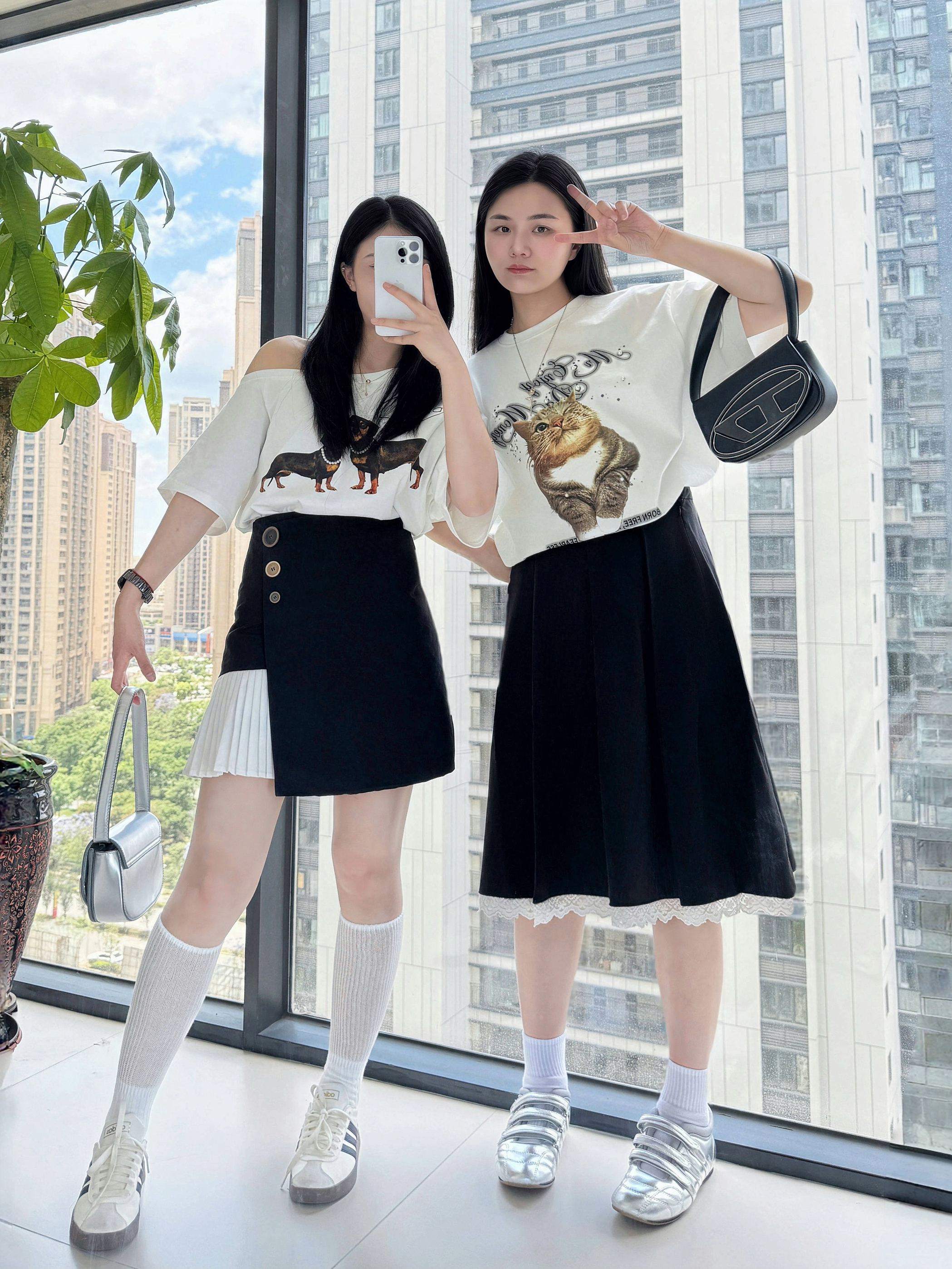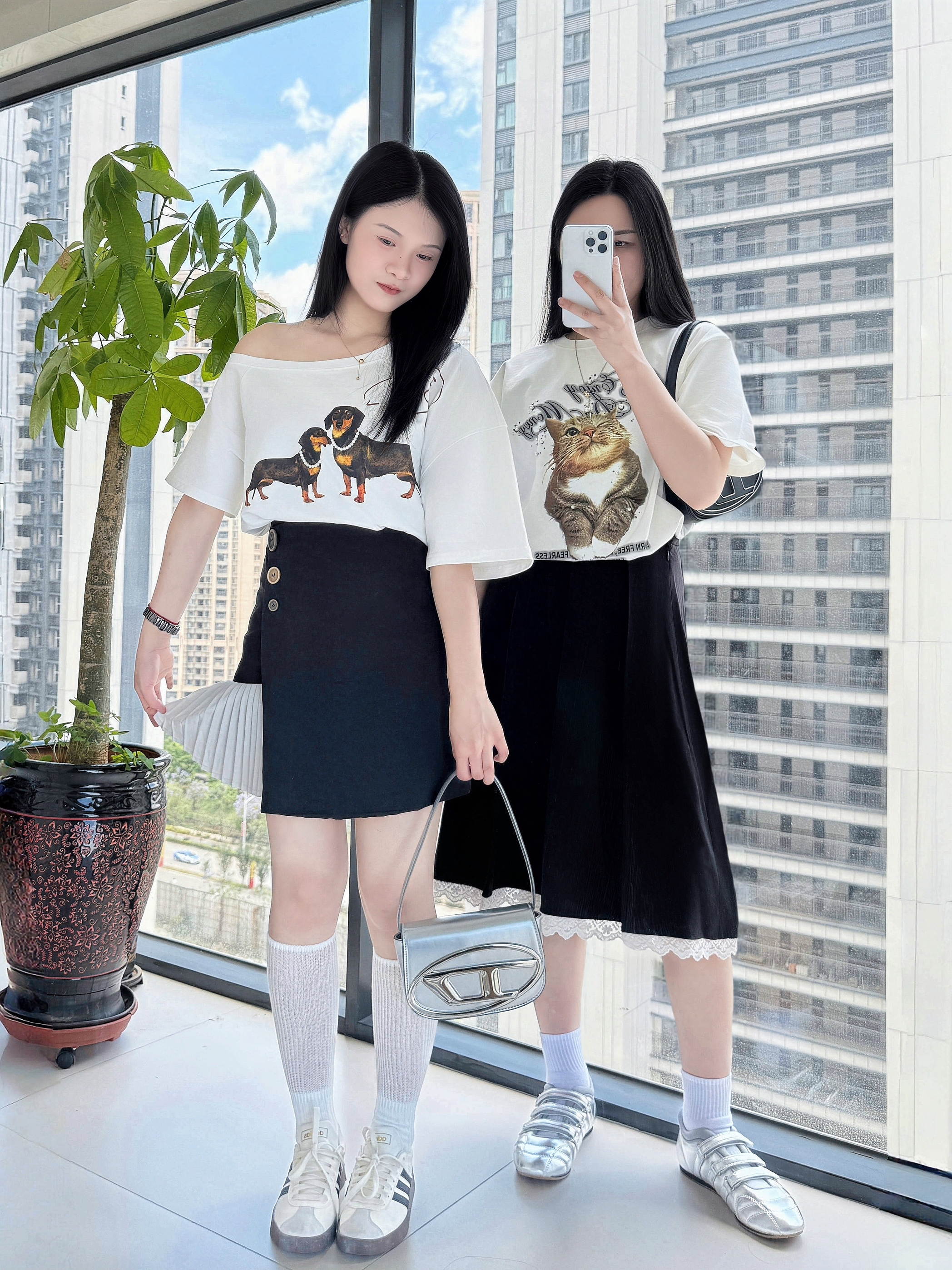 👚:今年夏天流行的斜肩腊肠狗 宽容的猫咪短袖T🐈 👗:黑色百褶裙 黑色花边裙 👟:阿迪达斯得训鞋 Deinet银色单鞋 💼:炫酷小巧的叮当包 银色高级又好看 黑色百搭时尚 同时拥有的快乐🎉 抓住夏日的尾巴,狠狠穿起小裙子吧