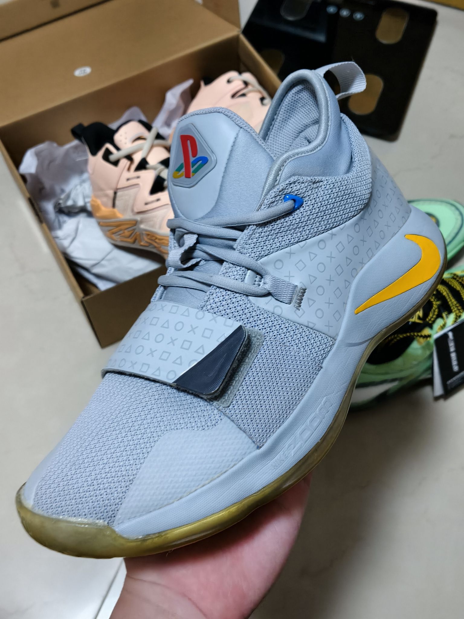 清理时刻!周末宅家整理鞋柜 前段时间拿去清洗回来的PG2.5,一眨眼都是七年前的老球鞋了[石化_blue]水晶底已经成烟熏底了,成色保留的还不错 清洗的时候不知道经历了什么,后跟PG的全名胶贴被弄没了[裂开_blue]送去前两只脚还能亮,送去之后只剩下一只了[裂开_blue][裂开_blue]只能安慰自己至少还有一只能亮[叹气_blue]小时候喜欢玩PS系列的我真的很喜欢的一双鞋 还扫出个270...