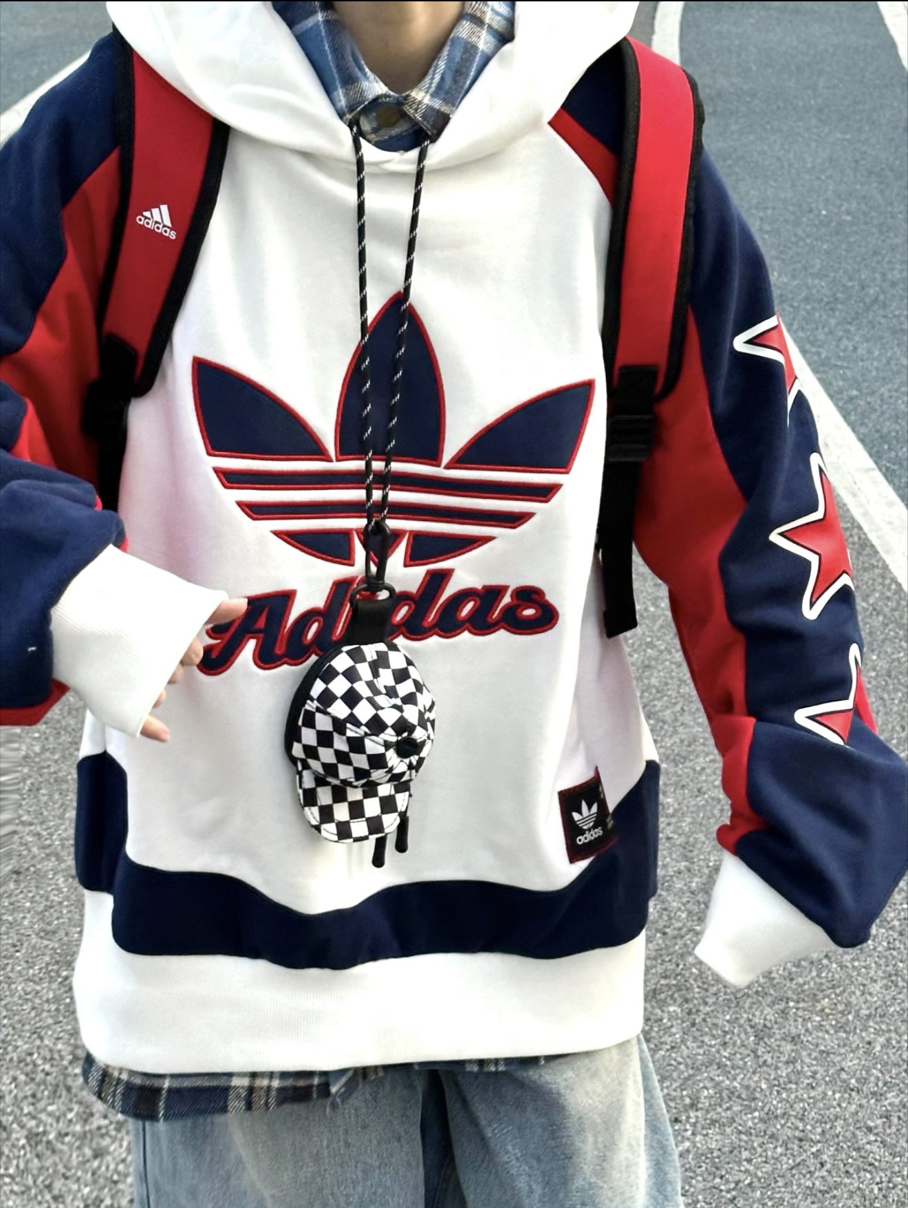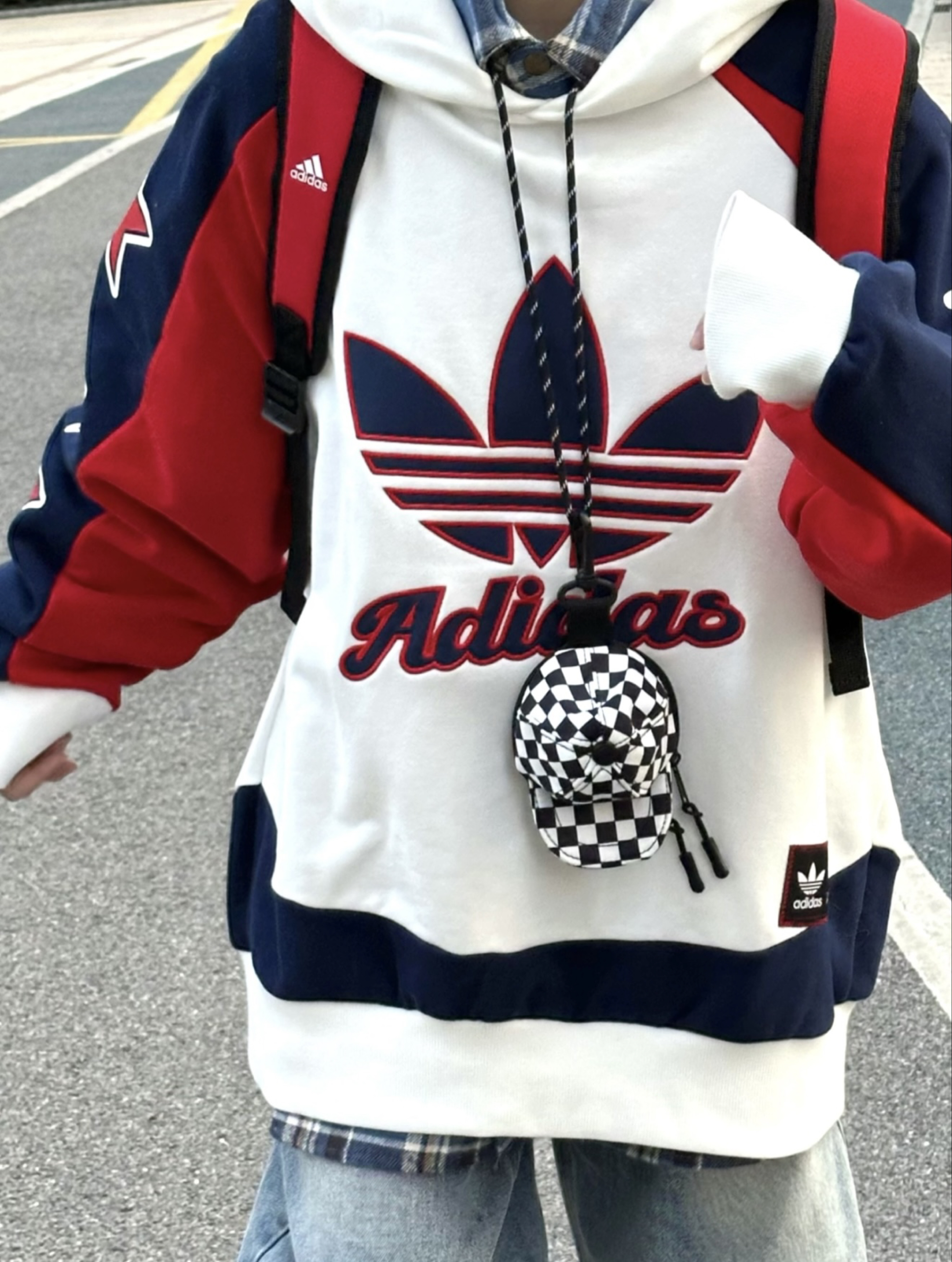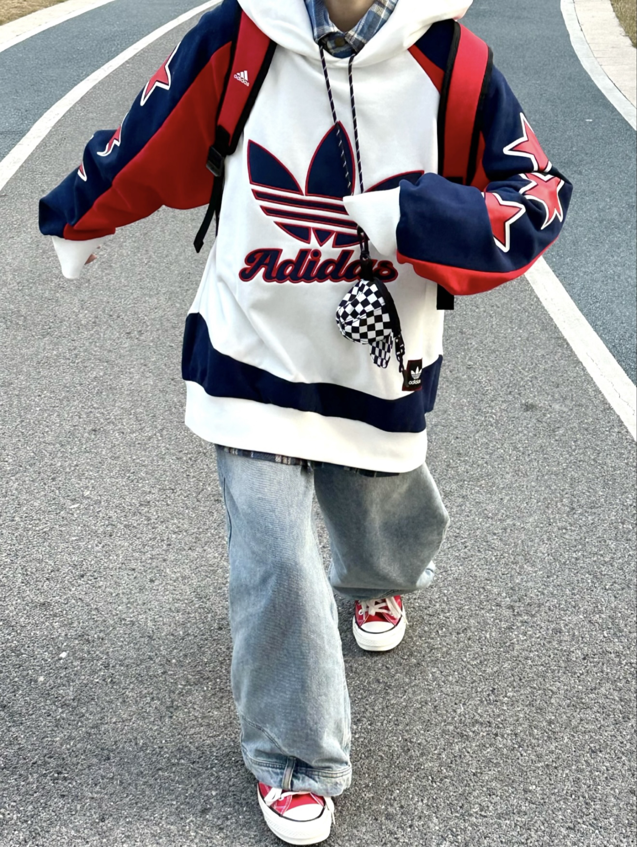 蓝红拼接的adidas Oroginals连帽卫衣蛮帅滴嘛~ 配上水洗宽松牛仔裤和红色匡威帆布鞋,是不是搭出了英伦学院风,满满年少气息,重返18了吗嘿嘿😁 #卫衣搭出秋日范儿#识货萌新创作营