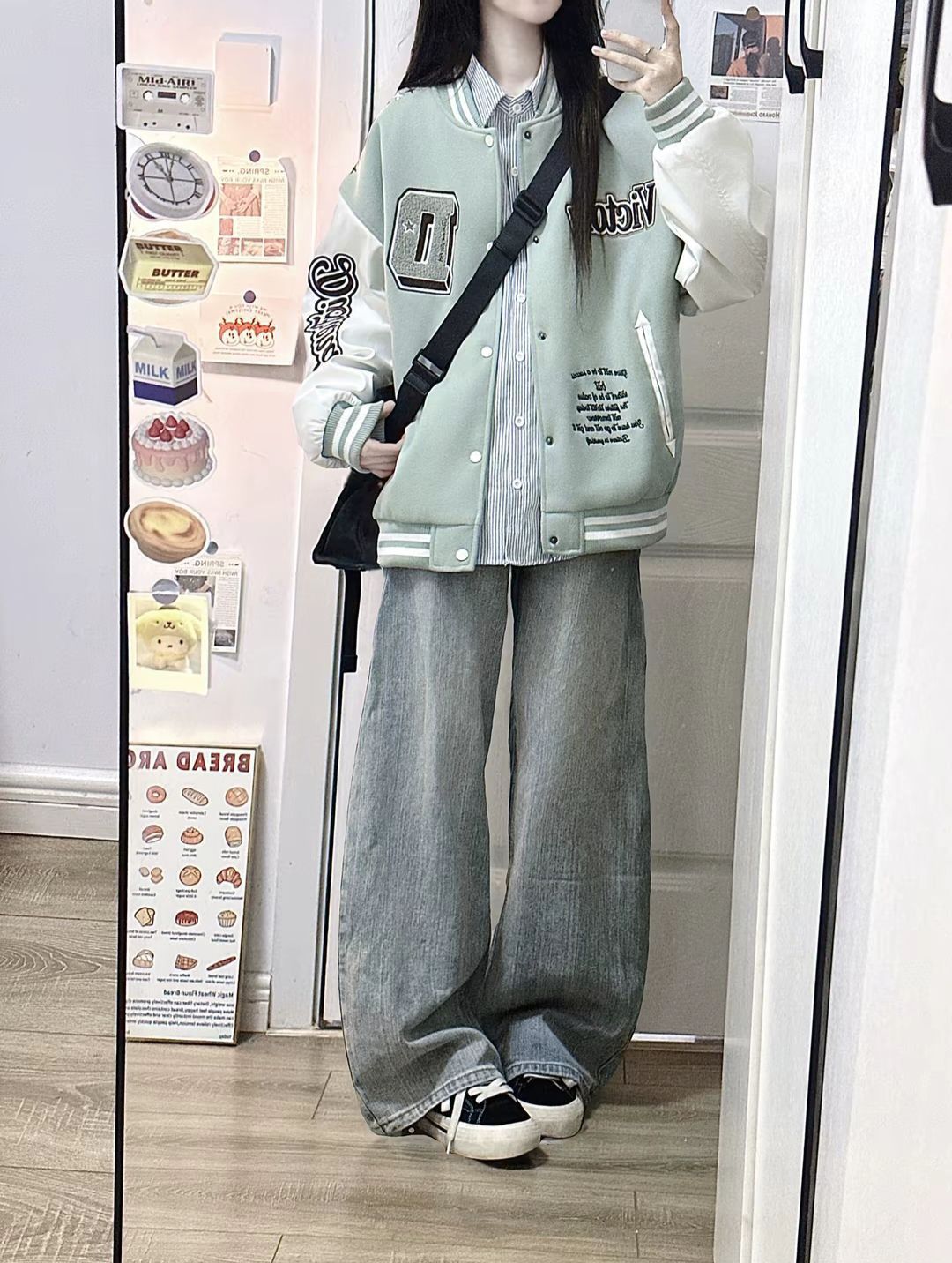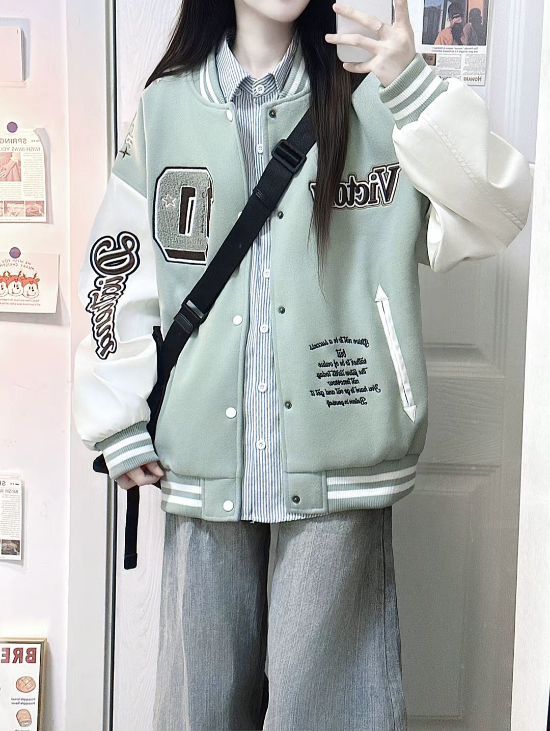 薄荷绿美式棒球服➕衬衫叠穿真的干干净净就很帅!!