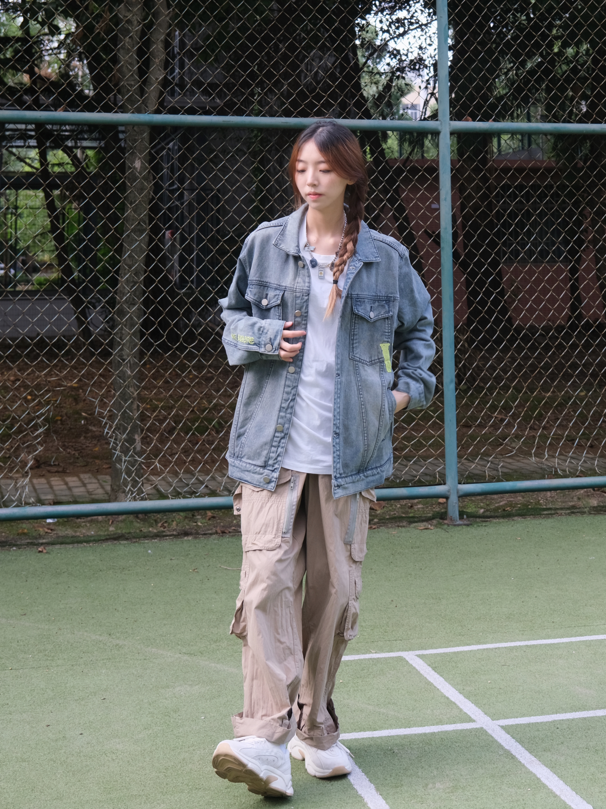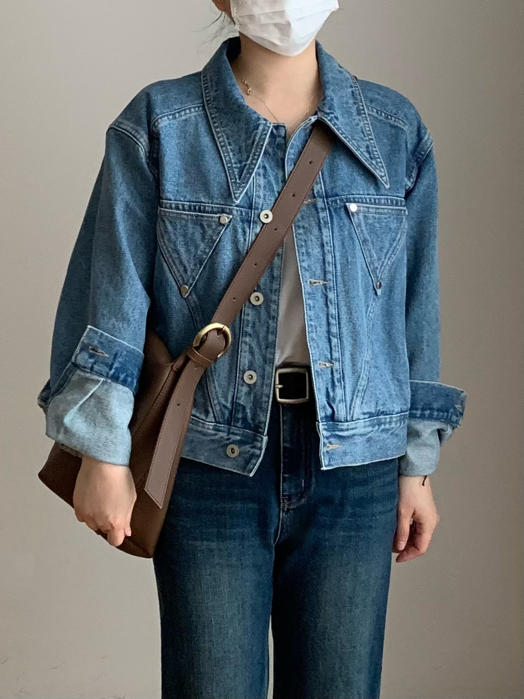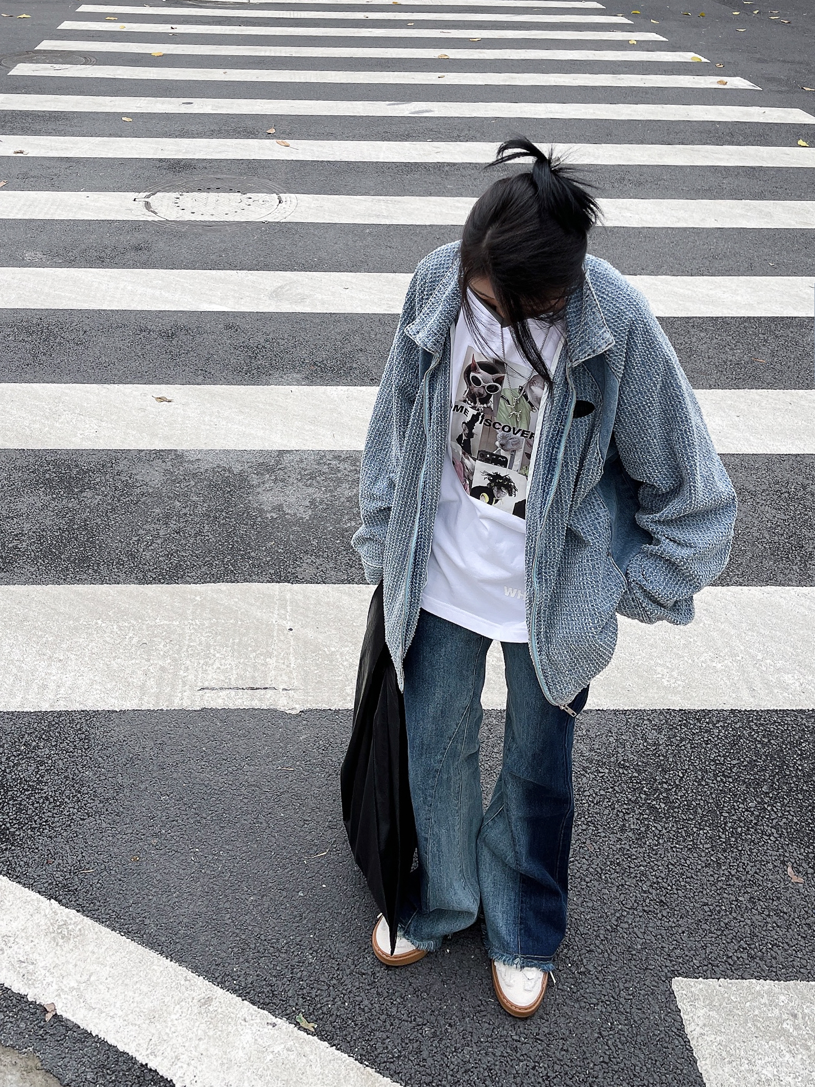 分享今天的搭配小思路 今天的ootd是牛仔衣搭配弯刀休闲裤 牛仔衣不用多说刚好适合这个季节 亮点在于我的下半身搭配 用它做了一个廓形穿搭 在视觉上可以起到一个上窄下宽的效果 整体上看起来更有层次感和造型感 十分挺括但又不至于泰硬 所以穿起来还是蛮舒服的 今天的街头氛围感你get到了吗