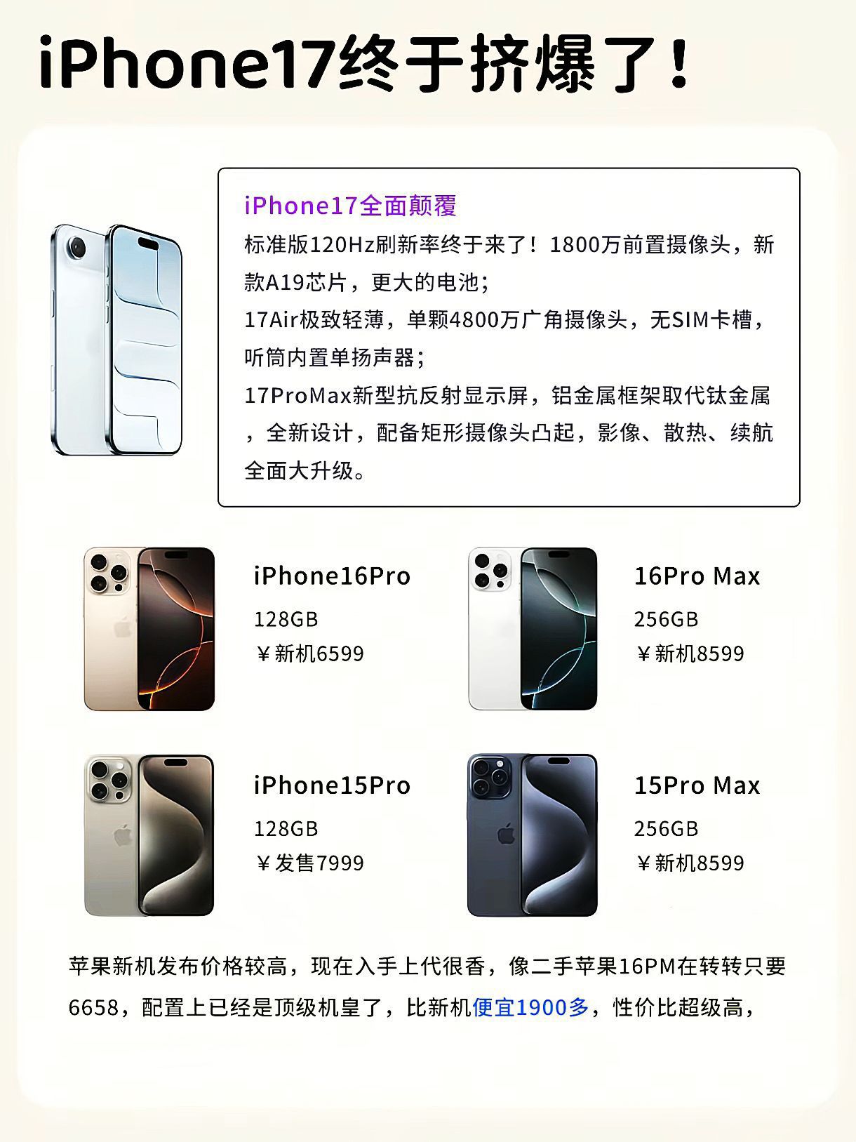 🔥 这次连标准版都上了120Hz高刷!全系OLED屏+全天候显示,终于不挤牙膏了~ 但…Air版只有2900mAh电池?续航党建议直接Pro起步❗ Pro和Max直接256G起跳,长焦、8K录制、散热全升级,性价比居然有点香? 🎨 颜色也超顶:夏日橙、冰羽白、深空蓝、经典银…你pick哪个?