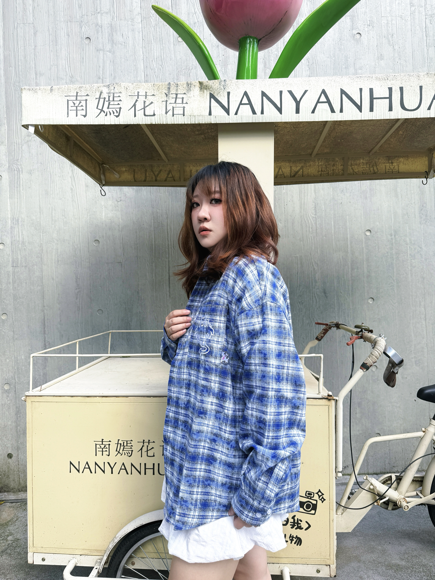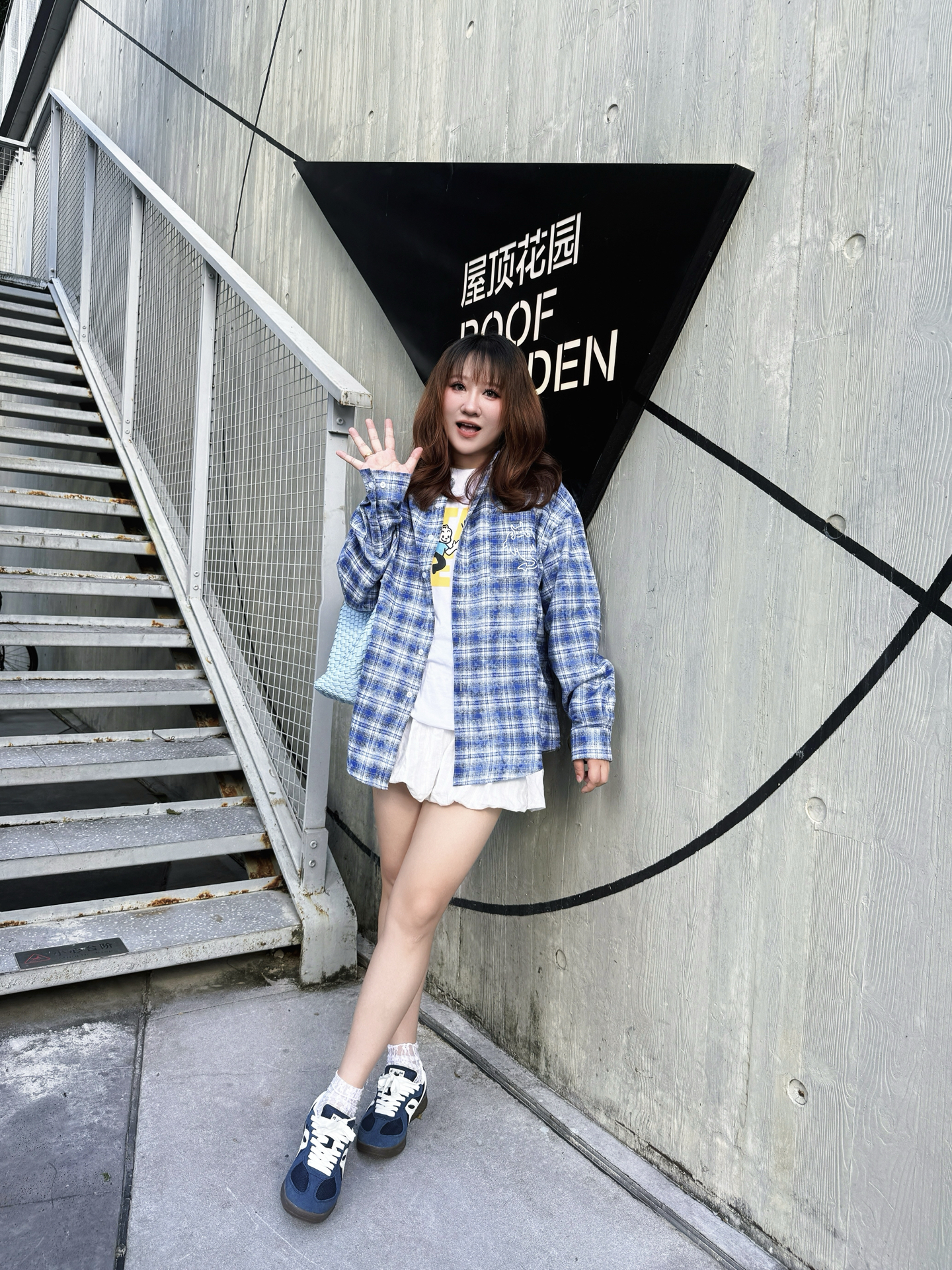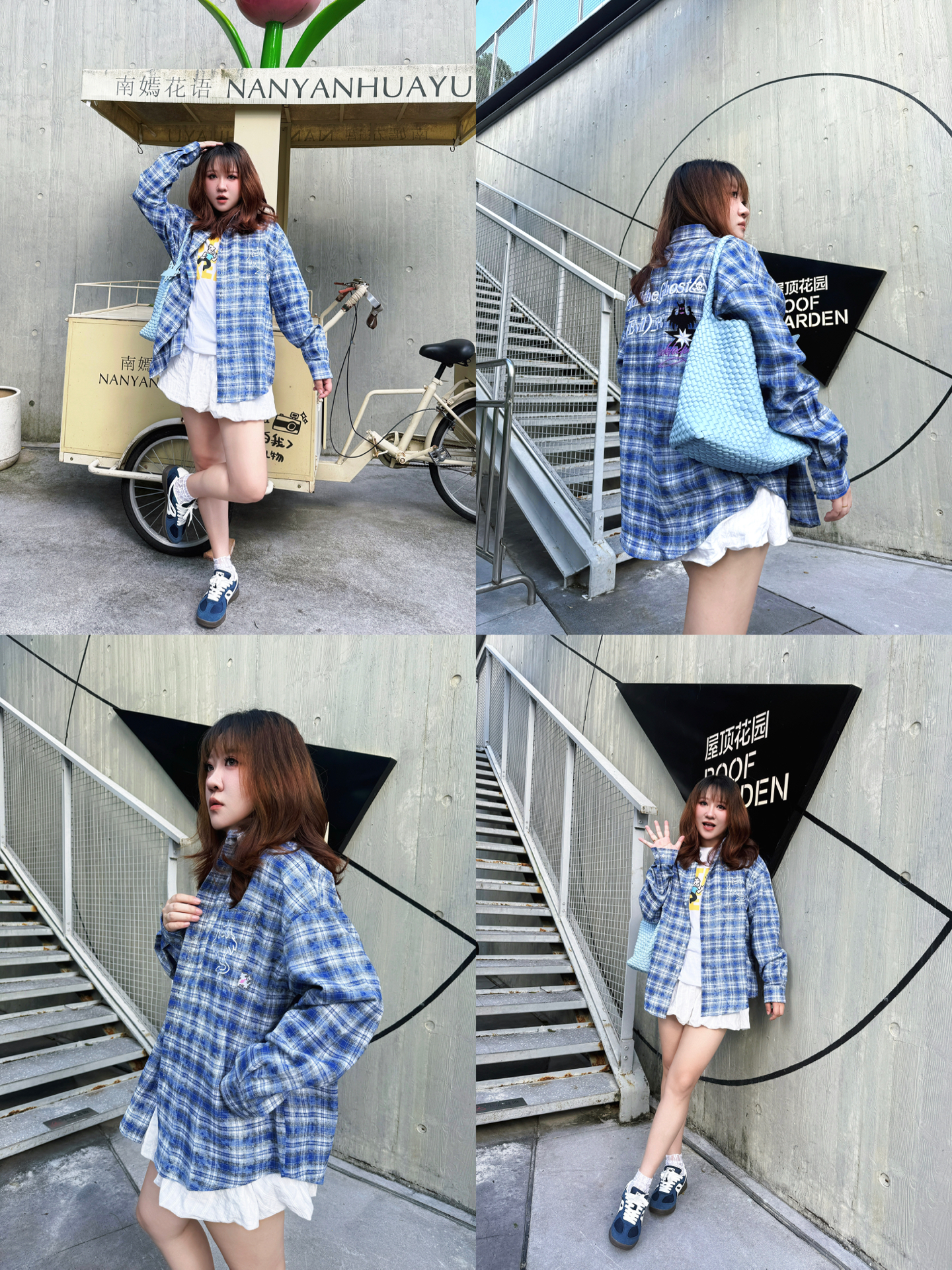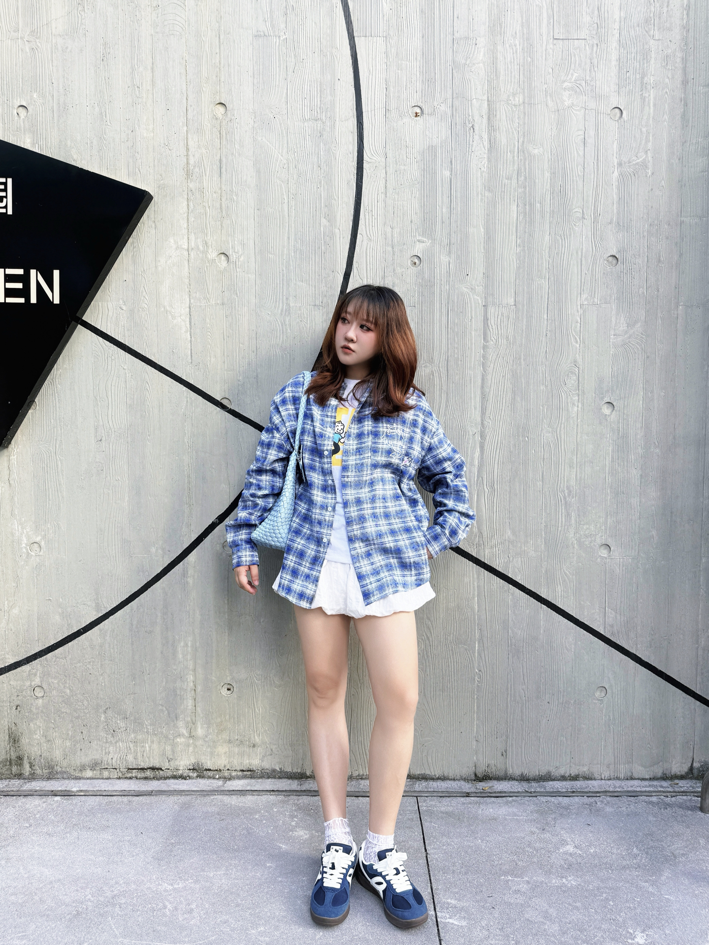 穿了件做旧晕染蓝格衬衫👕——幽灵刺绣藏在身后 内搭白短袖露小边~白高腰短裙拉腿长 配深蓝德训鞋+浅蓝编织包👜 蓝白撞在工业灰墙前超温柔! 个人觉得妙在衬衫的晕染 像把秋阳揉进布纹里~ #我的格纹时髦经 #我的出游穿搭护照 #国庆出游皮肤一键换 #秋天Cozyfit怎么穿 #时髦书呆子的穿搭手册