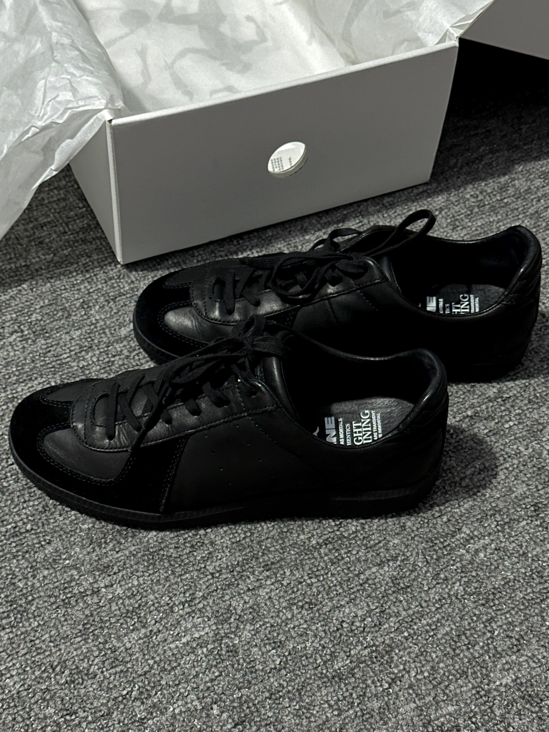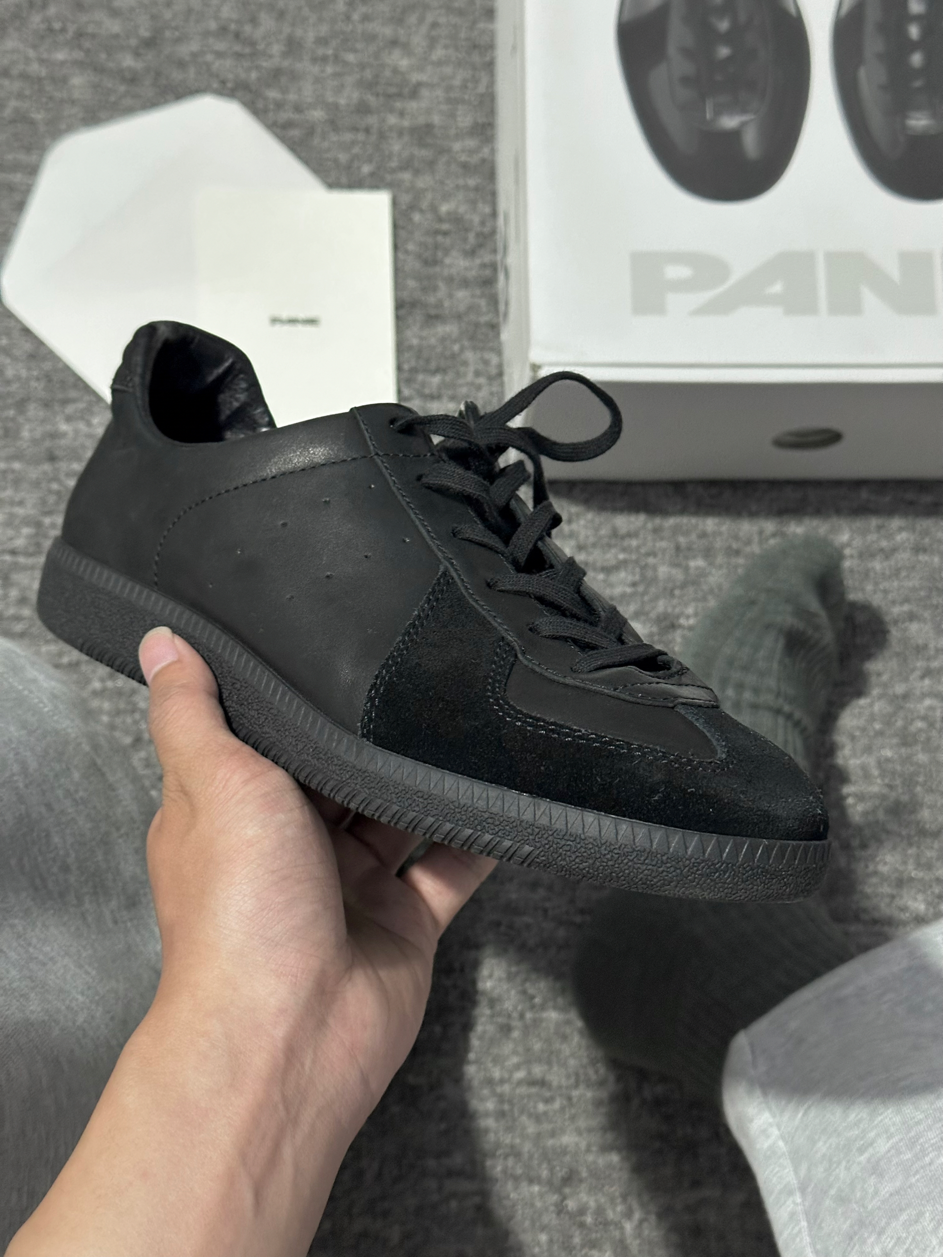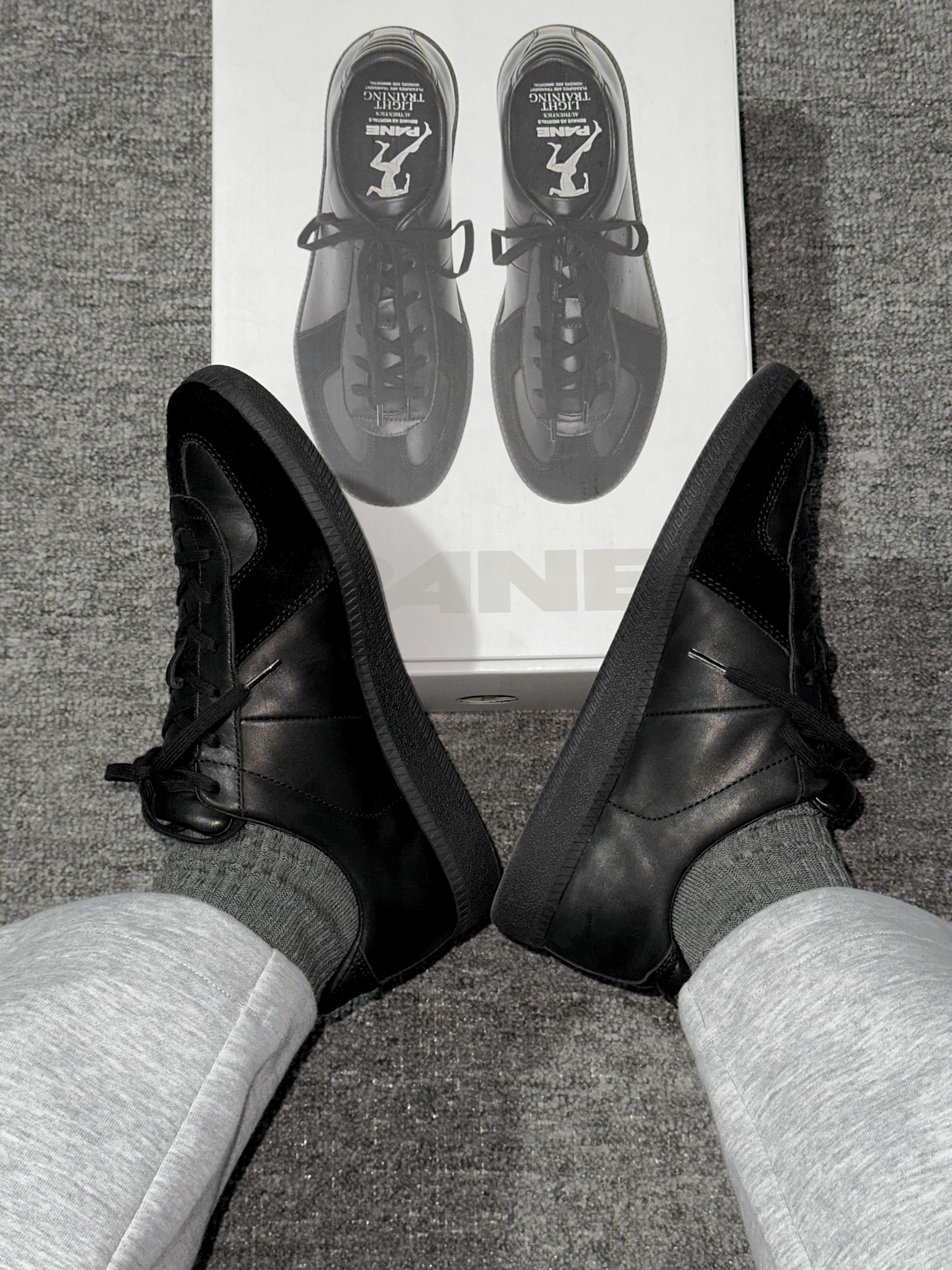 又入手了一双PANE这双德训鞋, 感觉挺不错。黑色外观简约百搭,上脚显脚瘦,皮革和翻毛皮拼接很有质感。 先说优点鞋垫软且有支撑,走路不累,包裹性好,系紧鞋带脚很安稳。搭配牛仔裤、工装裤都休闲又时尚,耐脏这点也很适合懒人。 小小缺点就是刚穿时脚背有点硬, 穿一阵就好了。总体颜值、舒适度和搭配性都在线,想找百搭舒适鞋子的朋友可以考虑。