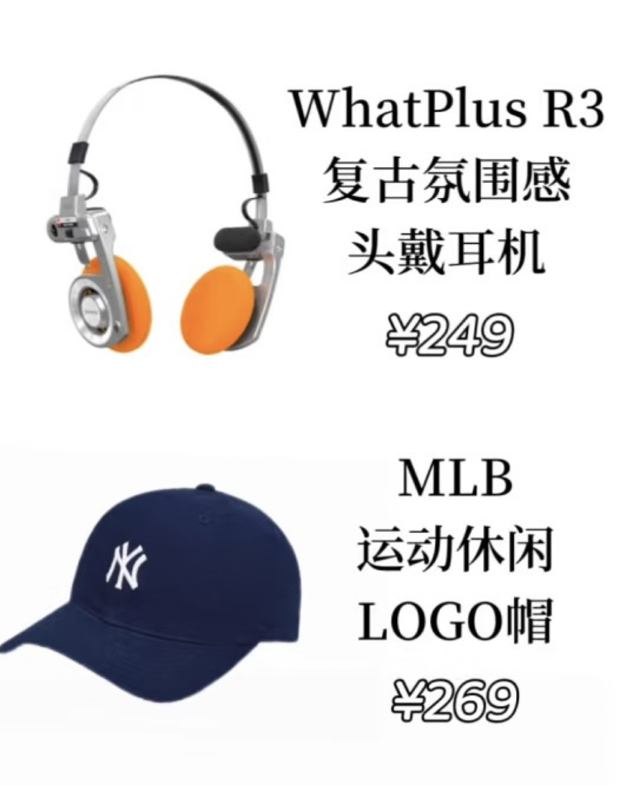 WhatPlus R3复古氛围感头戴耳机 当复古美学邂逅声学艺术,WhatPlus R3头戴耳机以金属质感框架与复古橘耳罩,打造出独树一帜的商务腔调。每一次佩戴,都是一场穿越时空的听觉盛宴,让你在潮流与质感间轻松拿捏高级氛围感。 MLB运动休闲LOGO帽 MLB运动休闲LOGO帽,以经典NY标识诠释运动风。藏蓝主调搭配精致刺绣,简约却极具辨识度,无论是搭配休闲装还是轻商务风,都能瞬间提升造型...