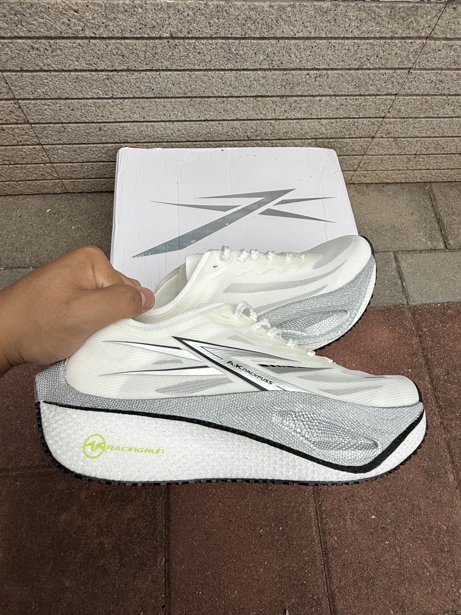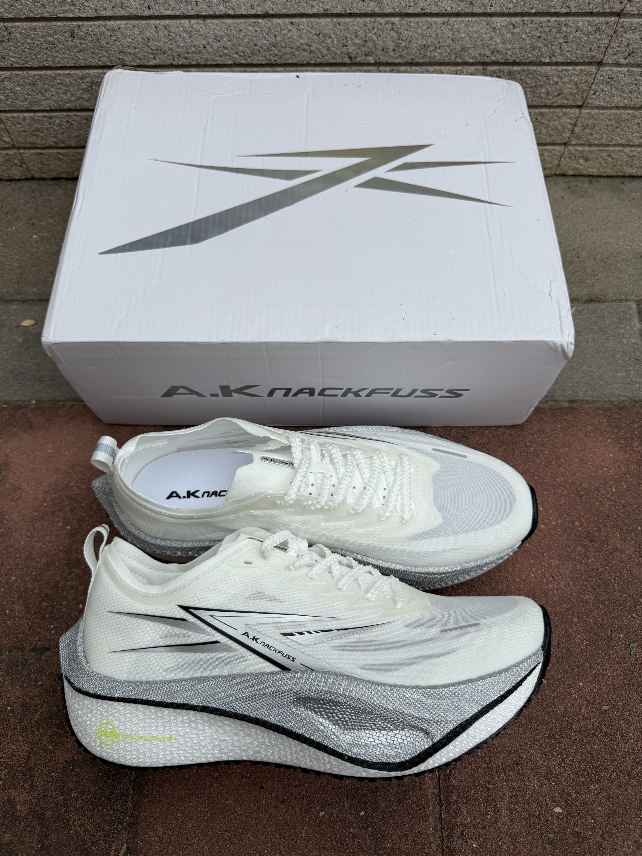被这双A.K NACKFUSS跑鞋的颜值和性能惊艳到了!白灰配色高级又有运动感~ - 设计亮点:流线型的鞋身很有速度感,白灰拼接加上细节处的荧光绿点缀,潮流感拉满,日常跑步或者搭配运动装出街都很吸睛。 - 穿着体验:网面材质透气性绝了,跑步时脚感很轻盈,鞋底的回弹和支撑都很到位,跑长距离也不会觉得累。 跑步爱好者真的可以冲,这双鞋不管是颜值还是性能都很能打!