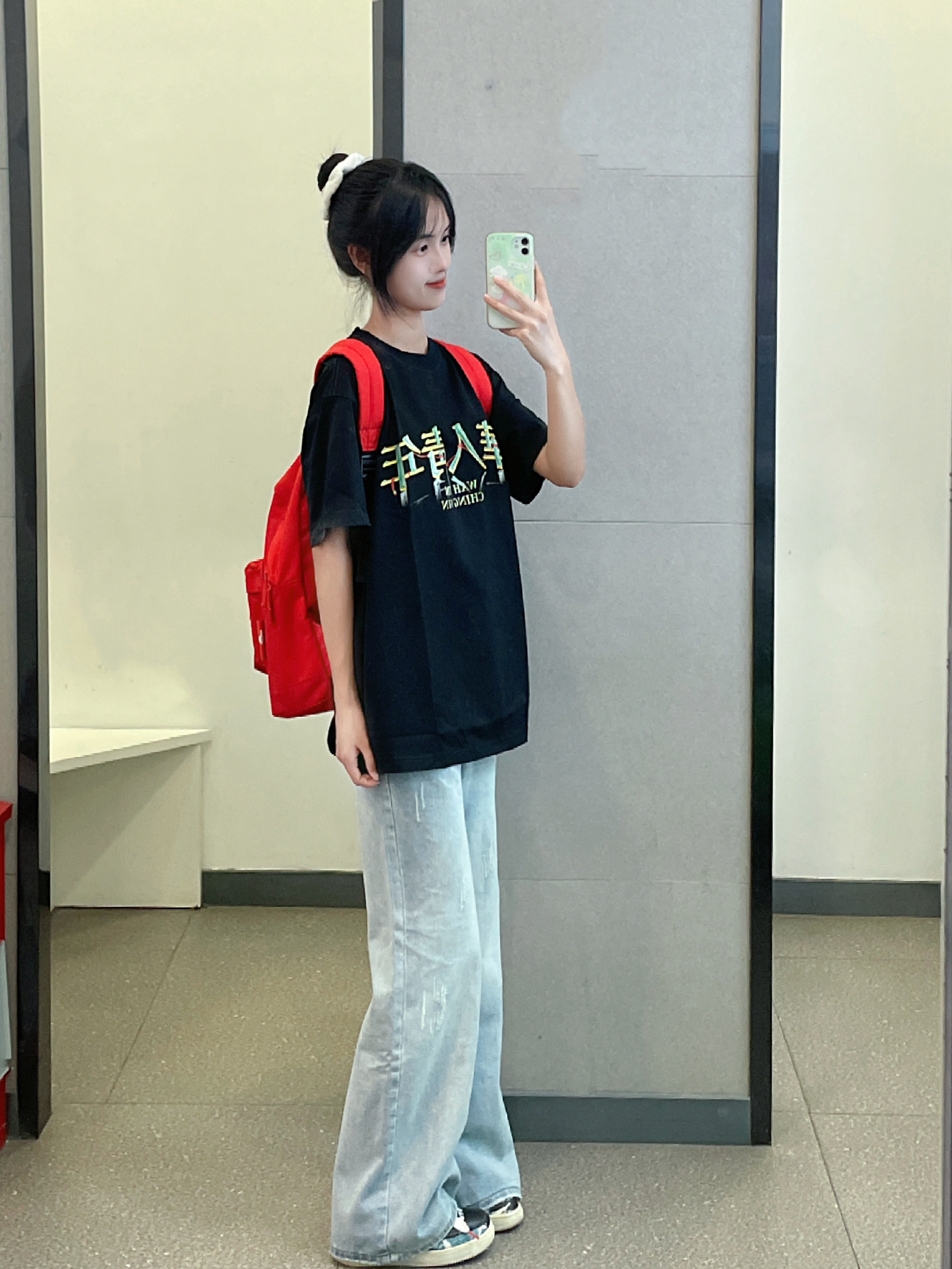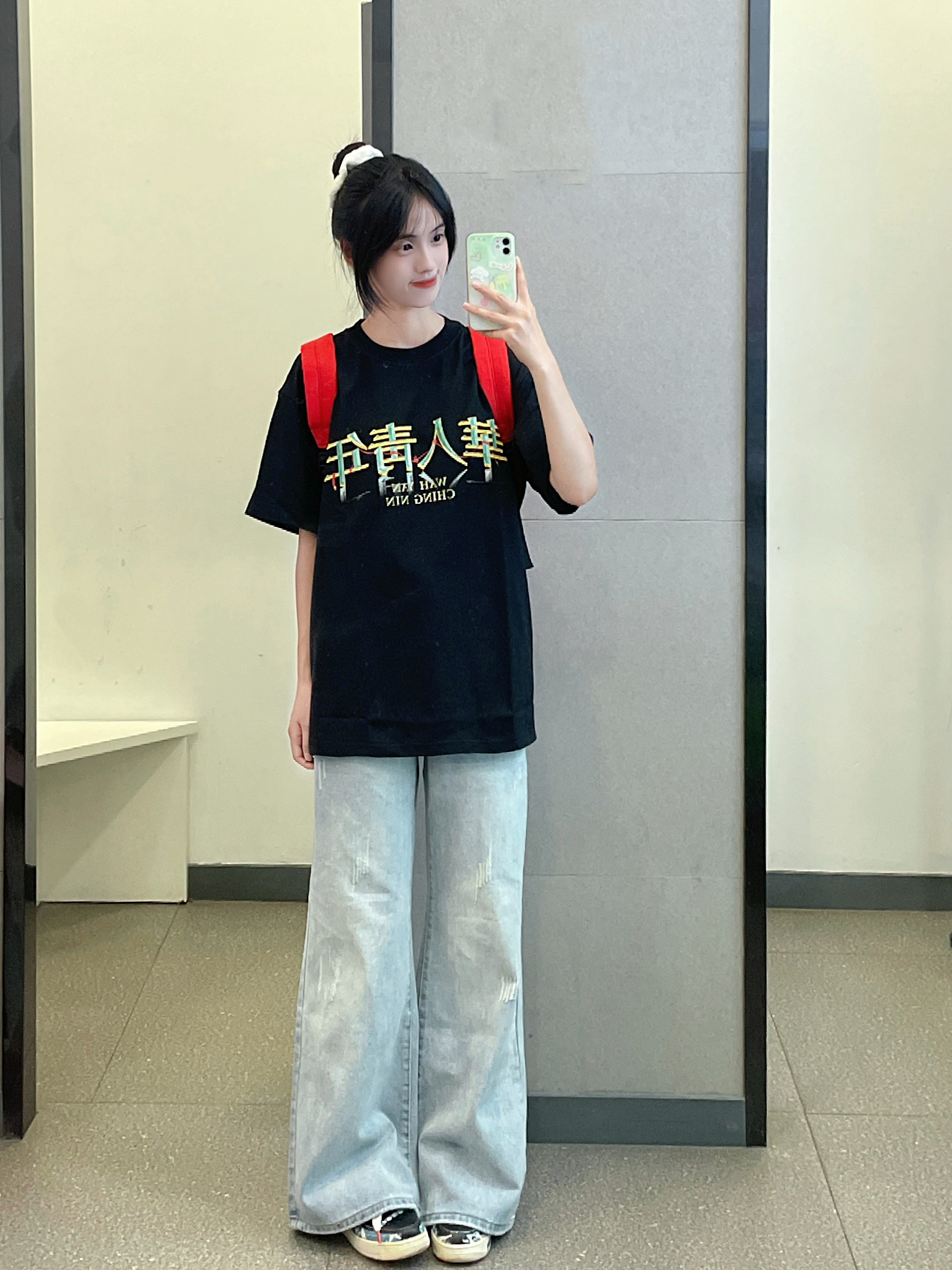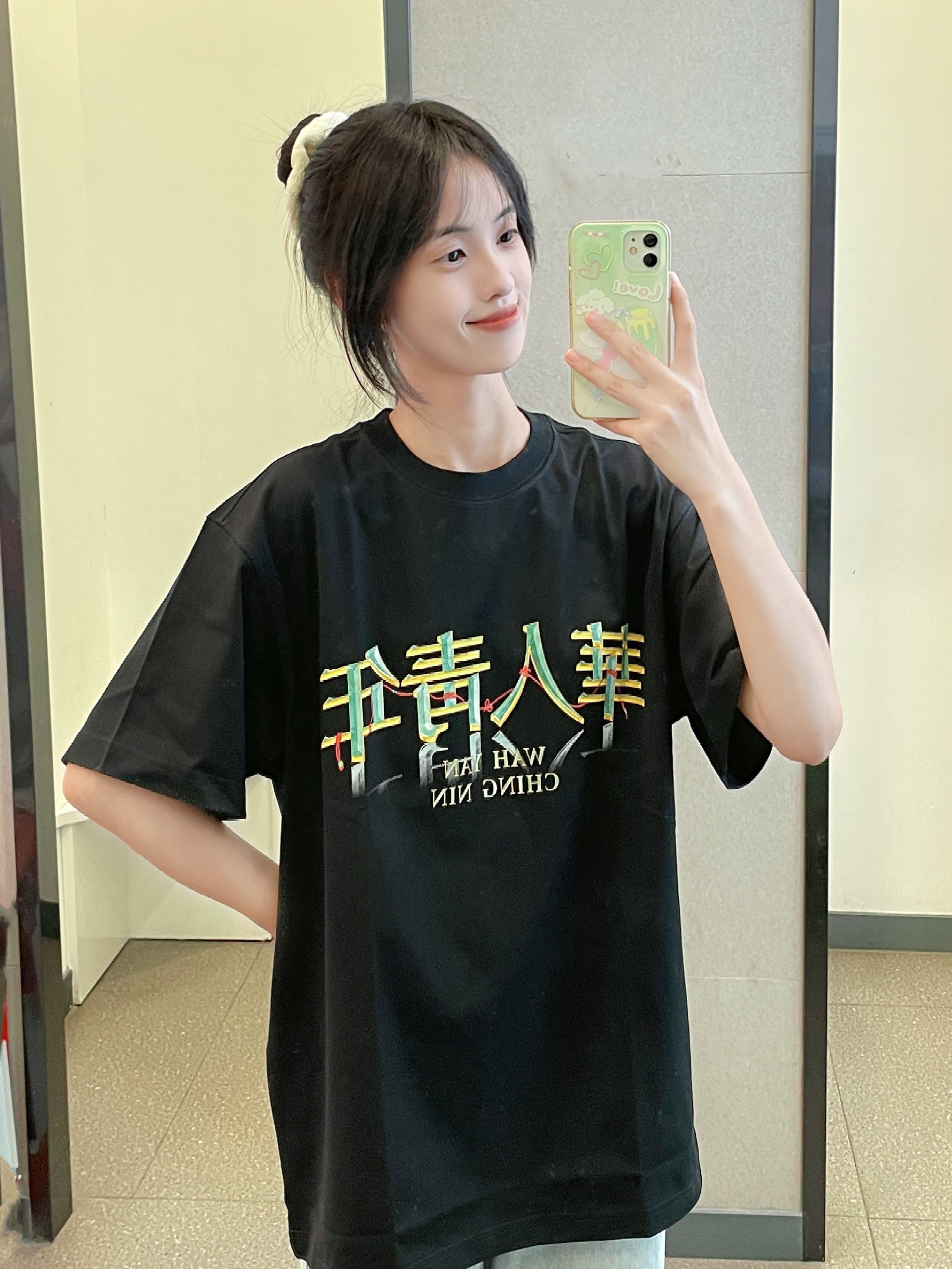 黑色夏天穿也好适合呀 华人青年这个黑T可百搭 简易的文字印花 很有特色的设计嘿嘿 T恤面料舒服 也不显黑 学生党好适合!