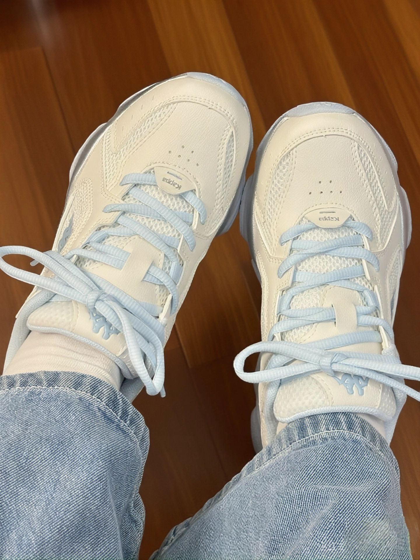 刚收到这双Kappa老爹鞋就迫不及待开箱上脚,分享点掏心窝的感受👇 脚感&质量 网面材质透气绝了,暴走一下午脚丫子还能自由“呼吸”~鞋底看着厚实,踩上去是软弹的,,对久站、走路多的人很友好,减震效果拉满✨ 优缺点唠唠 ✅ 颜值能打:奶白+浅蓝配色清新又百搭,搭短裤、裙装都很绝,出街回头率超高,已经被朋友追着问链接~ ✅ 性价比炸裂:同价位老爹鞋里,脚感和质量都能打,学生党、打工人闭眼入不心...