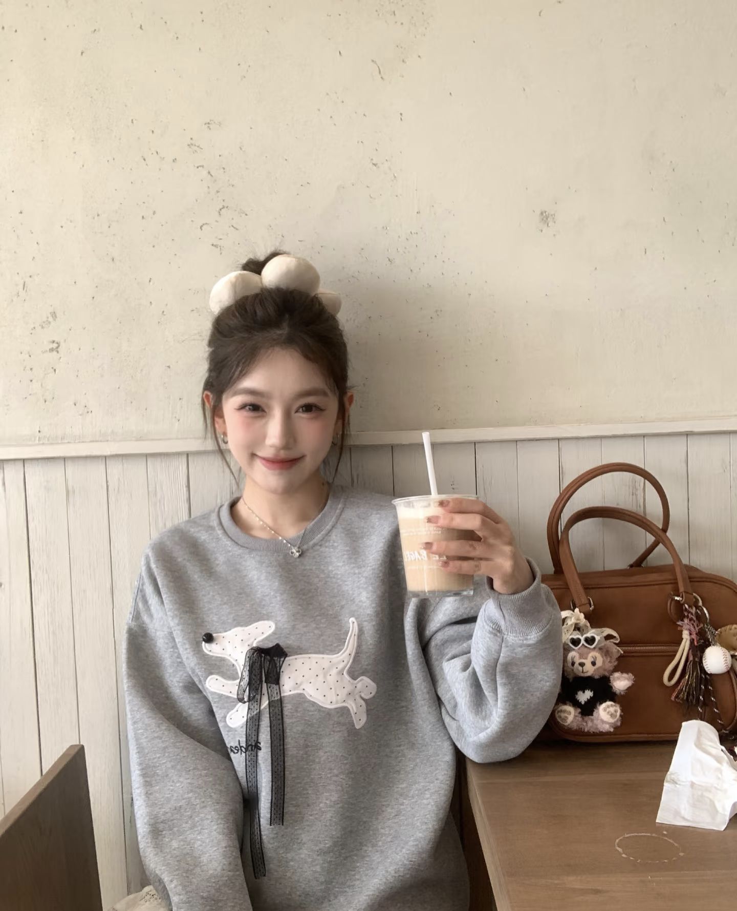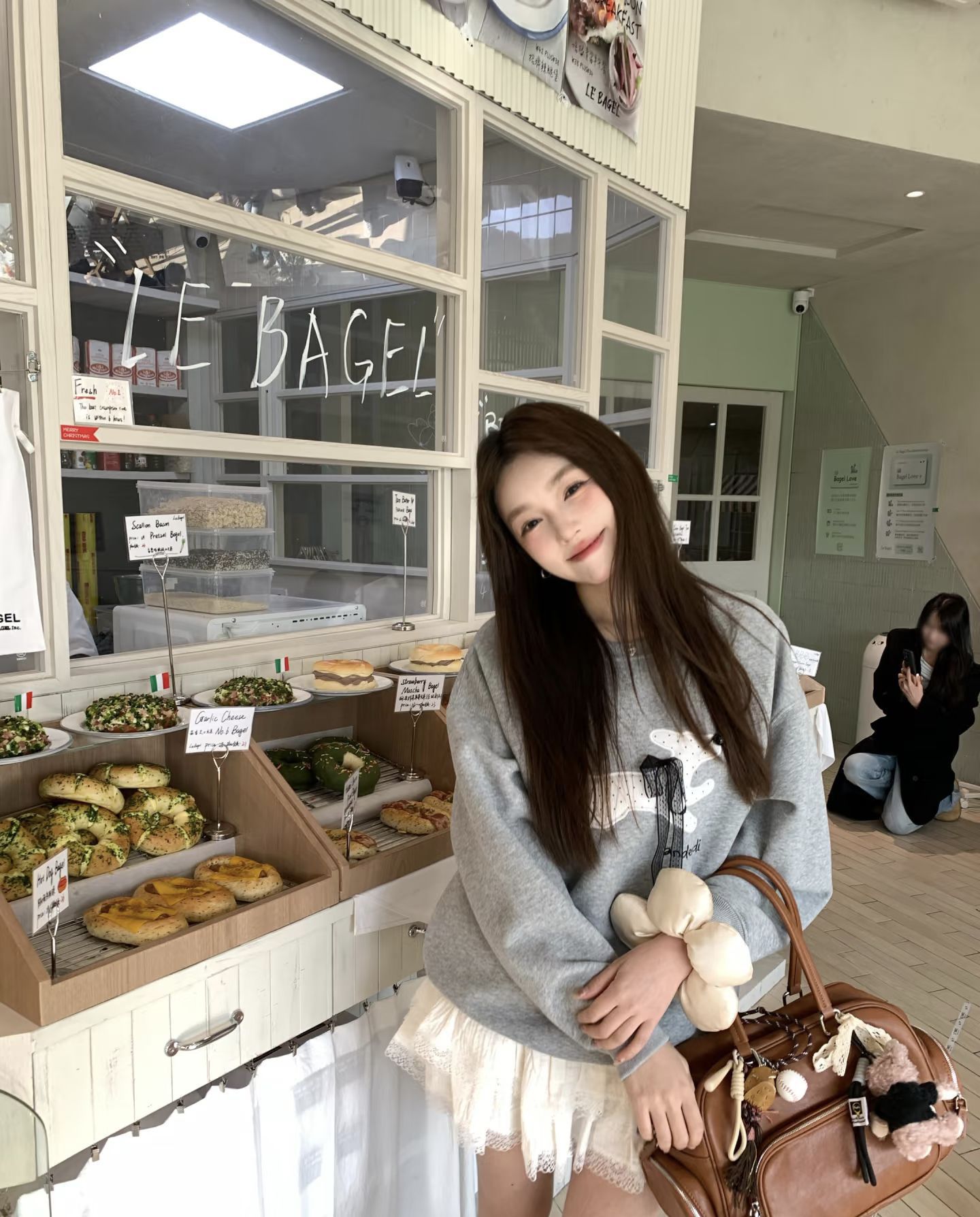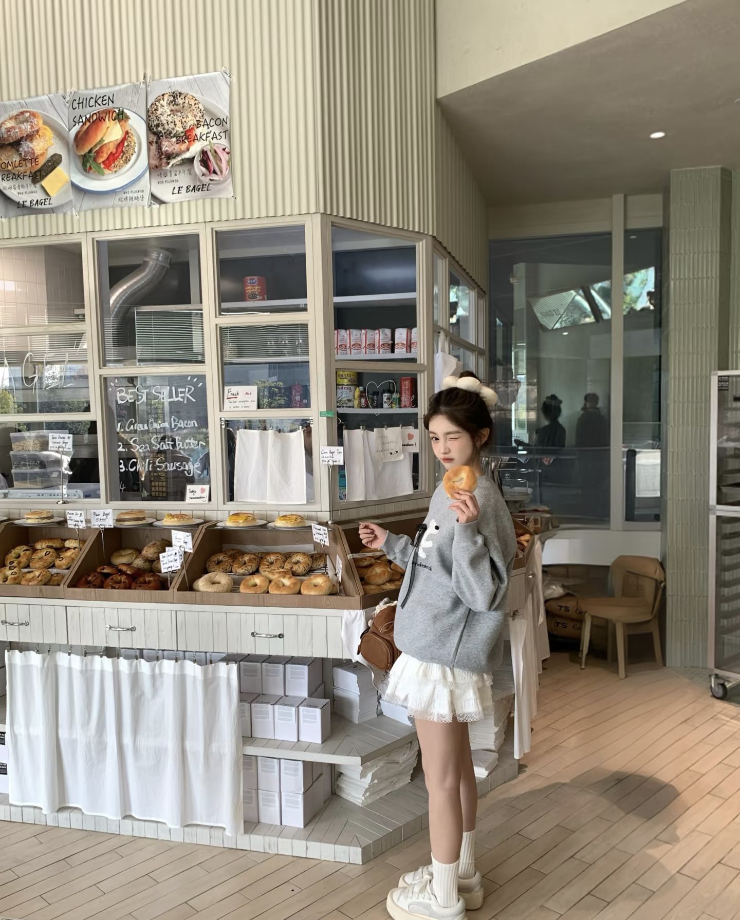 女孩的贝果店日常|卫衣+蕾丝裙=满分可爱暴击! 姐妹们!在LE BAGEL门口拍到今日神搭配!浅灰卫衣➕白色蕾丝裙也太绝了吧~胸口的卡通印花瞬间减龄,软乎乎材质衬得人像刚出炉的贝果一样香甜🥯 蕾丝裙摆和皮质包包的神仙碰撞!棕色大包挂上毛绒玩偶立马注入灵魂,走路时裙摆轻轻摆动,甜度爆表又不腻人,站在面包橱窗前整个人都在发光✨ 偷偷说这套超心机👀 卫衣宽松度刚好藏住小肉肉,高腰短裙悄悄拉长比例,...