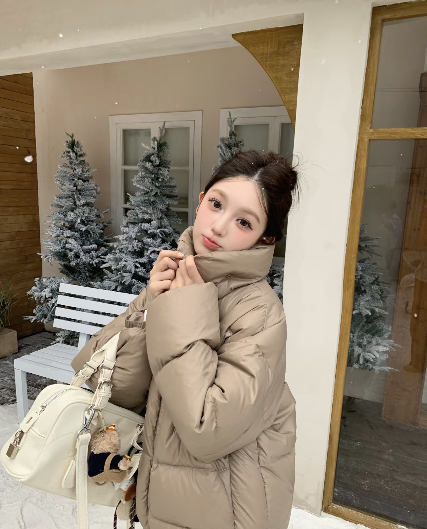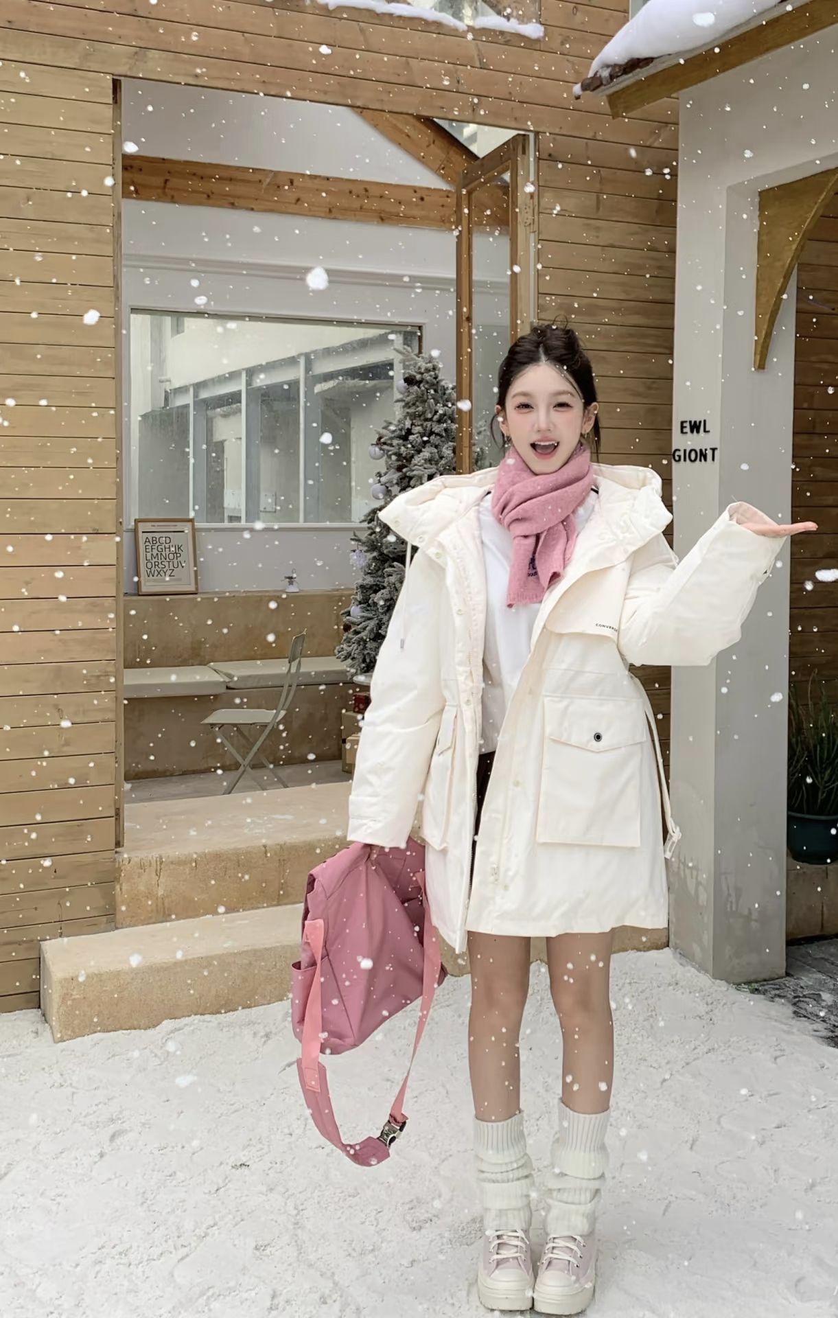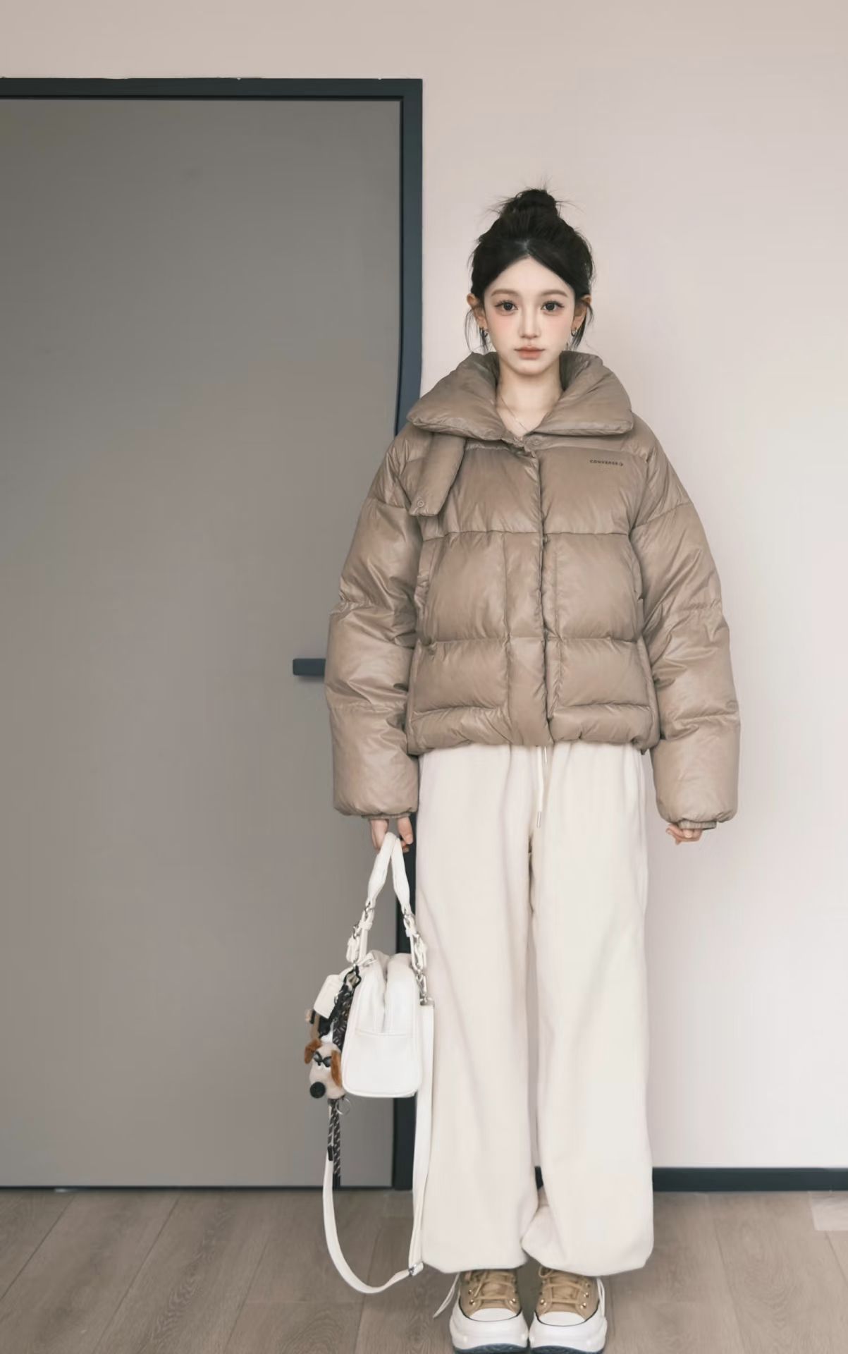 冬日温柔感暴击!❄️羽绒服+百褶裙=懒人保暖天花板! 姐妹们!这套白羽绒配棕裙简直冬日氛围感之神!软fufu的长款羽绒像裹着云朵出门,内搭同色系上衣高级感拉满,深棕百褶裙一穿瞬间打破厚重感,走起路来裙摆飞扬也太灵动了叭~✨ 重点夸这双神仙白袜运动鞋!厚底偷偷增高5cm不说,棉袜护住脚踝超级暖,粉围巾和粉双肩包上下呼应,黑色字母又压住甜腻感,站在米色背景里整个人都在发光💡 第二套短款羽绒+阔腿...