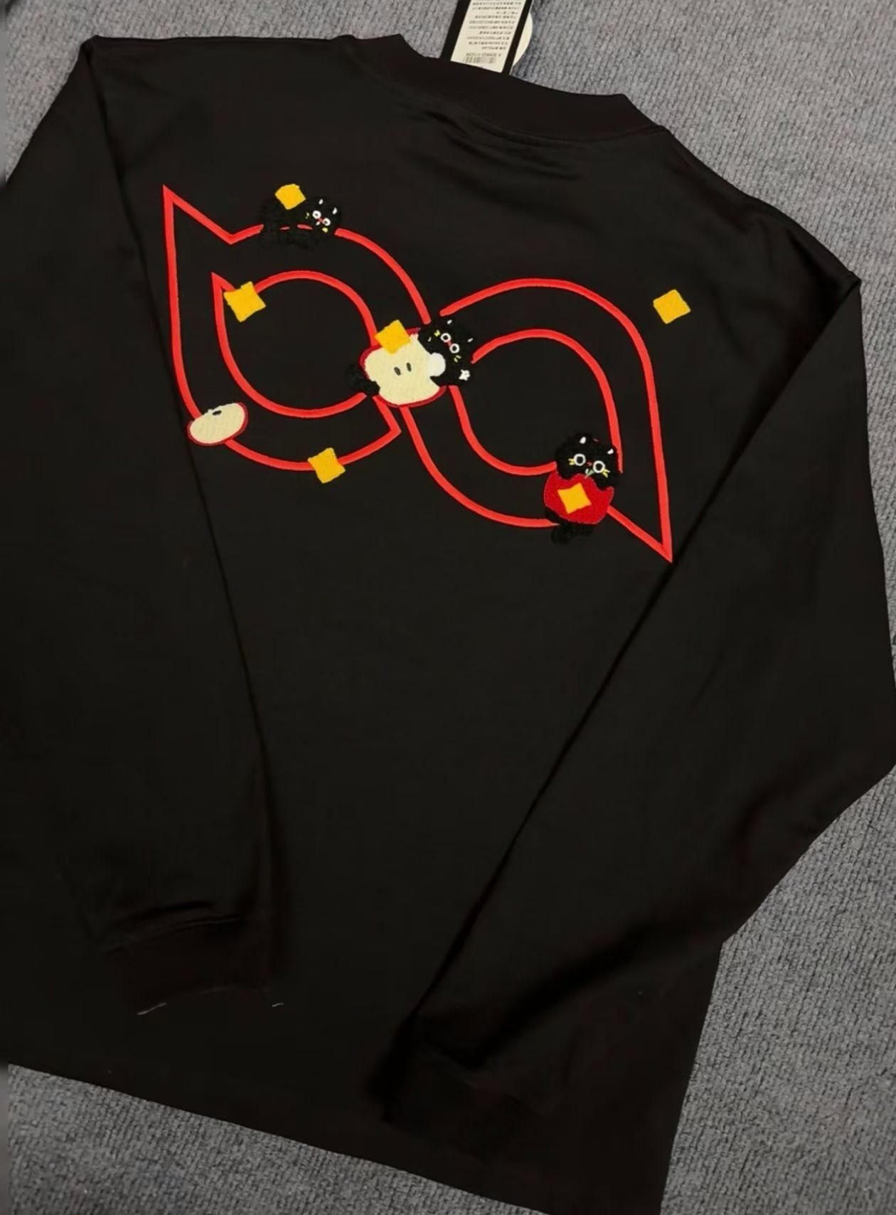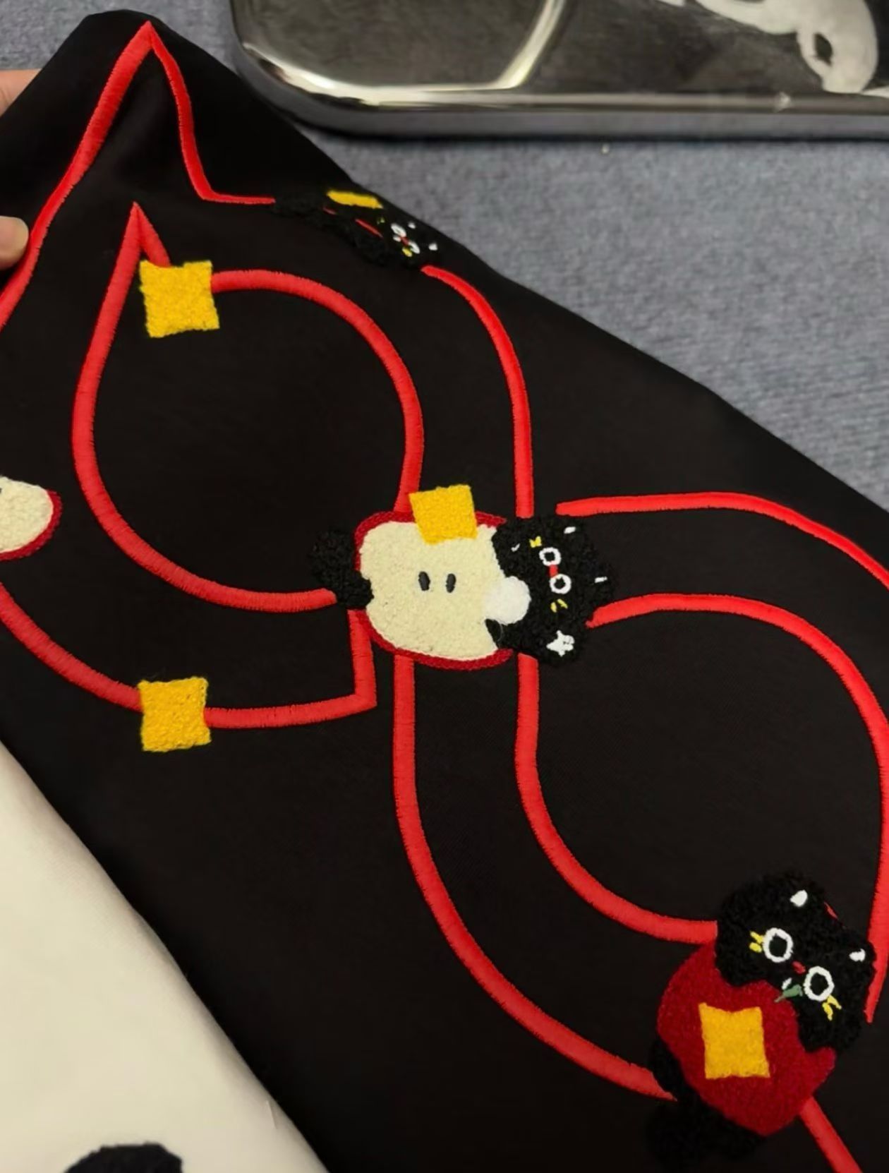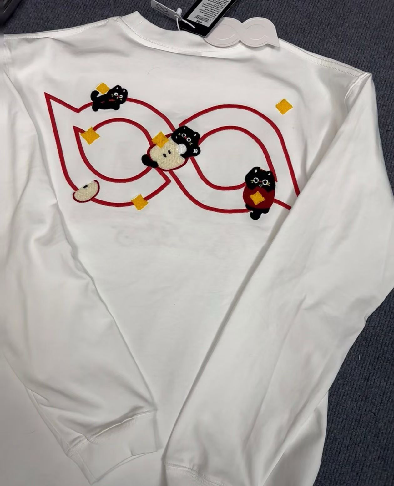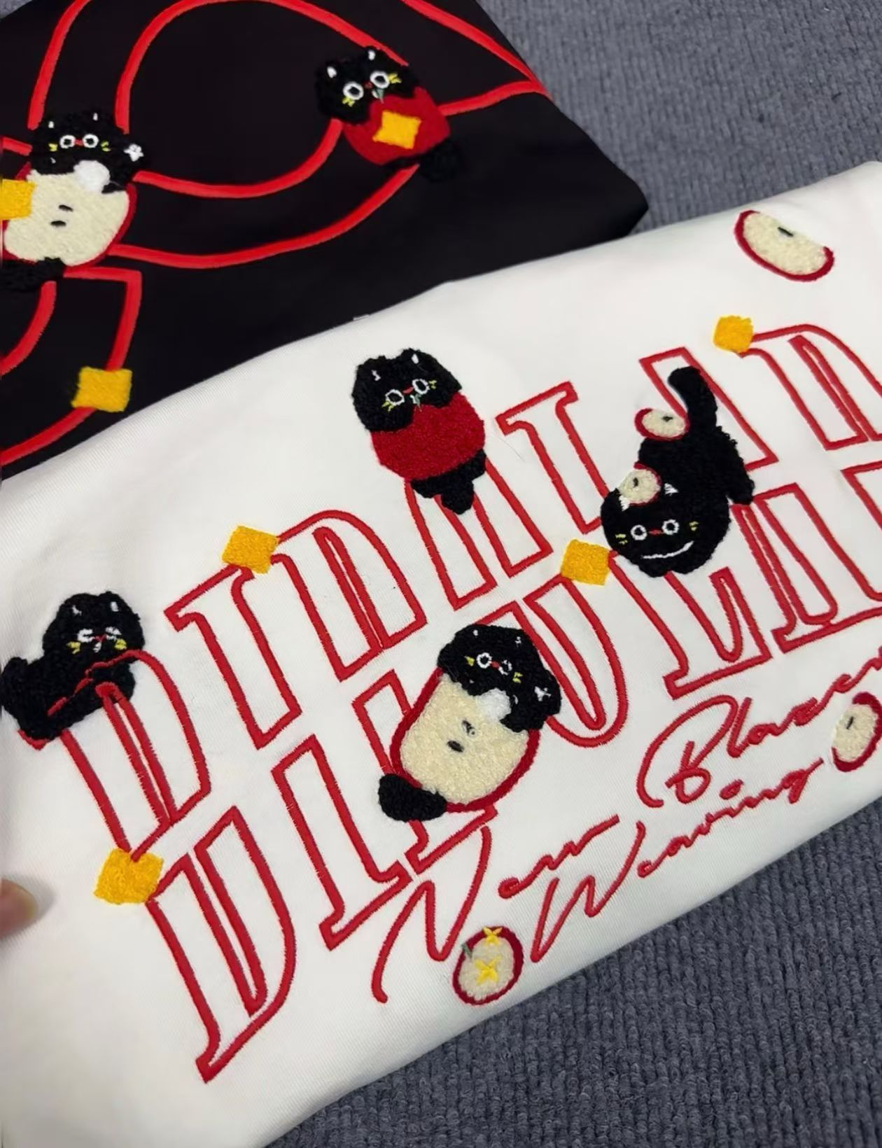 萌趣刺绣T恤:可爱与潮流的双向奔赴 当萌趣猫咪遇上精致刺绣,这款T恤将成为你衣橱里的吸睛担当。 - 设计巧思:黑白两款底色经典百搭,红色线条与立体刺绣碰撞出鲜活感,憨态可掬的猫咪图案或嬉戏于字母间,或穿梭于几何图形里,每一处细节都藏着治愈系的可爱,让你穿上就化身活力满满的元气达人。 - 质感升级:优质面料亲肤舒适,刺绣工艺细腻扎实,既保留了图案的立体感,又确保穿着的透气性,日常出街或宅家休...