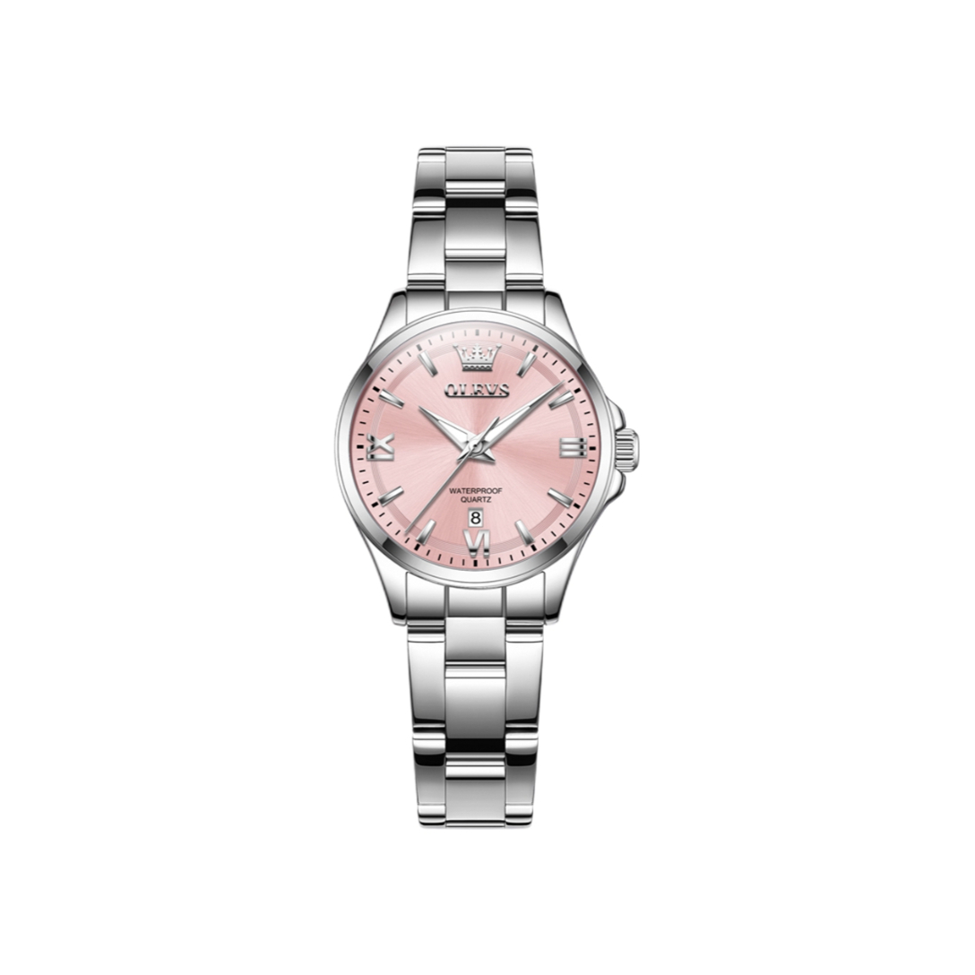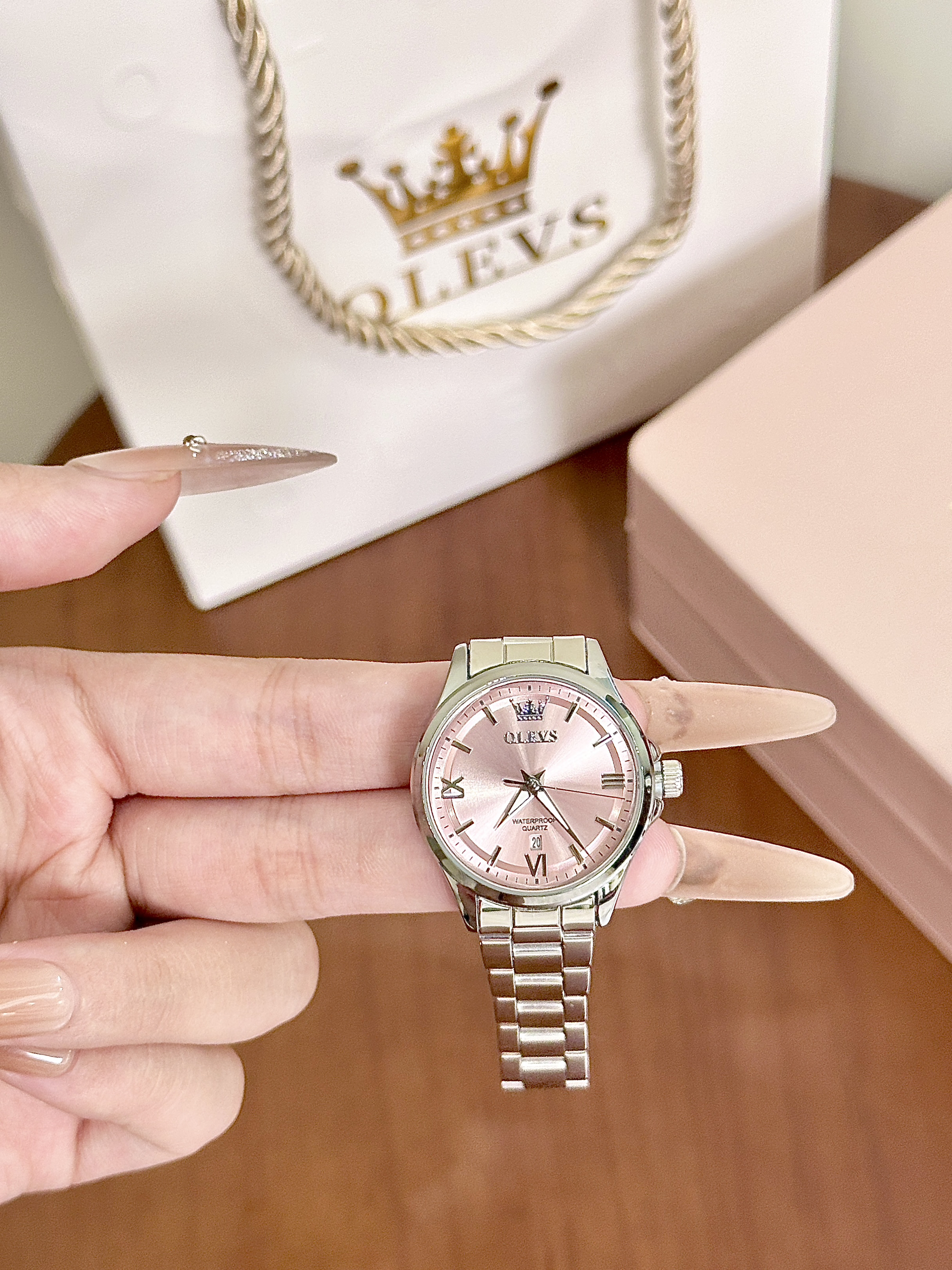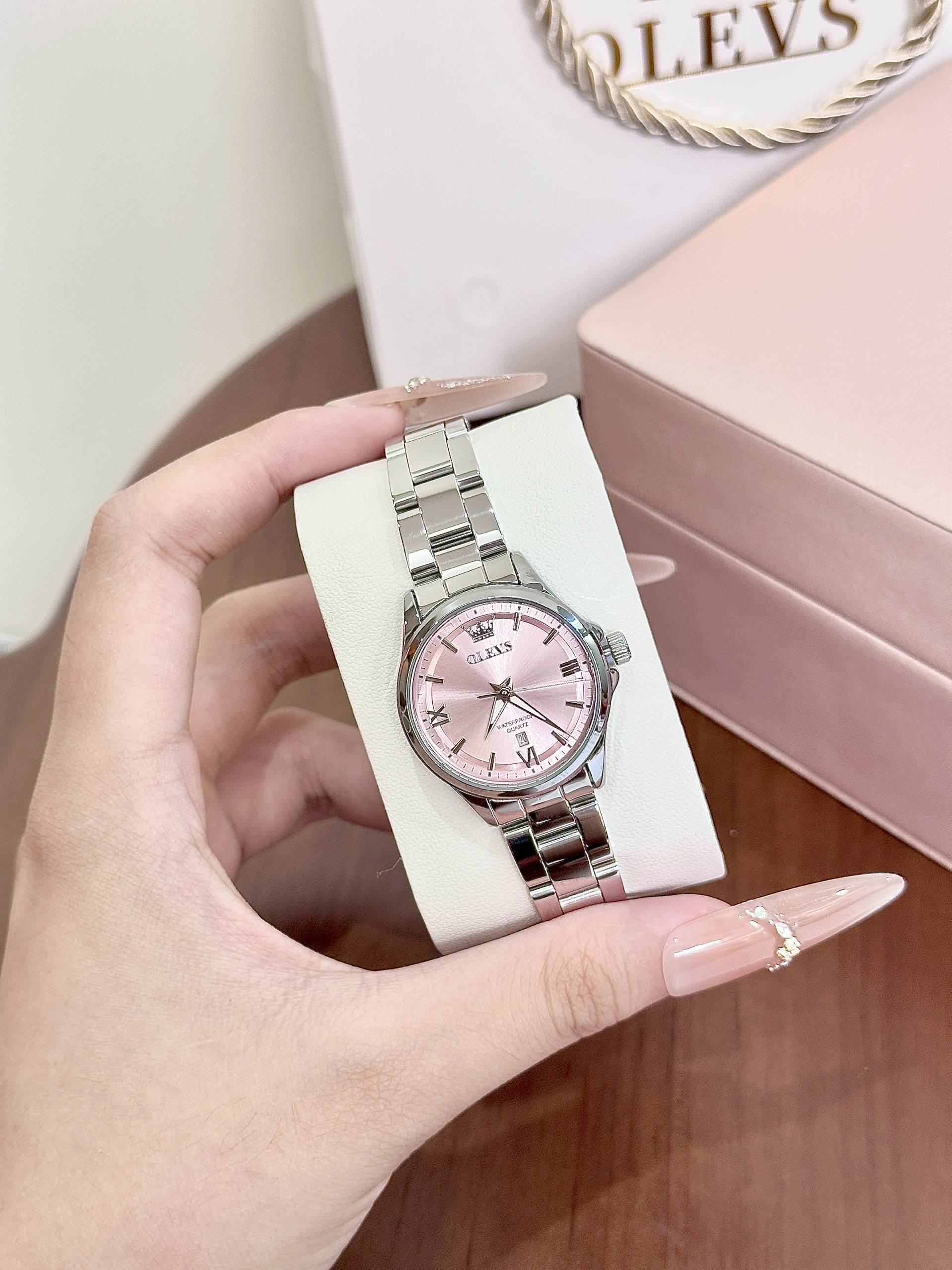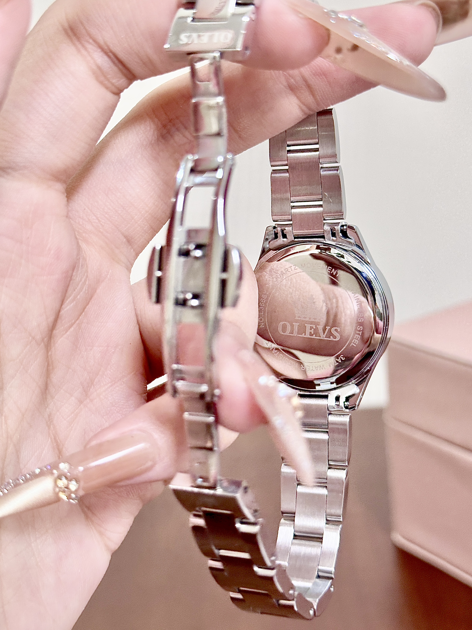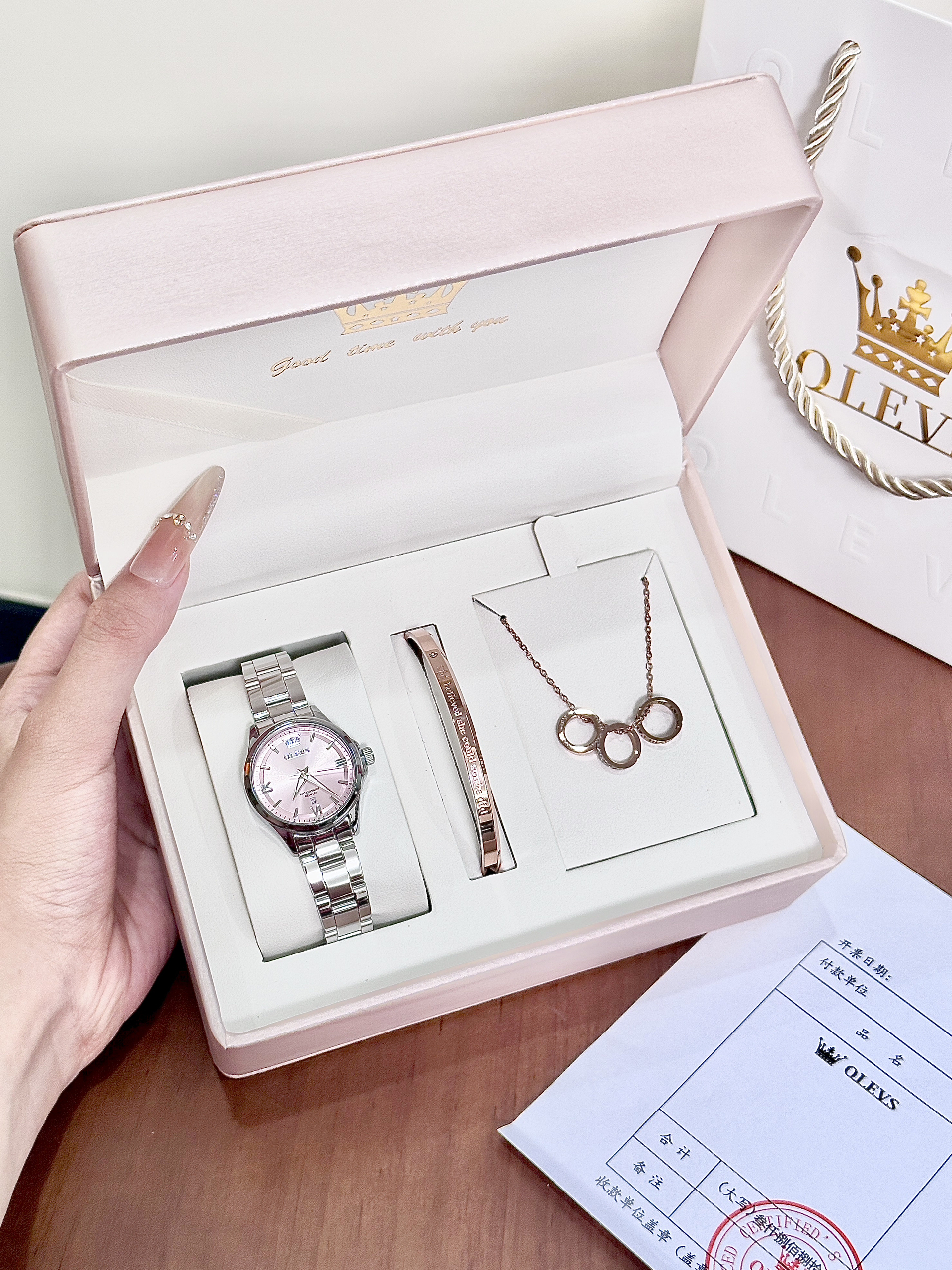 我尊嘟拒绝不了这种粉嫩嫩的腕表 欧利时这套礼盒里边儿有手表➕手镯➕项链 日常的配饰包圆了~ 这个表盘是那种水蜜桃粉 在灯光下 bulingbuling 的好闪✨ 搭配上开口镯叠戴,贵气千金感这不就来了吗! 刚好国庆出游我的穿搭配饰就戴这一套啦