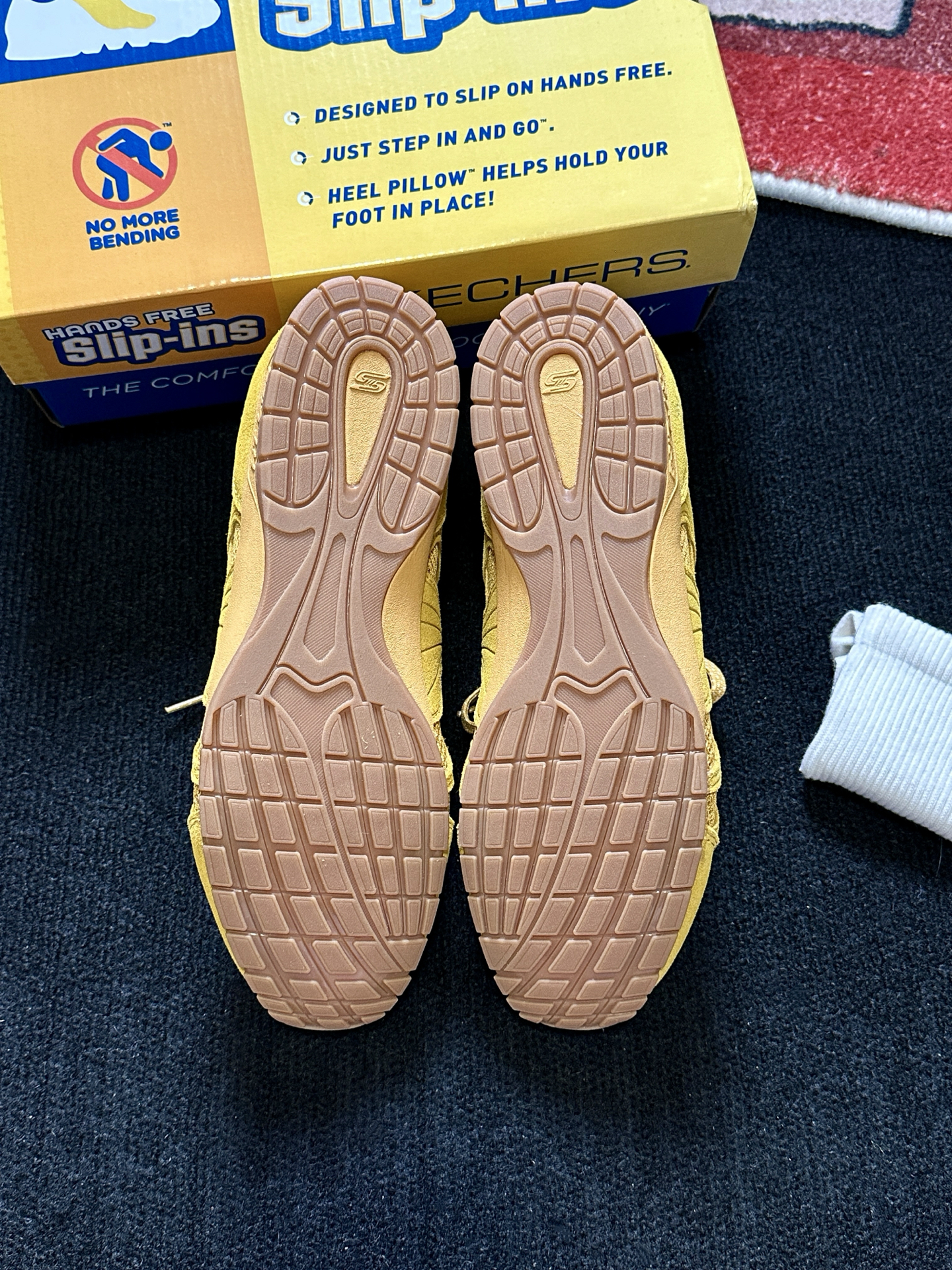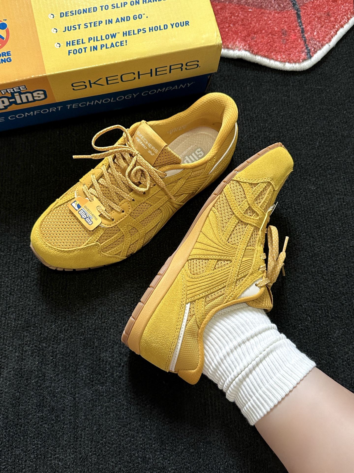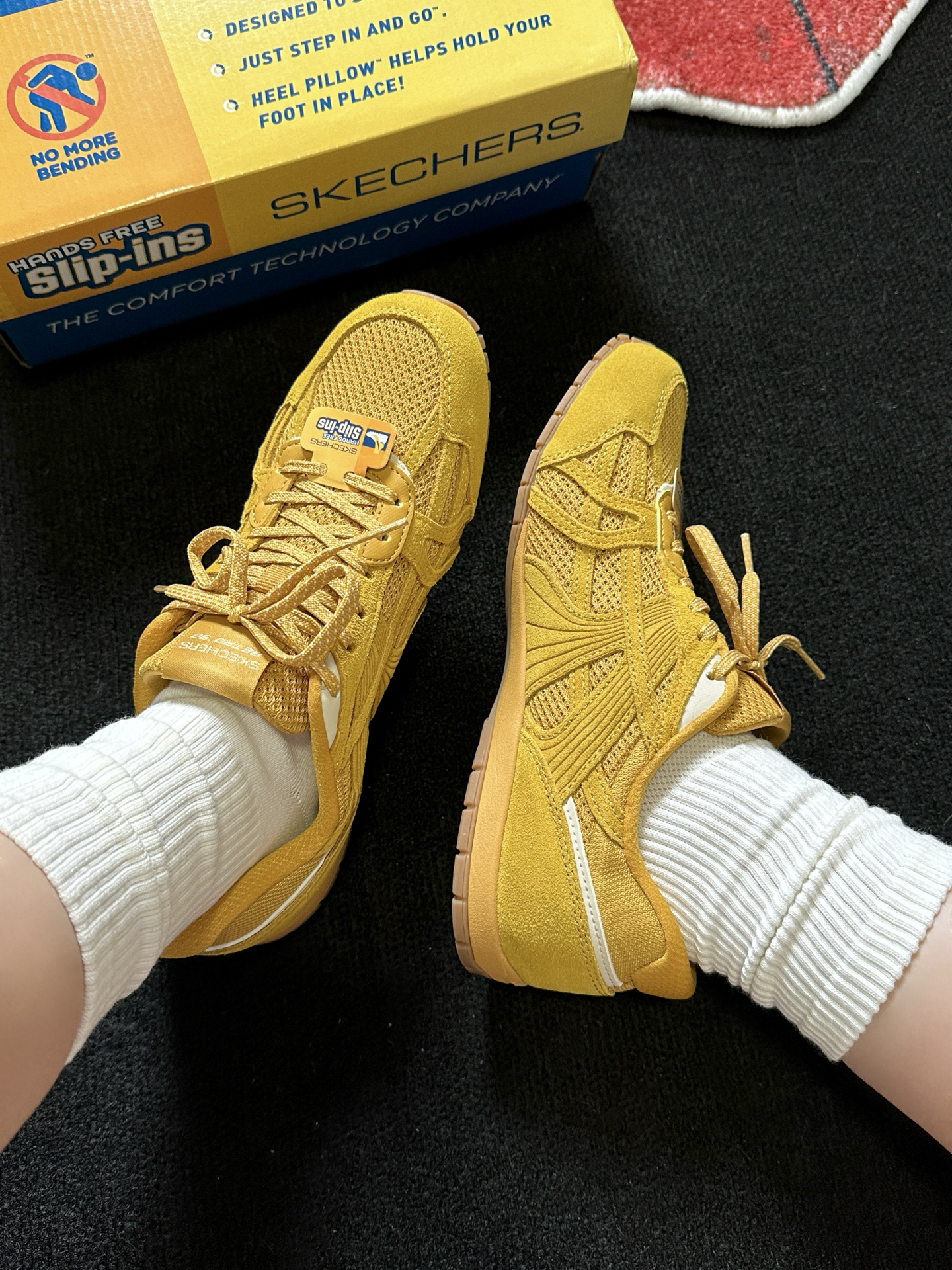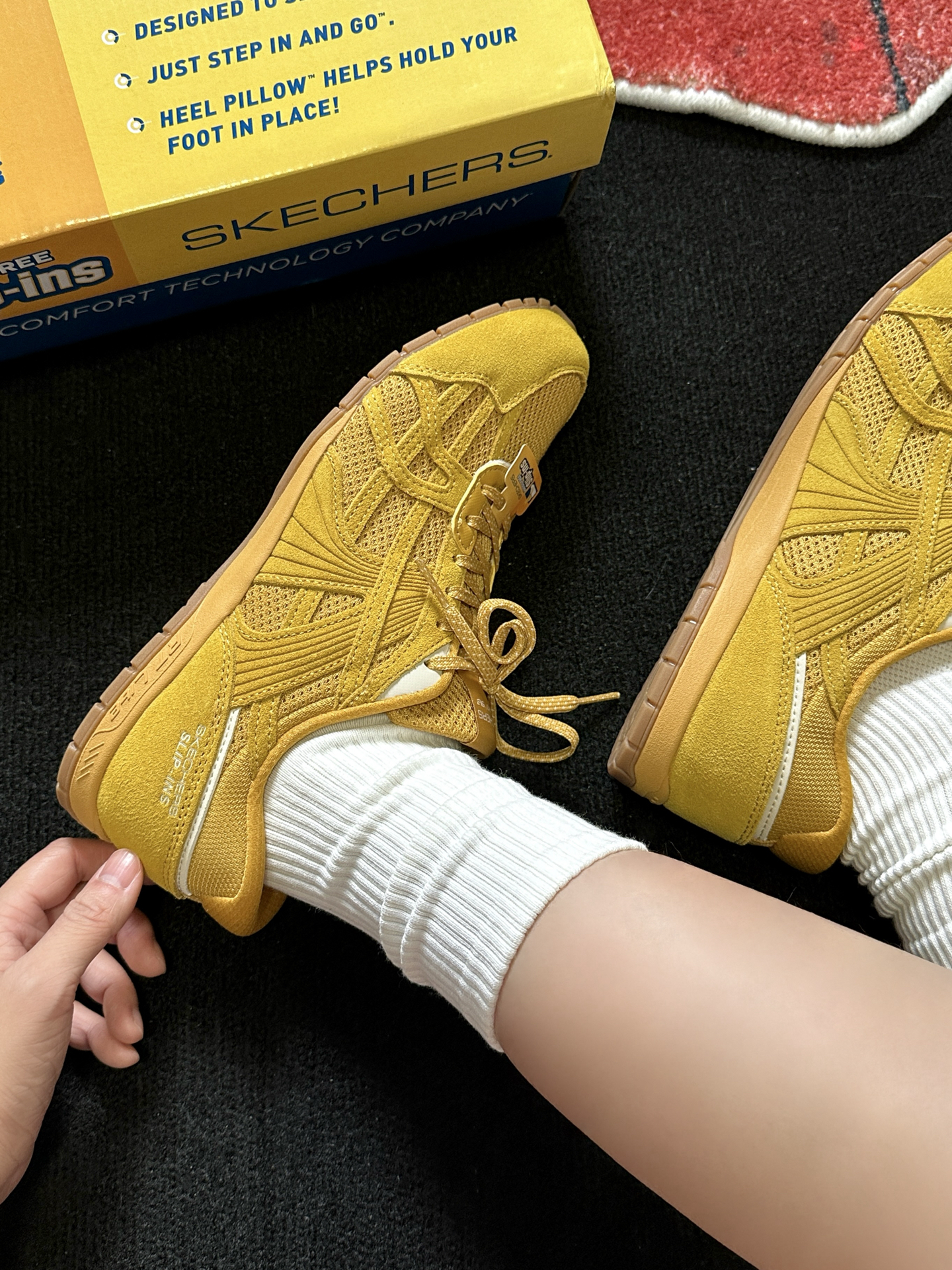 最近发现一双超级好看的薄底鞋👟一看居然是 #Skechers 斯凯奇的🙀跟以往的风格大大不同!整体是很洋气的Yellow黄🔶适合搭配多巴胺街头风🌬️翻毛皮的质感很棒!鞋头是网布材质,透气性OK~穿上是脚是窄长的feel~ #美式复古百元拿捏 #人人都是球鞋博主 #松弛感通勤美鞋look #skechers斯凯奇 #超百搭复古板鞋