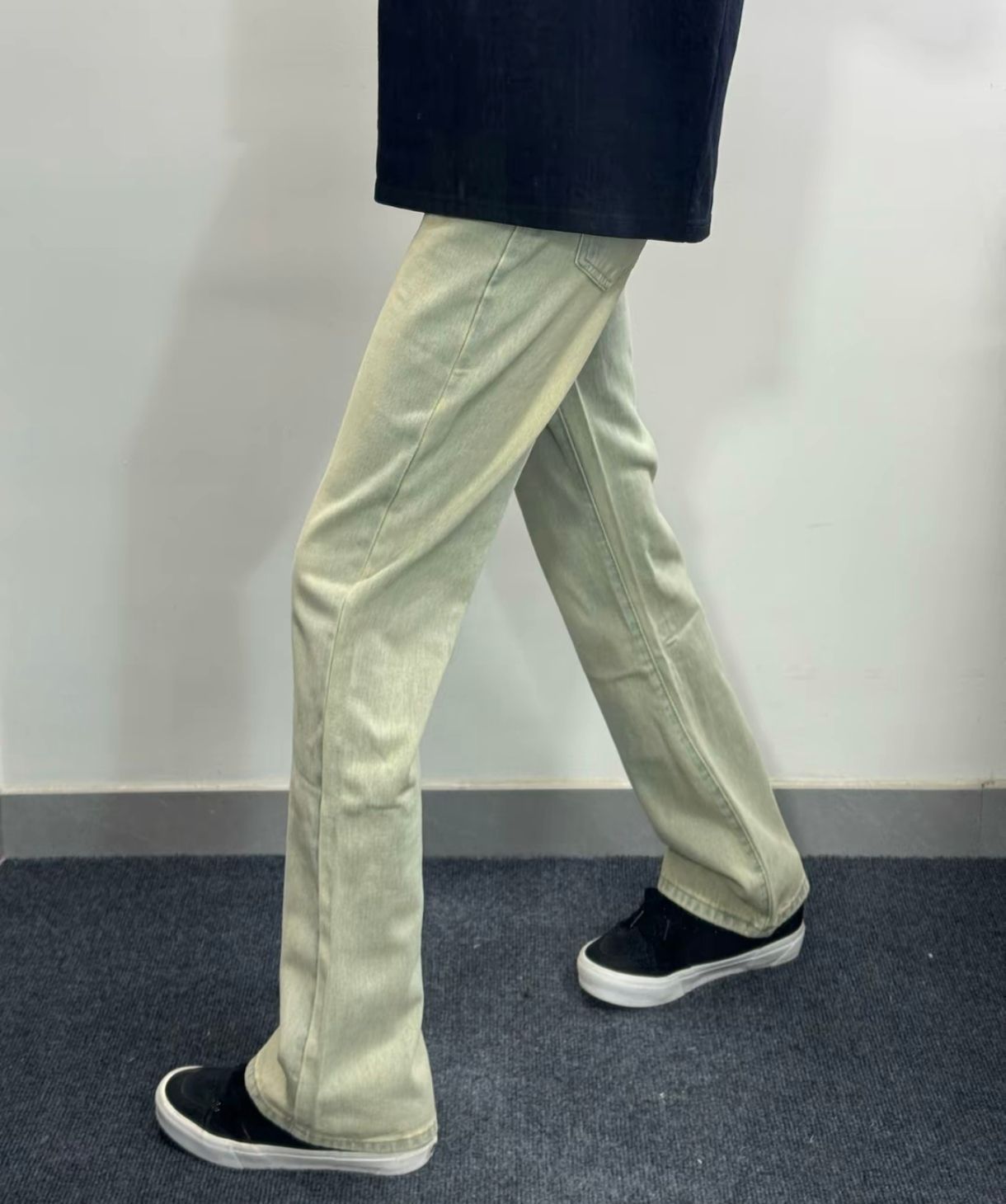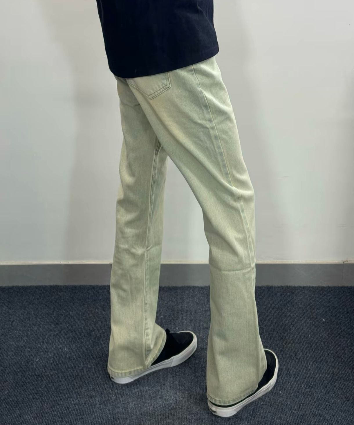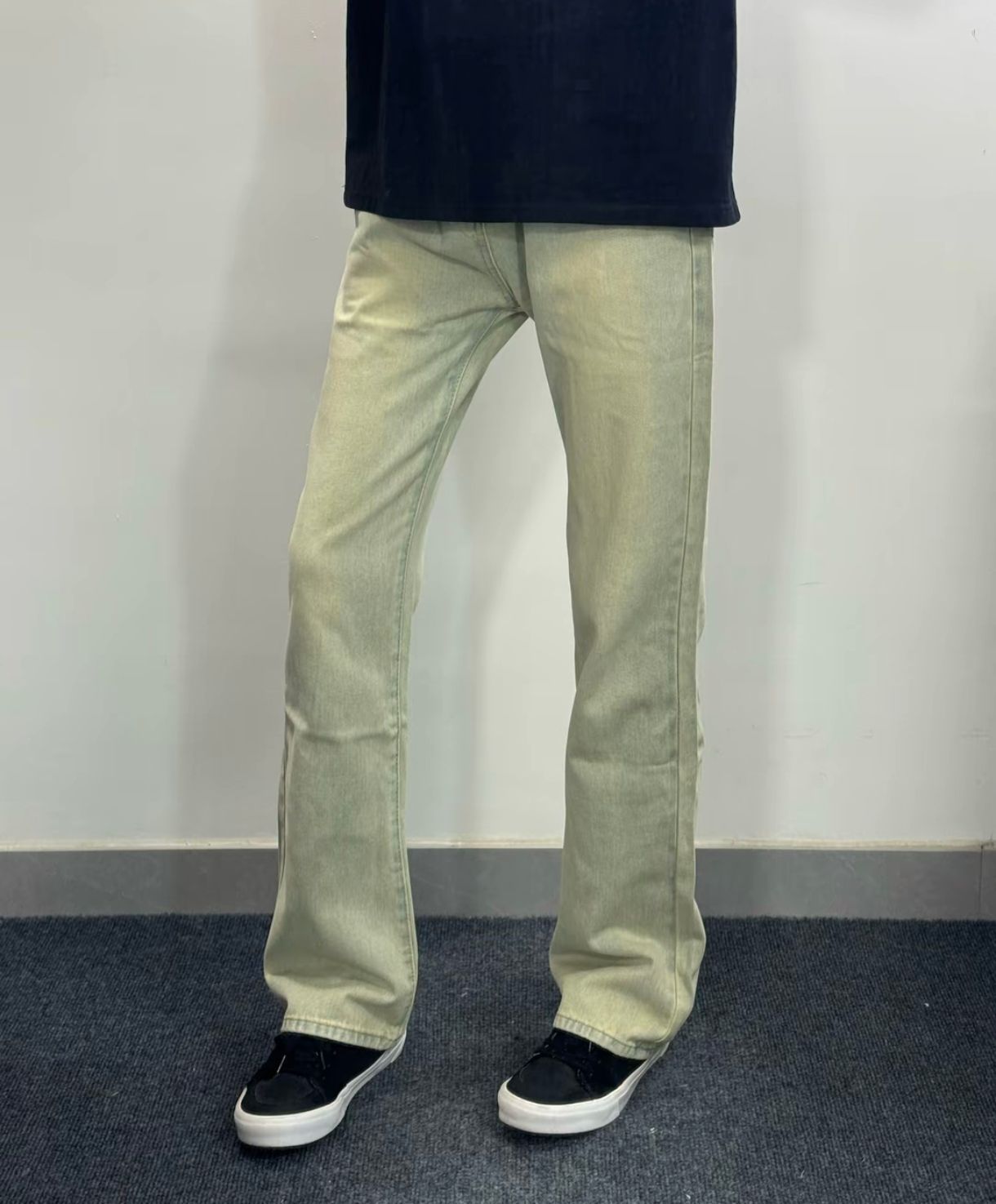 这是一条美式高街基础休闲牛仔裤!微喇叭宽松的版型穿起来很显瘦哦 舒适柔软面料穿起来也很舒服 简约日常通勤很百搭的哈 搭配一双板鞋简直不要很帅了 搭配一双小黑板鞋就不要很帅了!