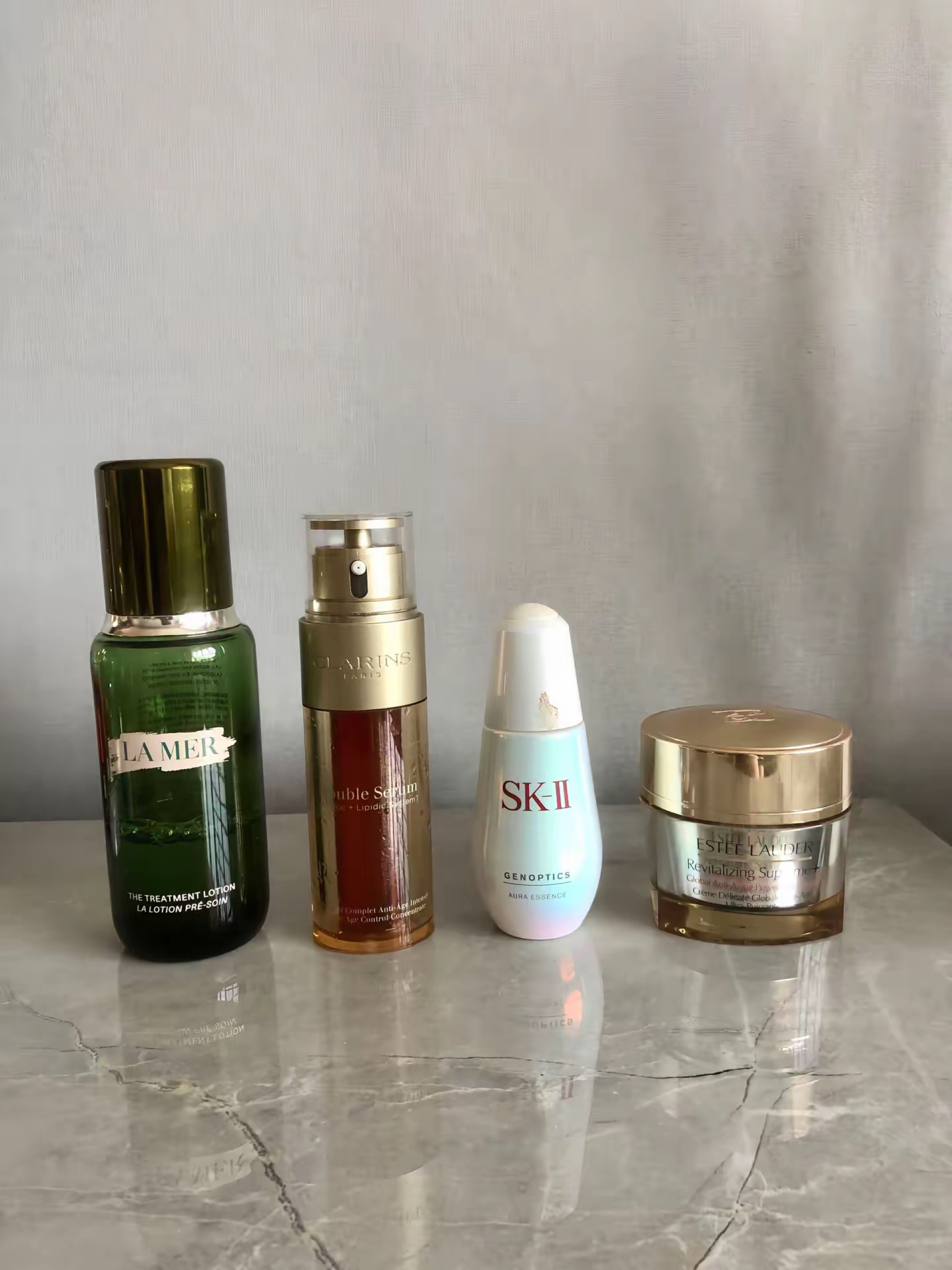 用过就舍不得换的组合! •海蓝之谜精粹水 修复能力超nice,懒人可以直接当水十精华用新版添加了高活性的抗初老成分~ Vsk-II光子小灯泡精华美白界的扛把子 抗氧减黄去黑淡斑一并搞定 乳液质地肤感超棒 V娇韵诗双萃精华 去黄提亮,维稳修复,淡纹细腻肌肤! 秋冬最值得入~双萃一生推! V雅诗兰黛智妍面霜75ml 一瓶多效!俗称“万能面霜” 收毛孔、细纹淡褪、紧致肌肤、滋润保湿性价比最高。