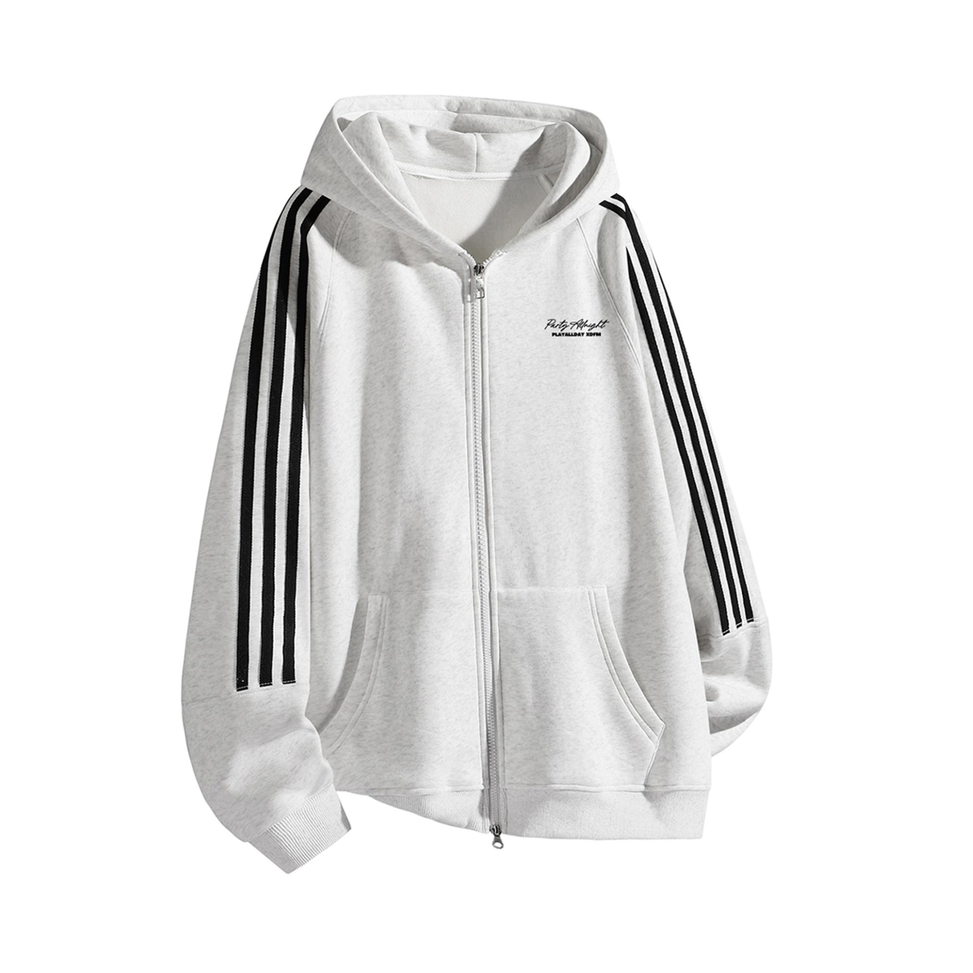 拉链卫衣外套 衣服版型oversize风格 上身宽松 慵懒感十足 侧面的条纹设计 韩系又减龄 帽子戴着够大 衣服料子软乎乎的 款式男女同款