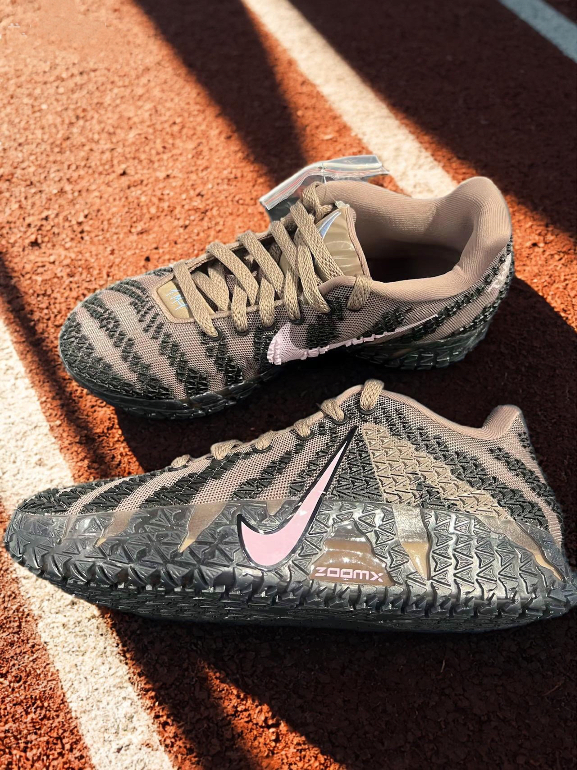 穿了大半个月,这双棕黑粉Ja 3直接把体验感拉满!先吹爆颜值,棕粉渐变鞋身搭配反光勾边,熊爪撕裂造型超有辨识度,不管是球场上还是日常搭运动裤、牛仔裤都很出片,回头率比想象中还高。 实战性能更是惊喜。全掌ZoomX泡绵脚感太顶了,踩开后韧弹反馈特别明显,突破蹬地时有劲儿,起跳落地缓冲也很稳,完全没有泄力感。鞋面透气织物+加厚内衬包裹超紧实,鞋带孔带阻尼不会滑松,急停变向时脚在鞋里稳得很,终于没了前...