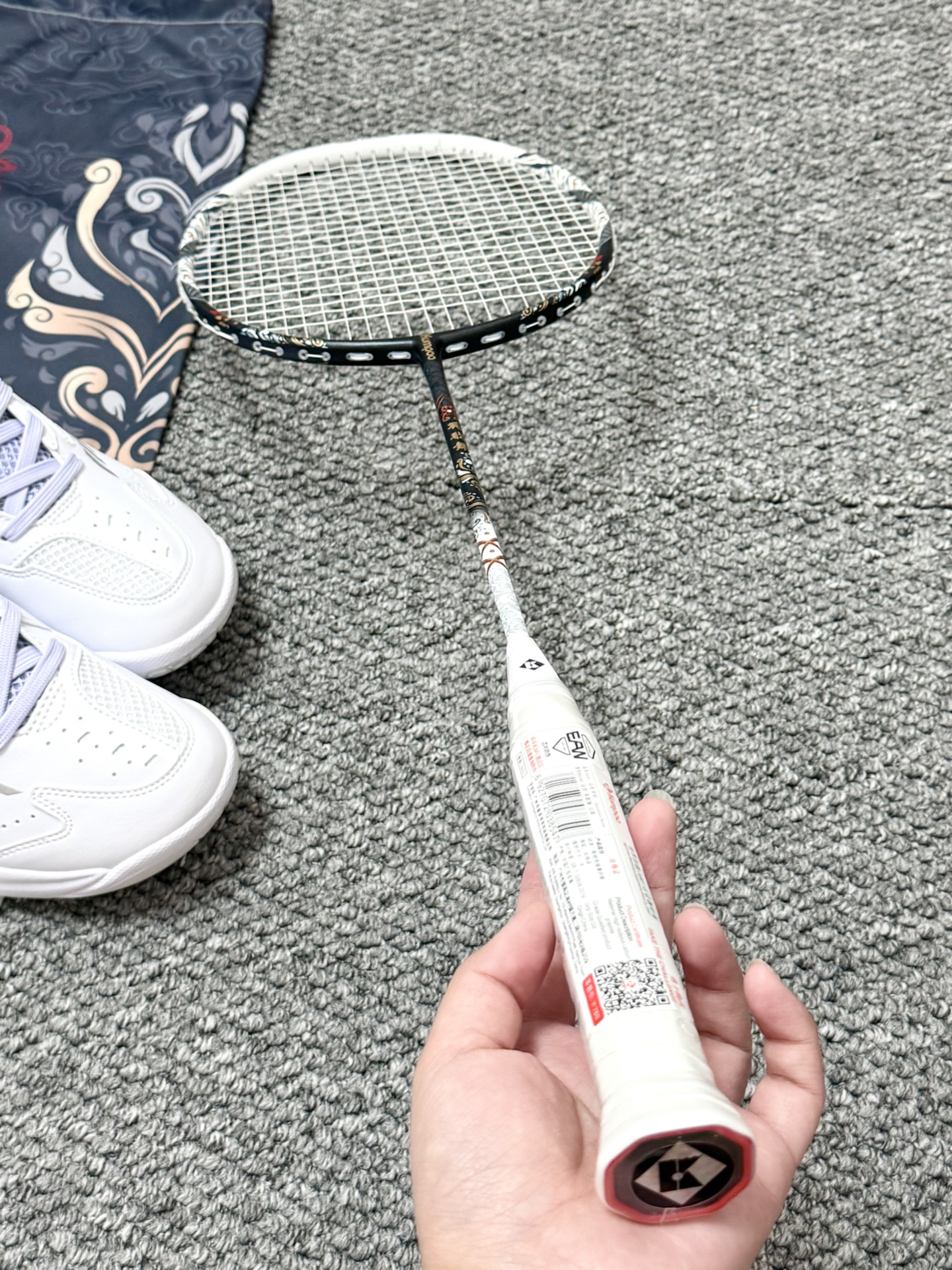 薰风你小汁也泰会啦 介个全碳素羽毛球拍尊滴吼看捏 国风设计蛮特别的 材质也蛮轻的 长时间打球也不累手 搭配介个羽毛球鞋 素球馆坠靓滴崽!