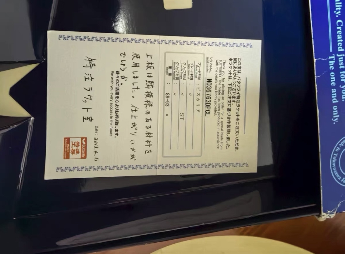 我发现蝴蝶特注工房24年重新开放订单啦~之前停了好多年,现在又能订特注球拍。我用着感觉它手感清晰通透,吃球深、旋转和底劲也不错,不过价格不低,更适合预算足的乒乓爱好者入手~图源网络侵删