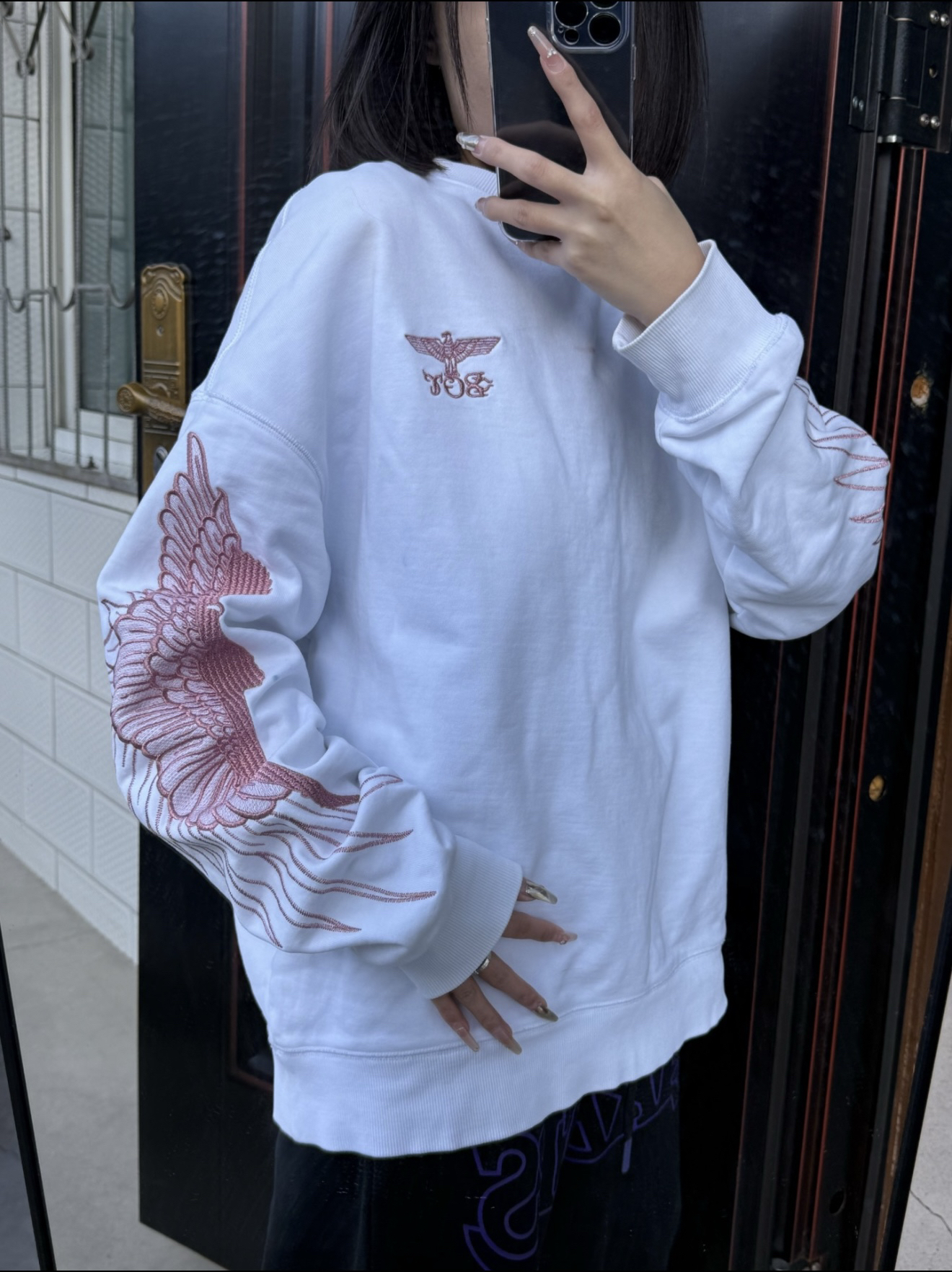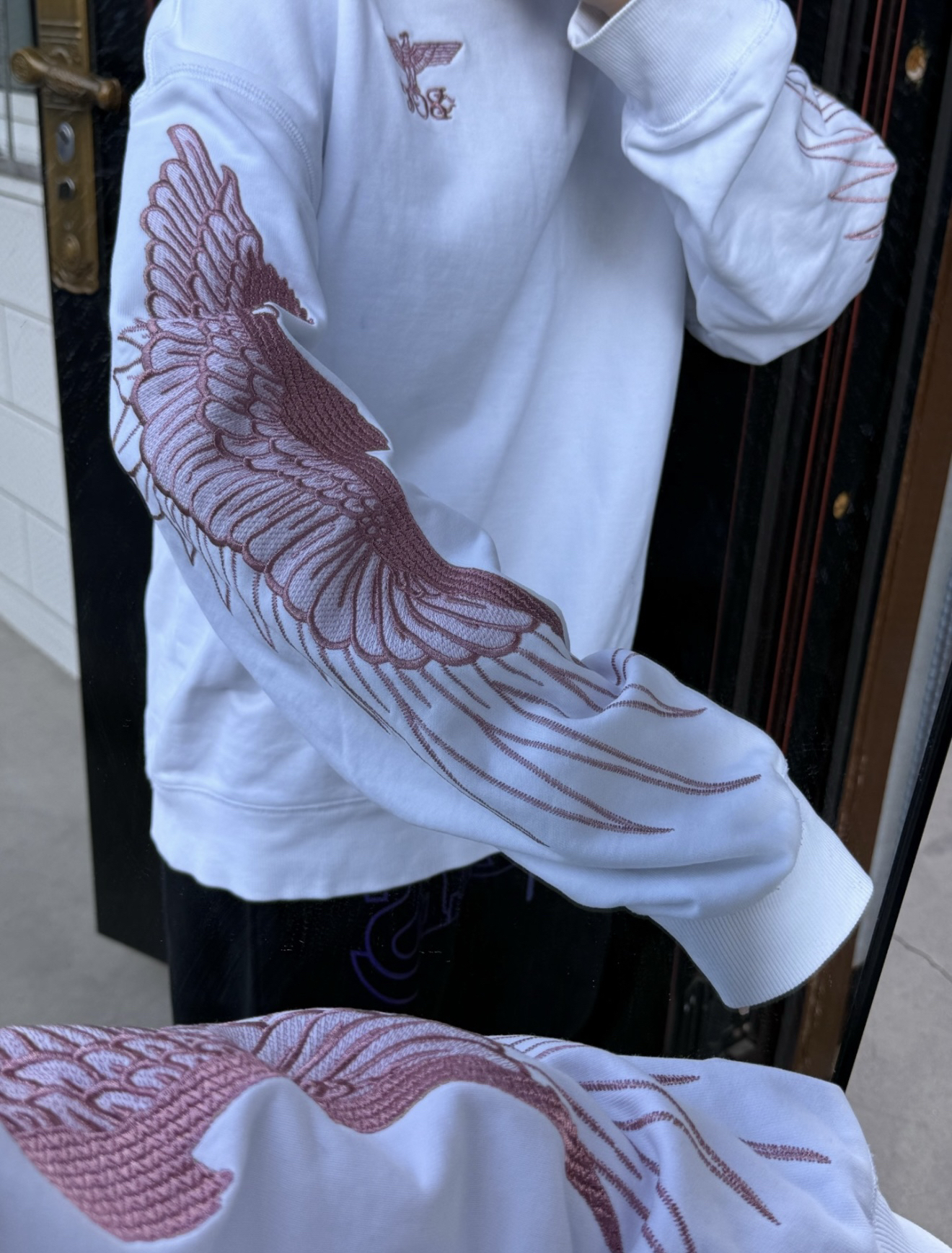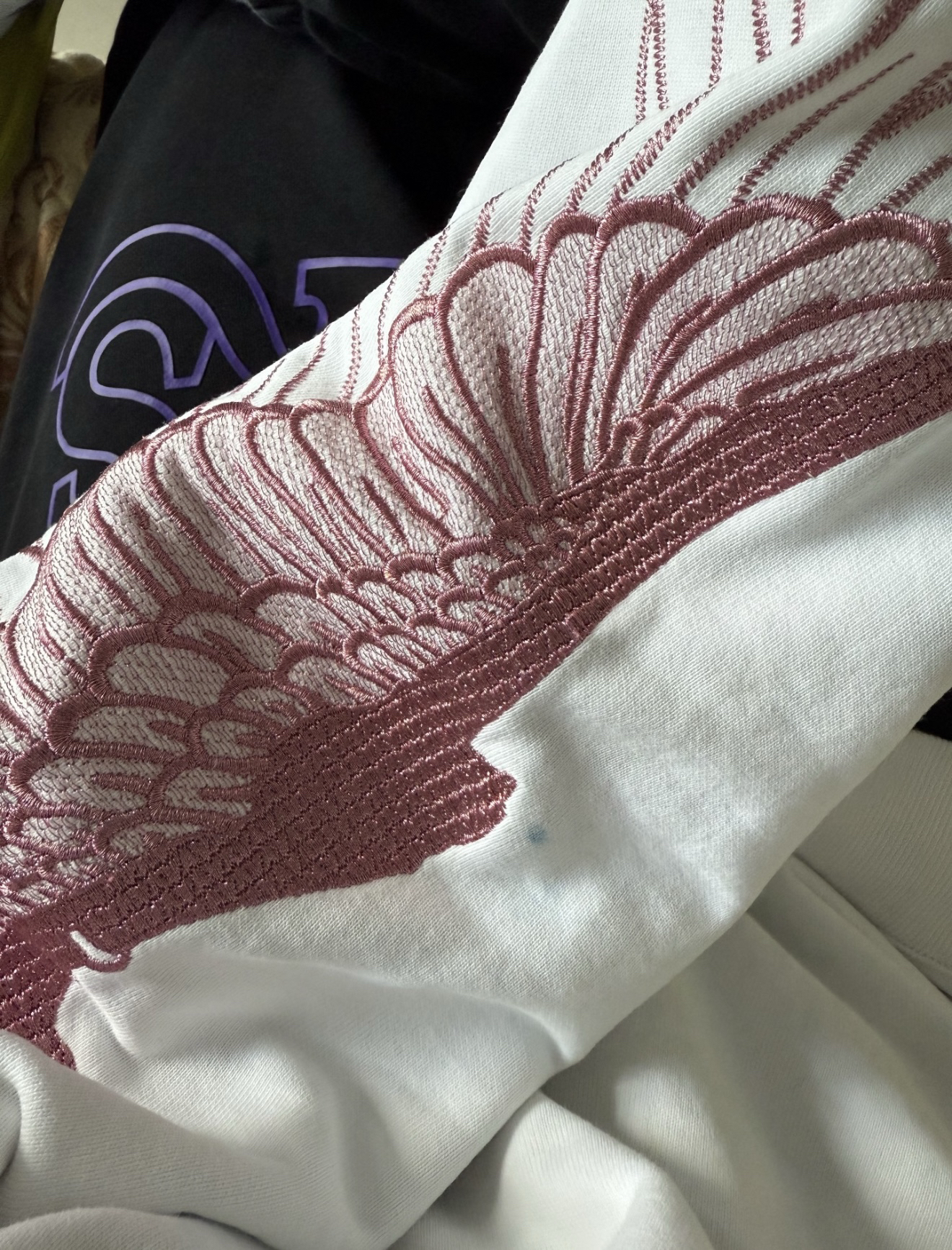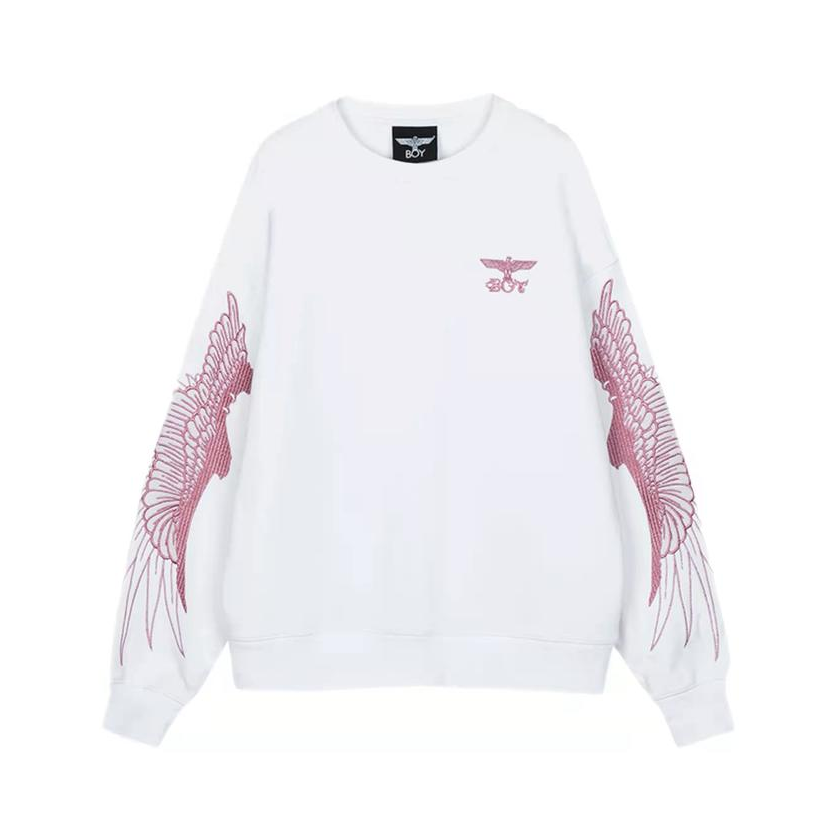 【Boy London】这件无帽经典卫衣刺绣太好看啦,有点偏玫瑰色的刺绣十分饱满,摸起来手感就是那种万针的感觉. ✅整体以白色为主➕翅膀刺绣为点缀,无论是叠穿还是单拎出来成一件单品来穿搭都是很无解。 #ootd卫衣#秋日必备#无帽卫衣