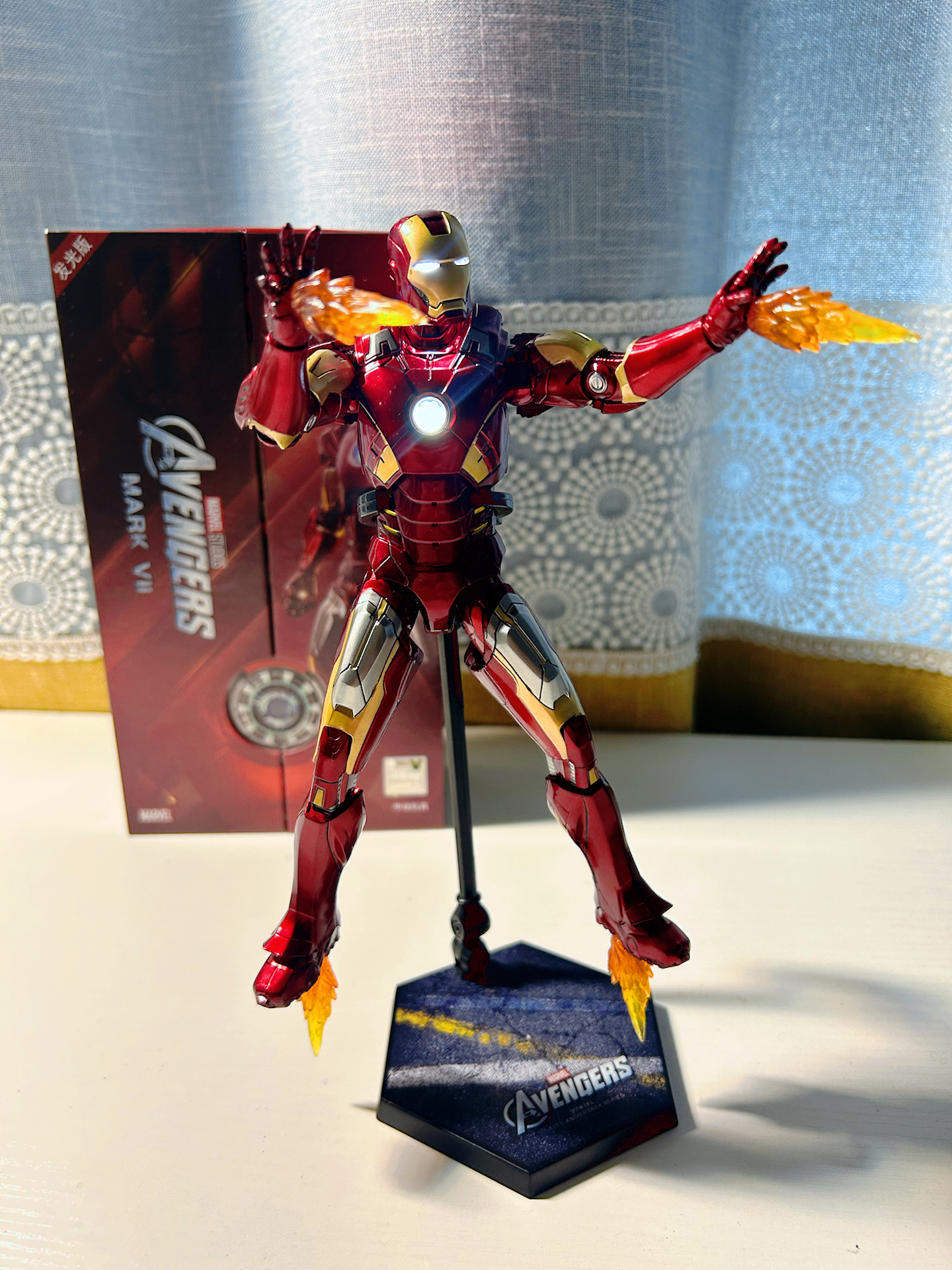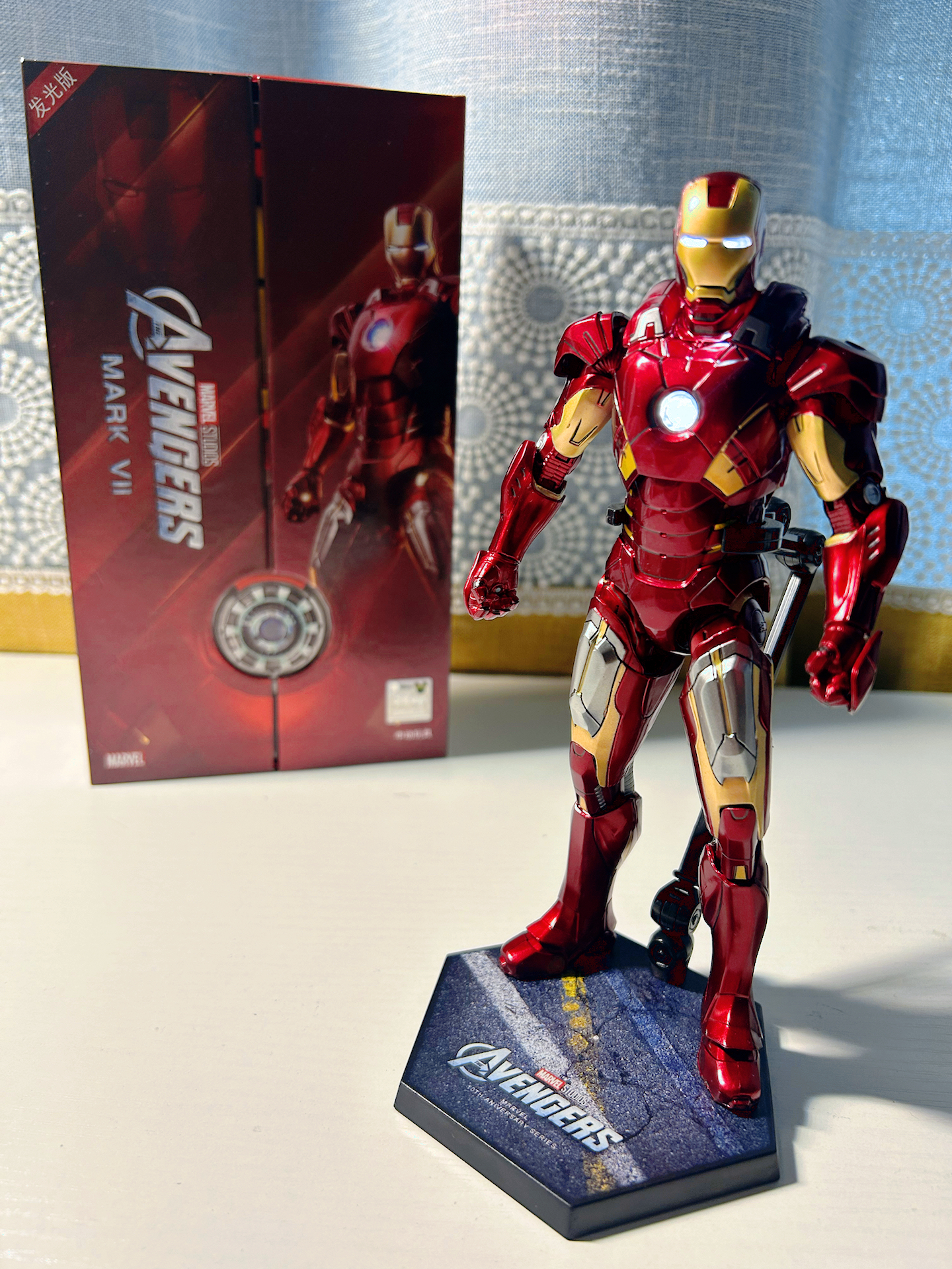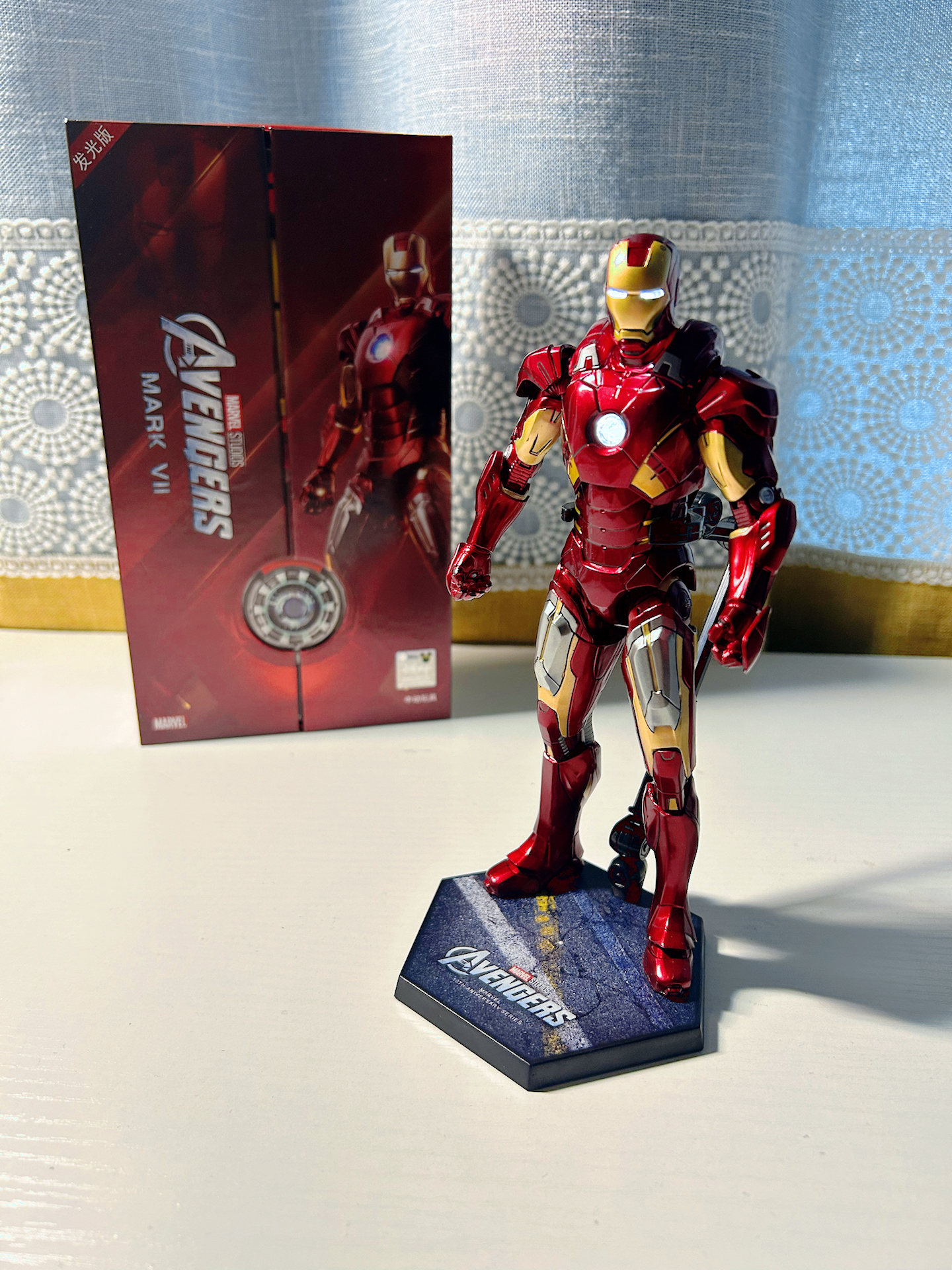给男友安排了这个中动钢铁侠MK7手办~拿到手质感超棒,造型和电影里还原度很高,关节可动性也不错,能摆出好多帅气姿势!发光效果一整个爱住,男友收到后眼睛都亮啦, 不过要是包装再精致点就更完美咯~图源网络侵删