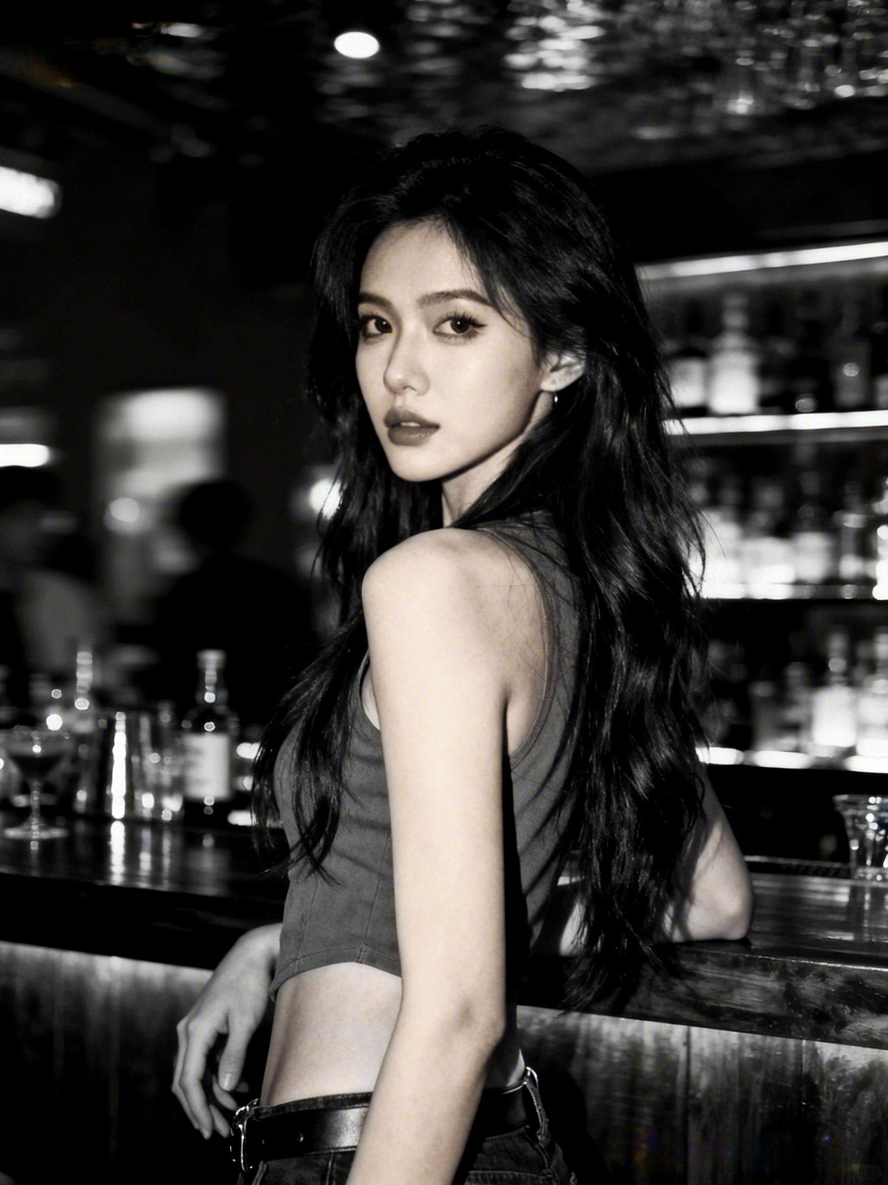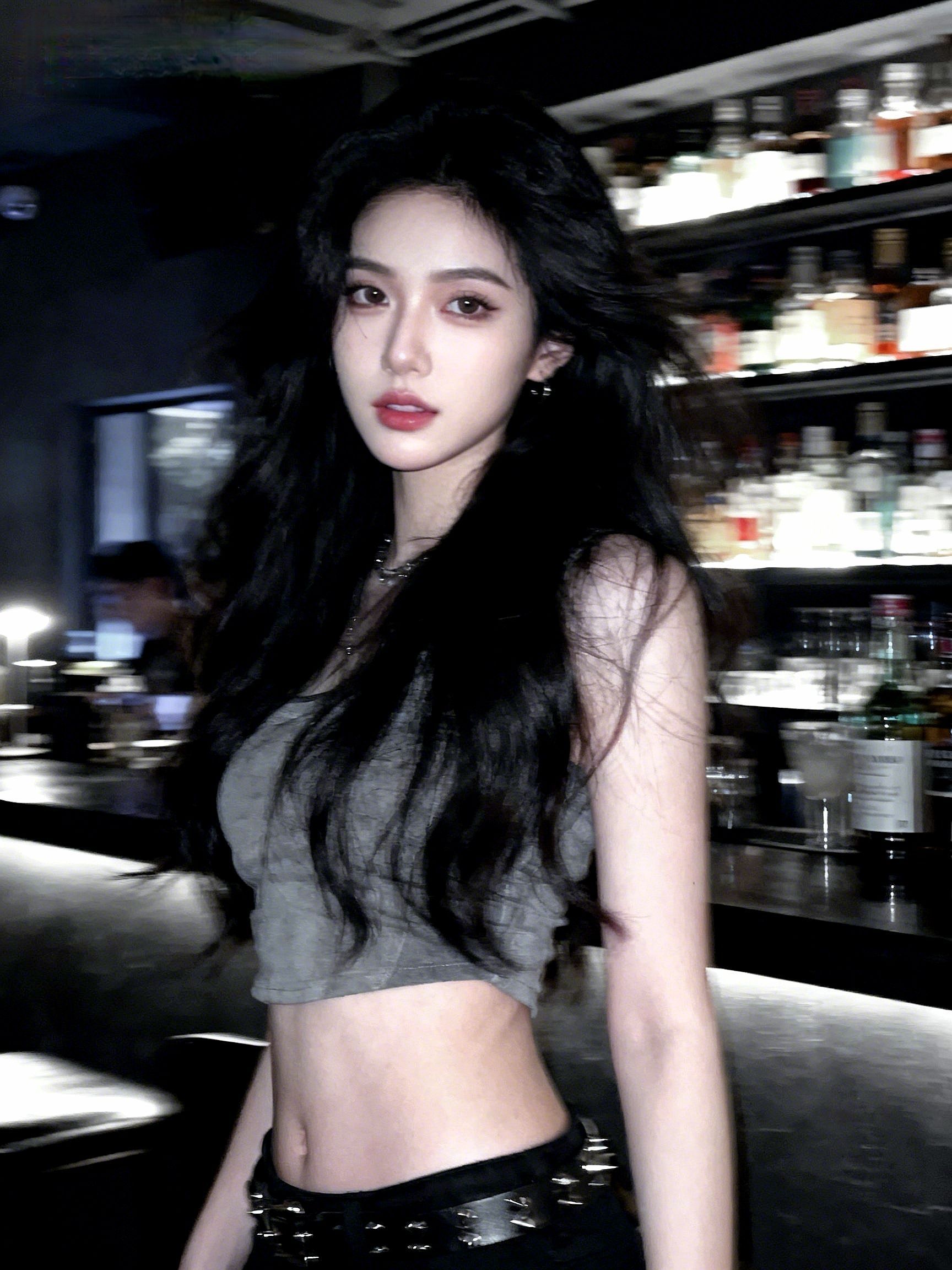 在幽暗的酒吧氛围里,一身酷感穿搭成为焦点。 上身是一件做旧灰色短款露脐背心,贴身剪裁勾勒出紧致腰线,随性又带点小性感; 下装搭配黑色铆钉短裤,将修长美腿尽情展露,铆钉元素为整体造型注入朋克气息; 鞋子选择黑白撞色厚底运动鞋,既拉长腿部线条,又为穿搭增添街头潮流感,整套搭配在酷飒与性感间找到完美平衡,轻松hold住夜场风格