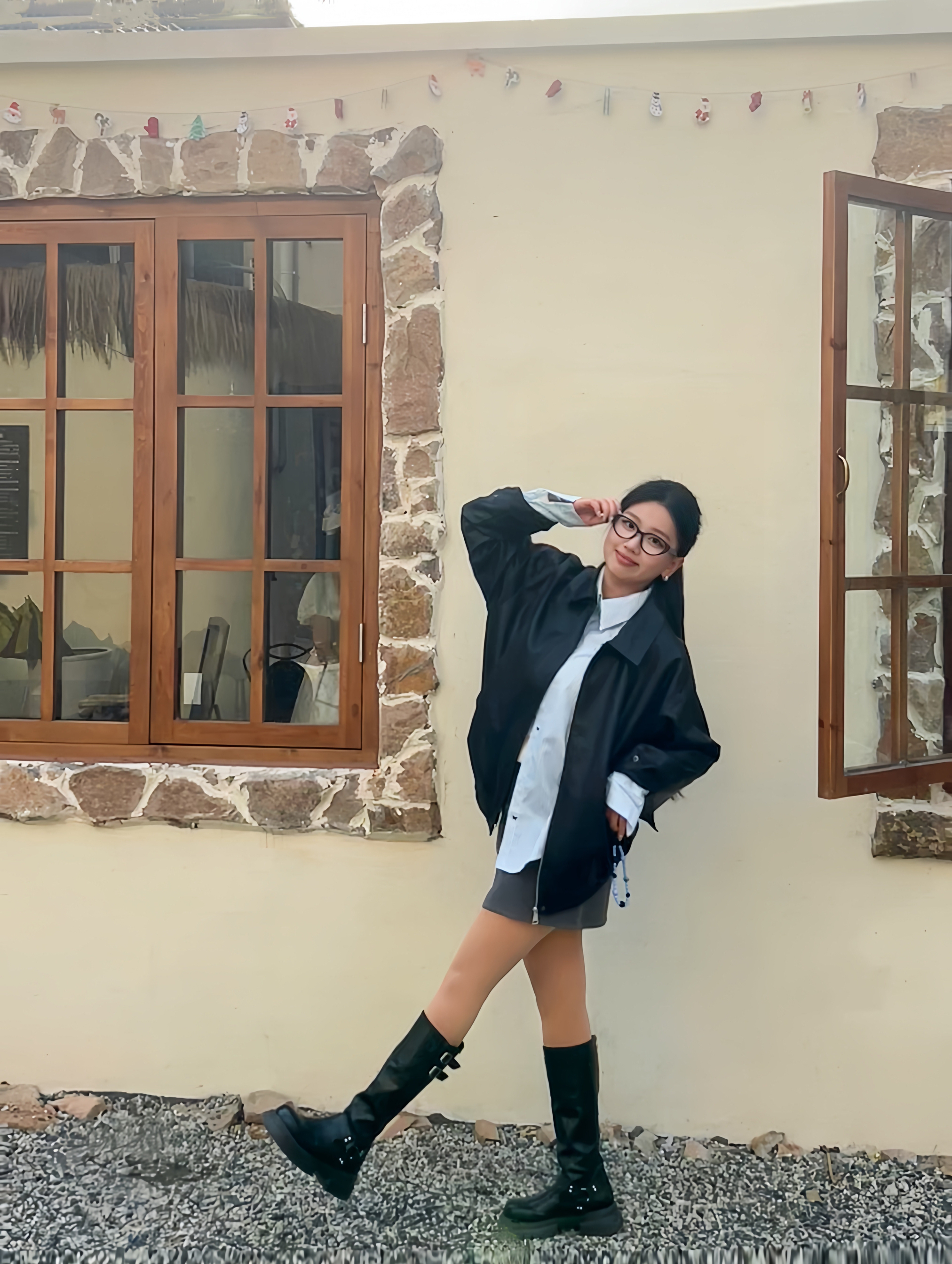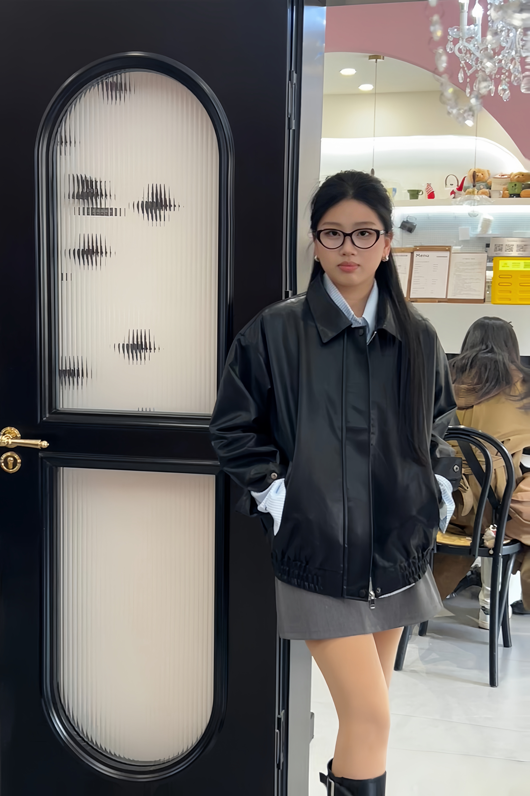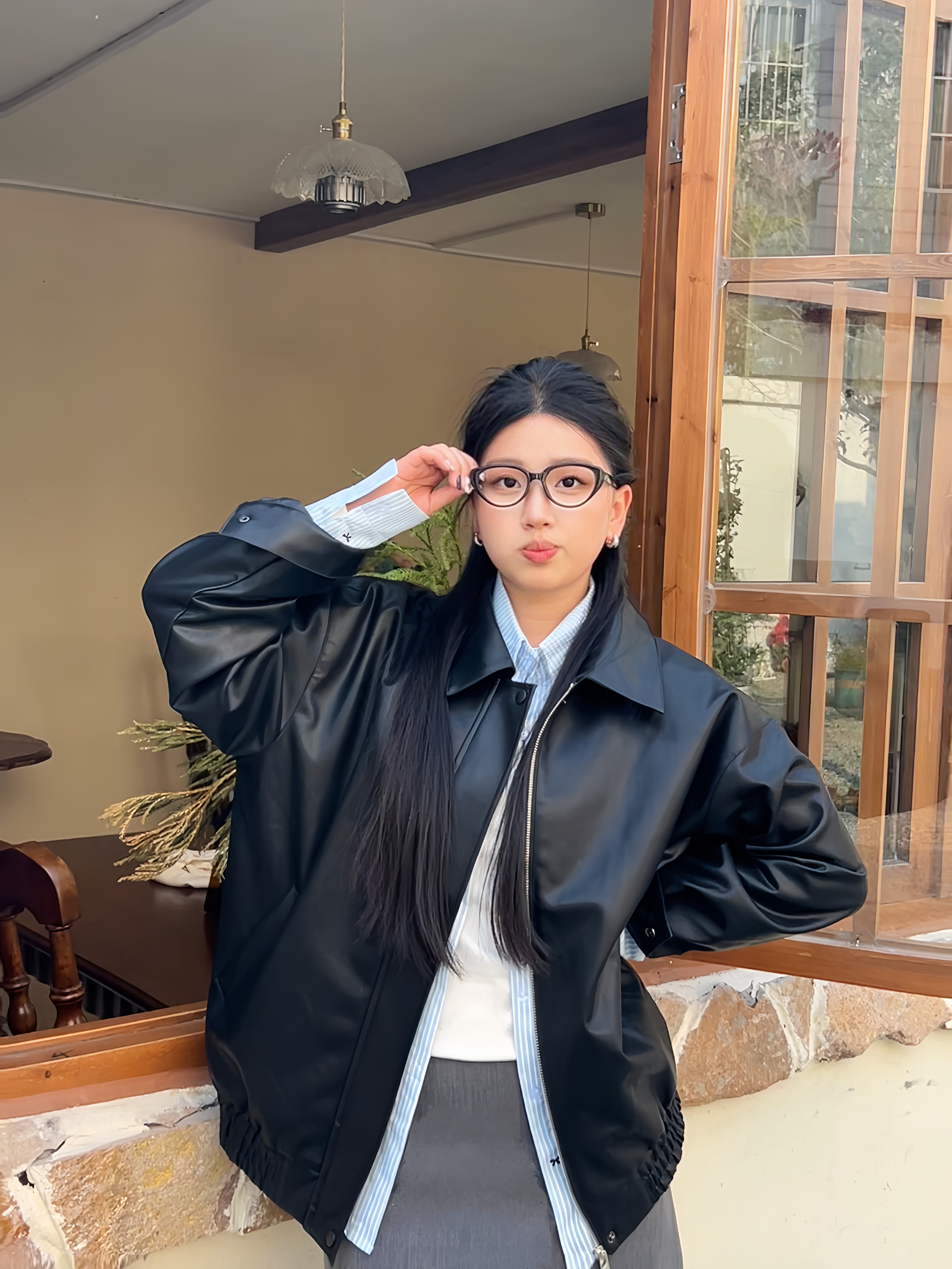皮衣无敌百搭 什么风格都能驾驭呢 🧍♂️ 穿搭风格:韩系小皮衣轻酷风 👔 上衣:皮衣外套➕衬衫叠穿 👖 下装:A字短裙很显腰身 👟 鞋子:长筒靴搭配 🎒配饰:眼镜框➕银色耳环