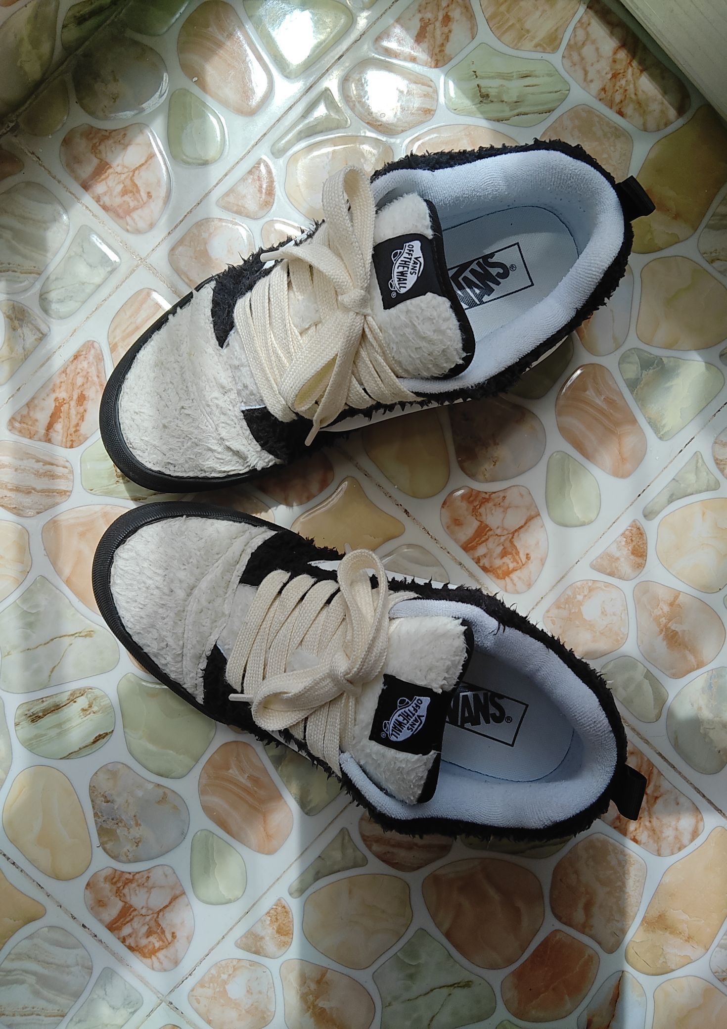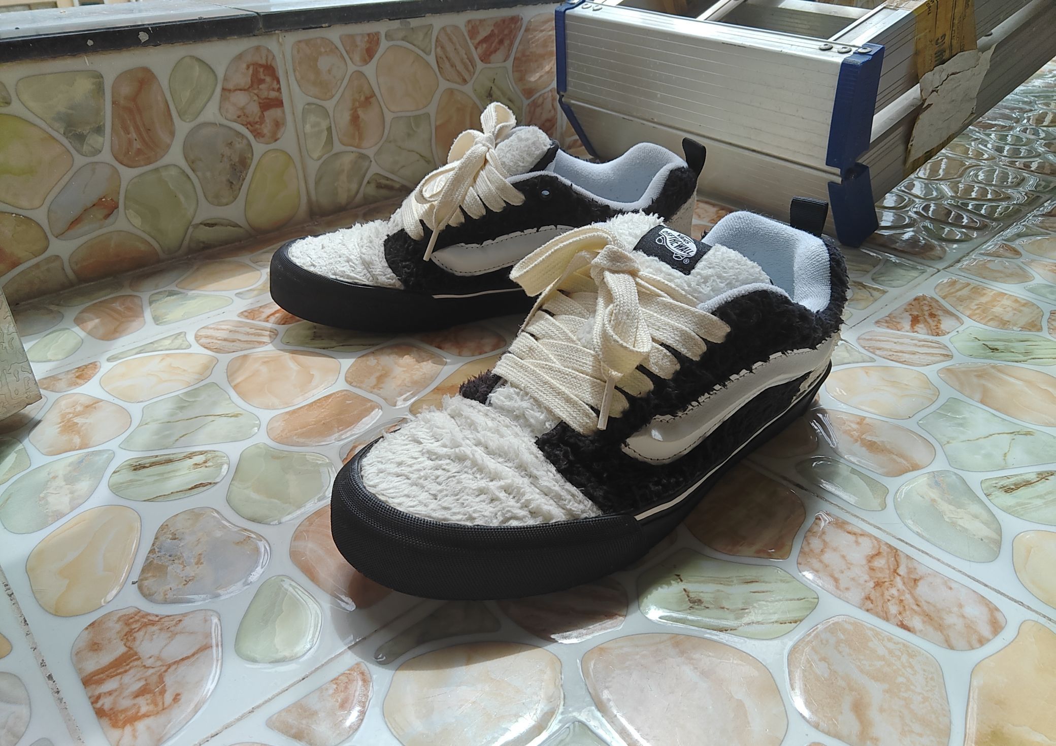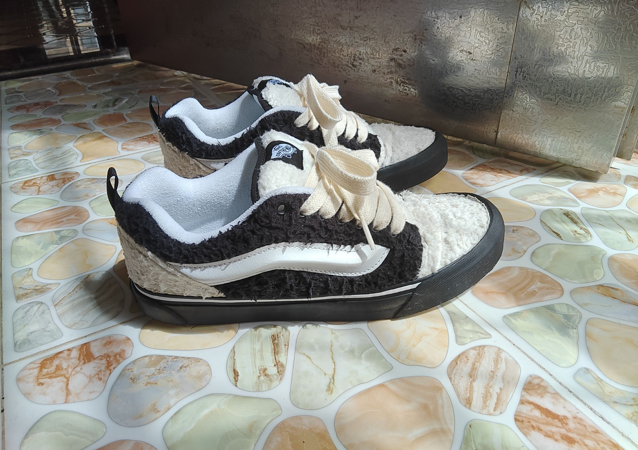 作为 Vans 死忠粉,这双 Knu-Skool 面包鞋真的让我眼前一亮!拿到手第一感觉就是“厚实但不笨重”,黑白泰迪绒拼接设计直接把冬季氛围感拉满,走在街上回头率超高,朋友还以为是新款联名款~ 外观细节 - 材质:鞋面采用黑白撞色泰迪绒材质,触感柔软蓬松,像抱着一只小熊猫🐼;白色部分是细腻的短绒,黑色则是偏长的卷毛,层次分明,质感高级。 - 设计:延续 Vans 经典侧边条纹(Jaz...