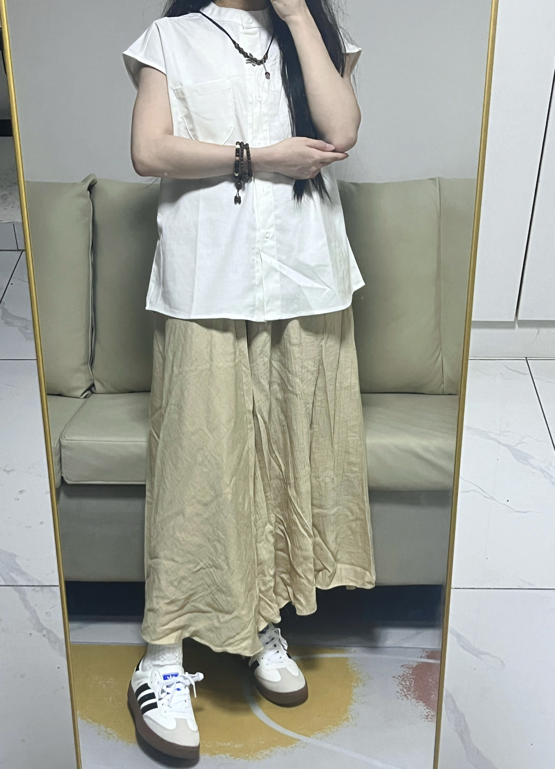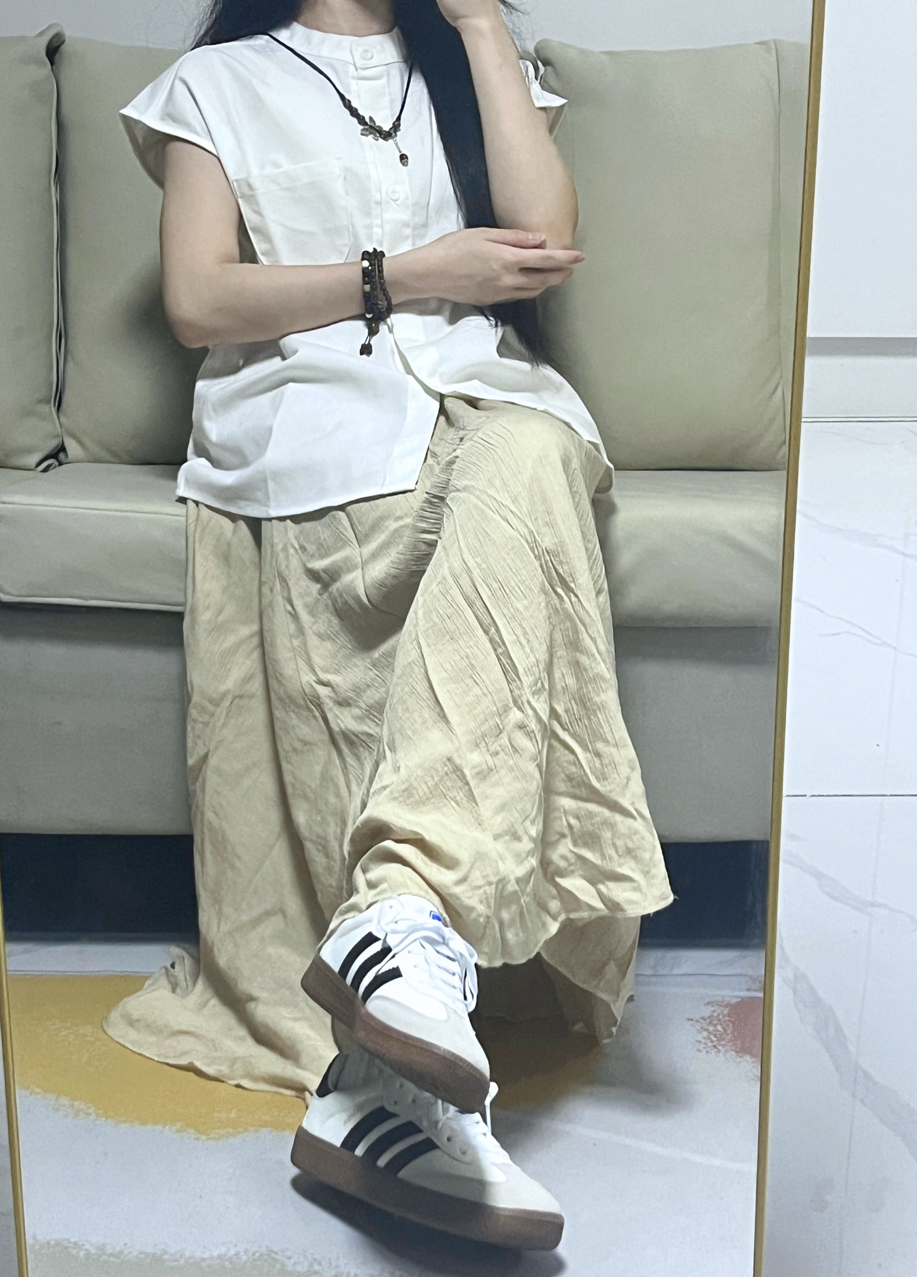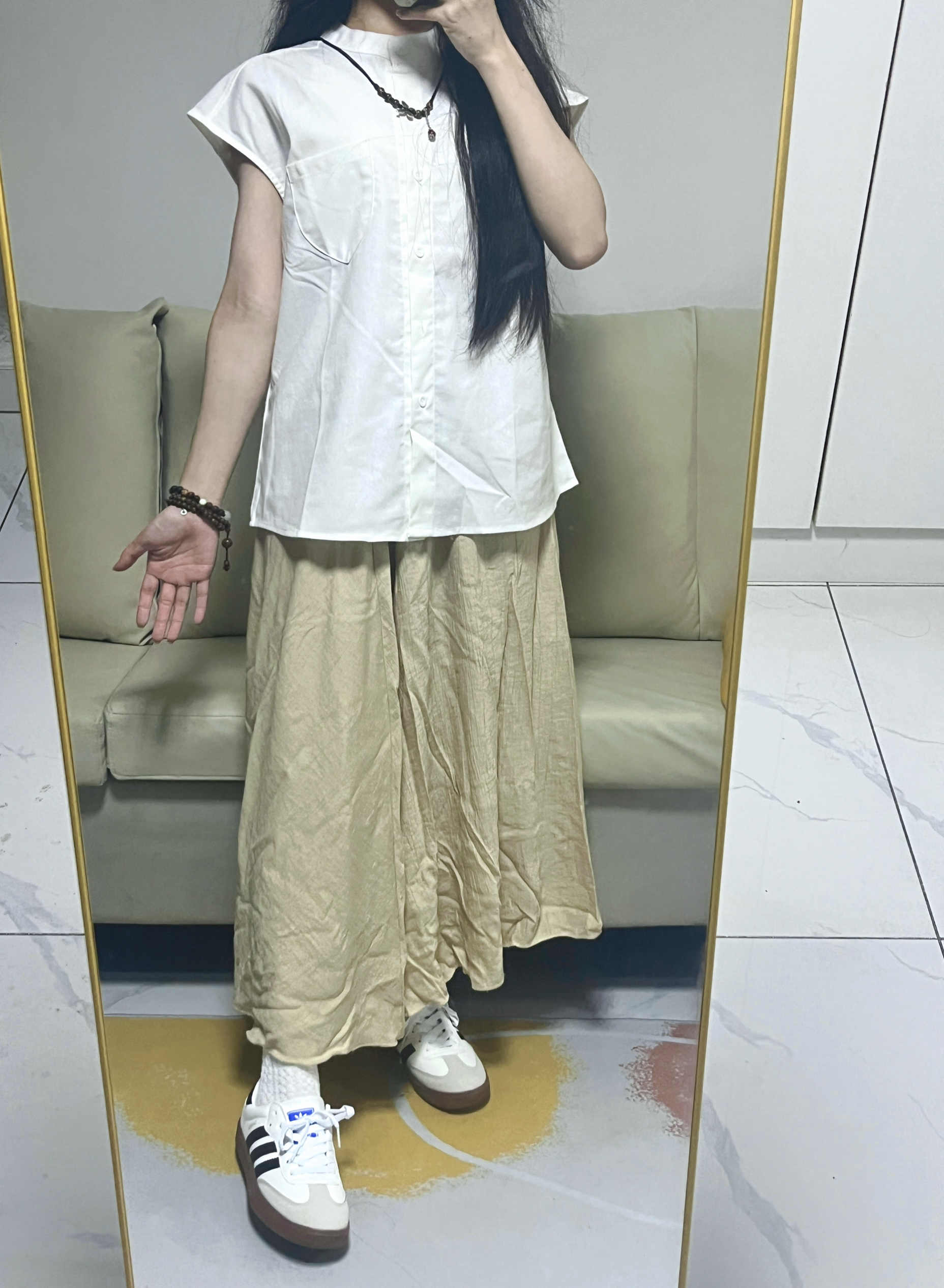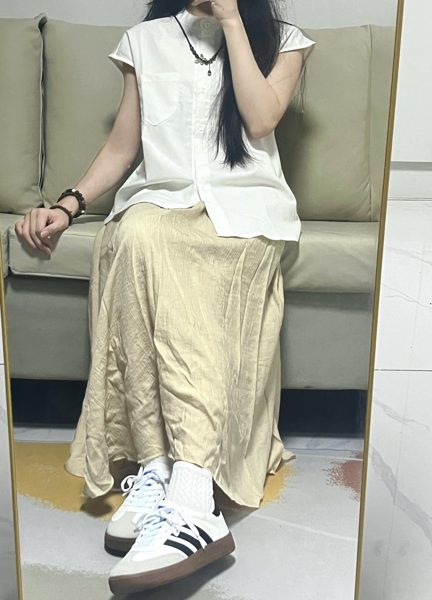 宝子们,今日这套穿搭很有气质~ 身高体重155/84 👔上身白色无袖衬衫,简约版型超显气质,单穿就很清爽 🩳搭配一条卡其色半身裙,随性又有休闲感,面料柔软透气 有垂感 👟搭配经典的adidas黑白板鞋鞋,高级感满满 这一套不挑身材不挑场合,日常出街、上班通勤都能hold住!