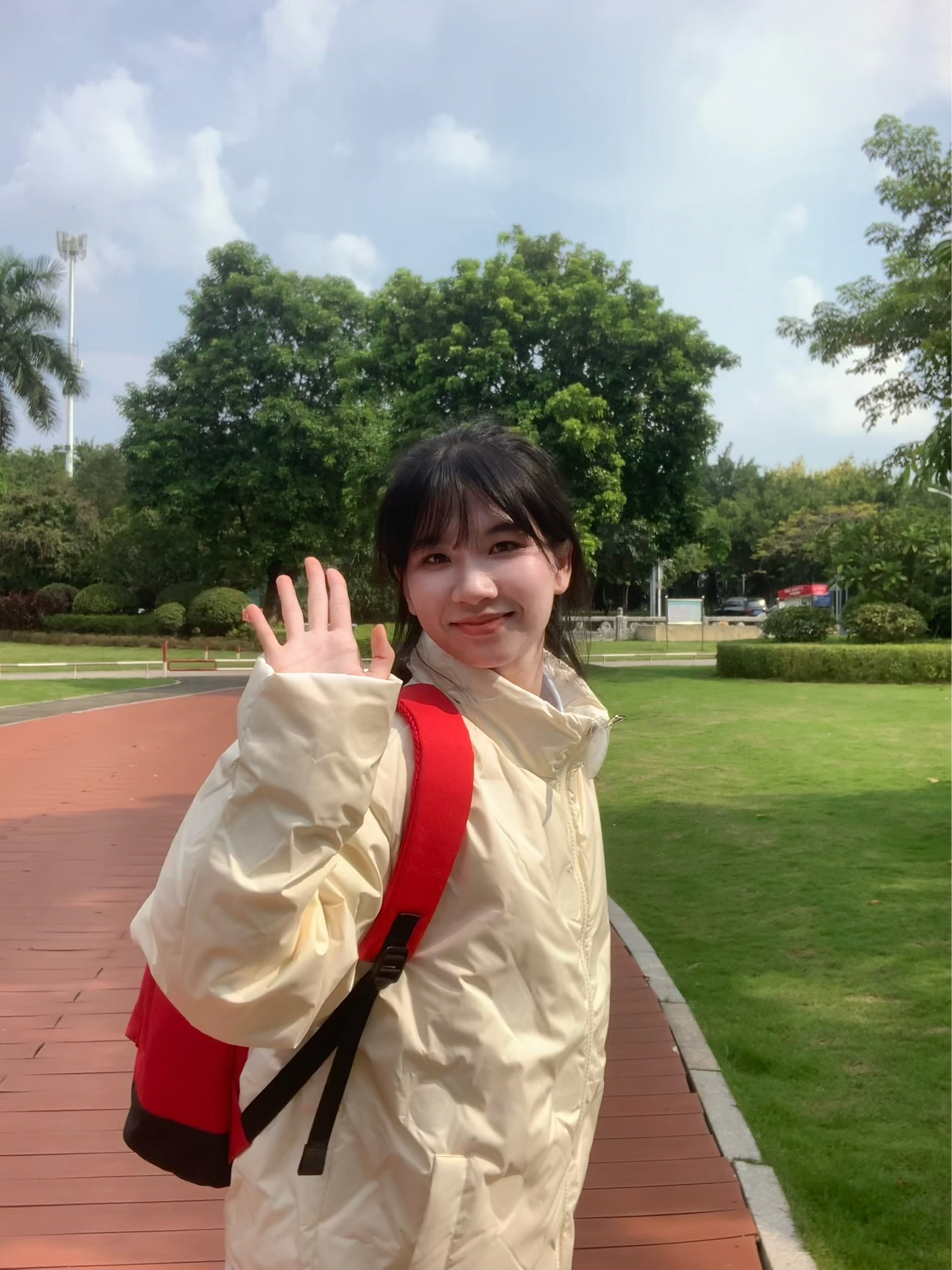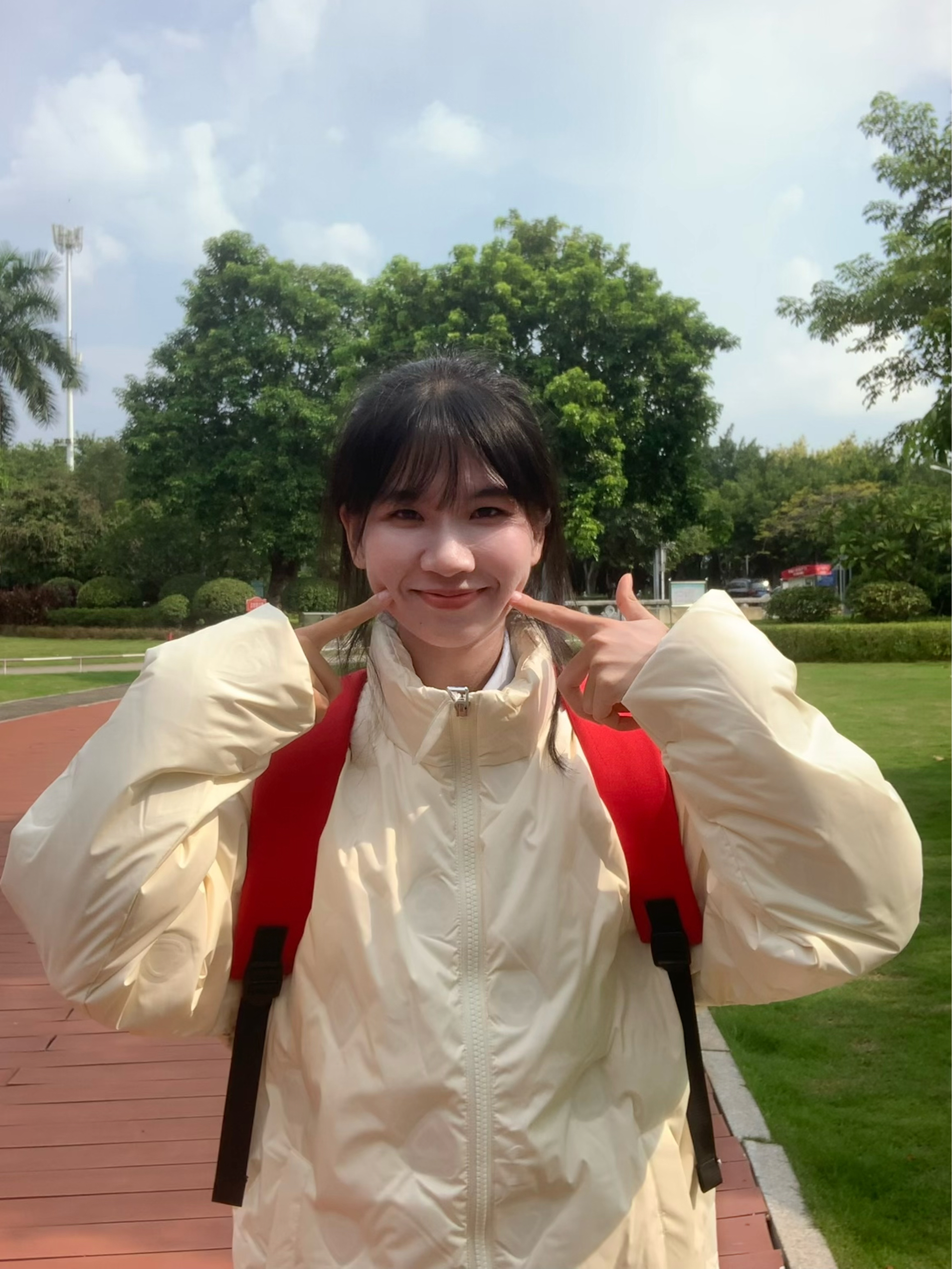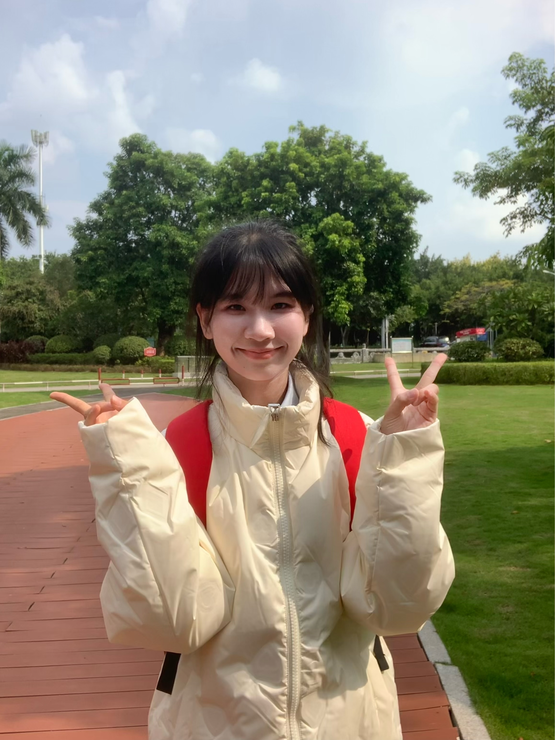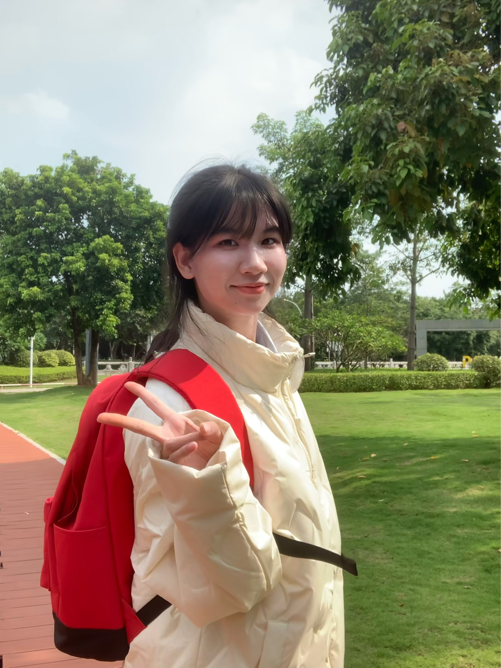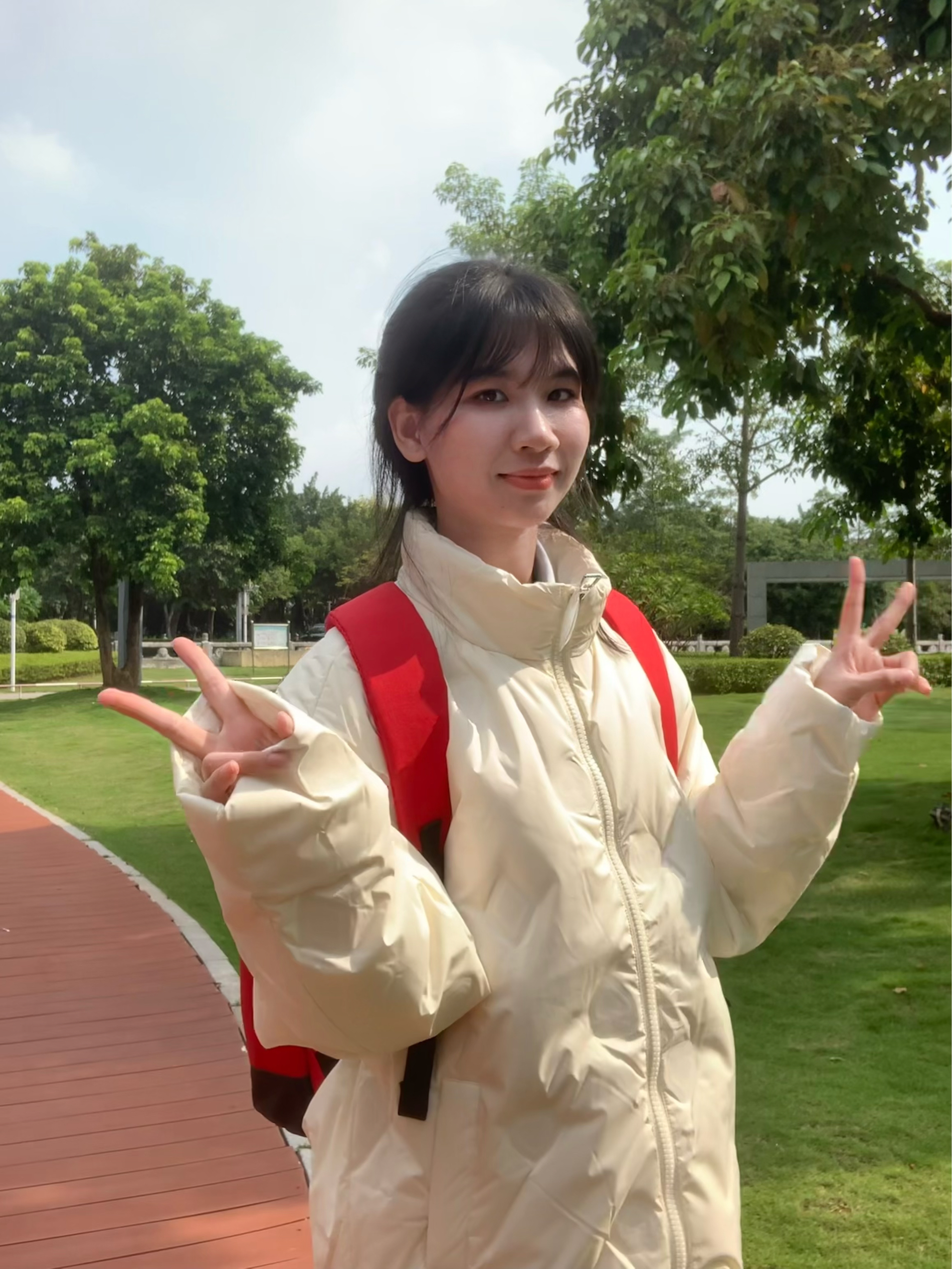 有暖呼呼的秋冬暖色系外套 就是很特别上镜 这款羽绒服不显臃肿 出片一个不之声 搭配白色牛仔裤 背上红色双肩包 扎一个丸子头 或者低马尾 整体风格比较偏可爱俏皮一些 又有一些松弛感 青春活力满满的 快要溢出屏幕啦 我们来到公园小路旁 随便摆一些我们喜欢的动作 个子比较小可以和我一样 摆一下温柔可爱的姿势 很轻松上镜哟~ 挑一个有阳光角度 增加氛围感和氧气感 出片和呼吸一样简单 可以准备一个...