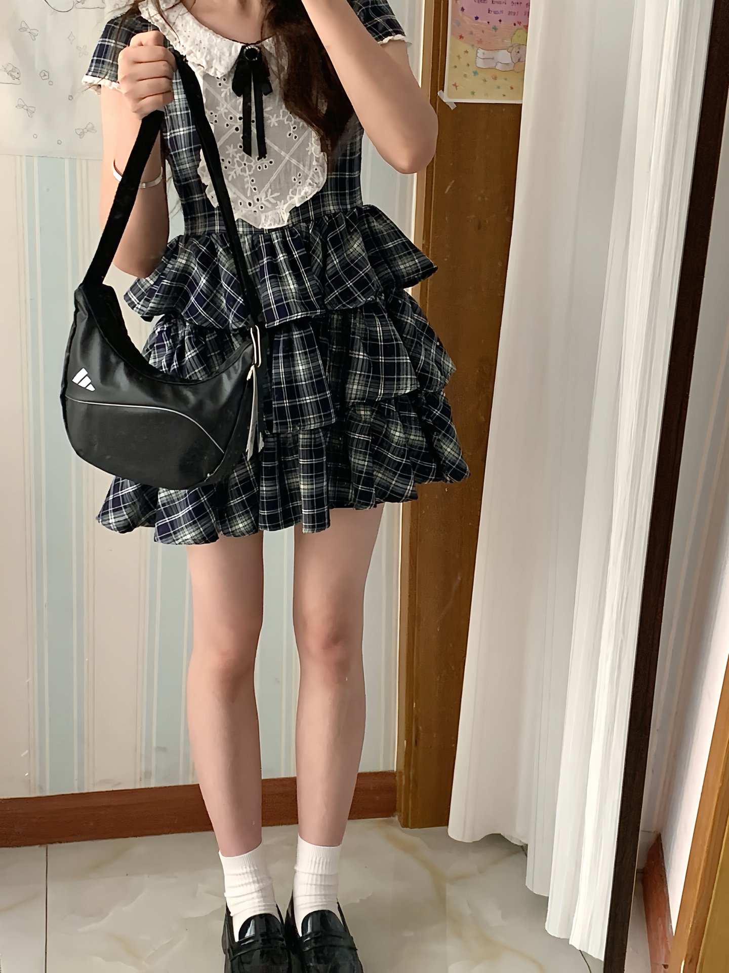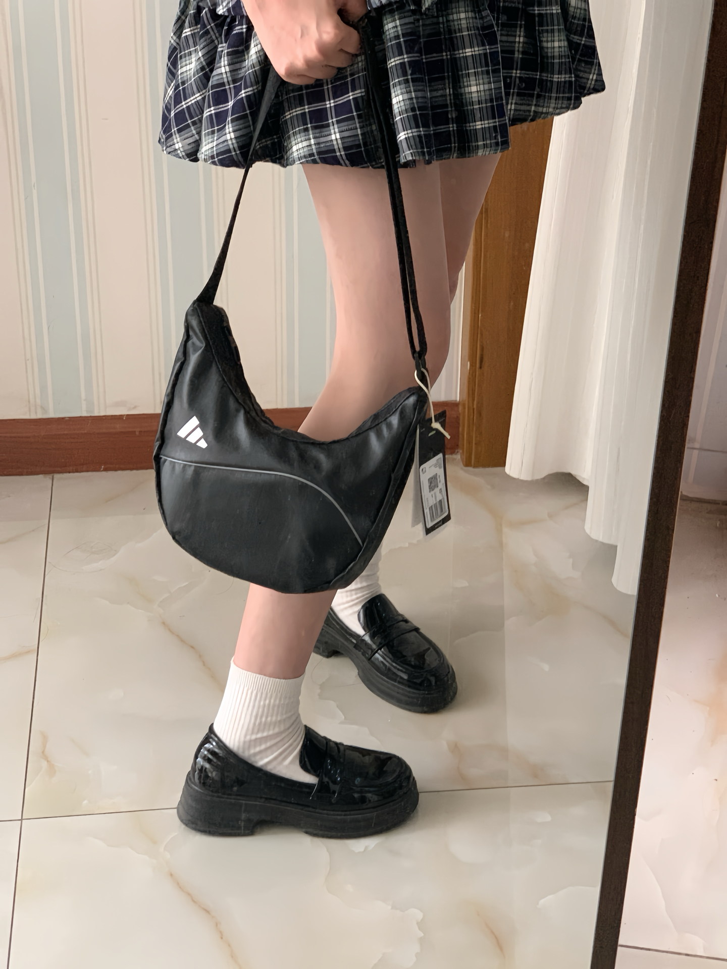 无论什么时候格纹裙都很经典 🎀 纠结的时候直接一身就可以搞定 搭配黑色乐福鞋非常学院风~ 哑不哑光都是不错的选择() 🩶 新入手的阿迪斜挎 非常百搭 实践出真知请看往期🪧 ~ 图源网络,侵删!