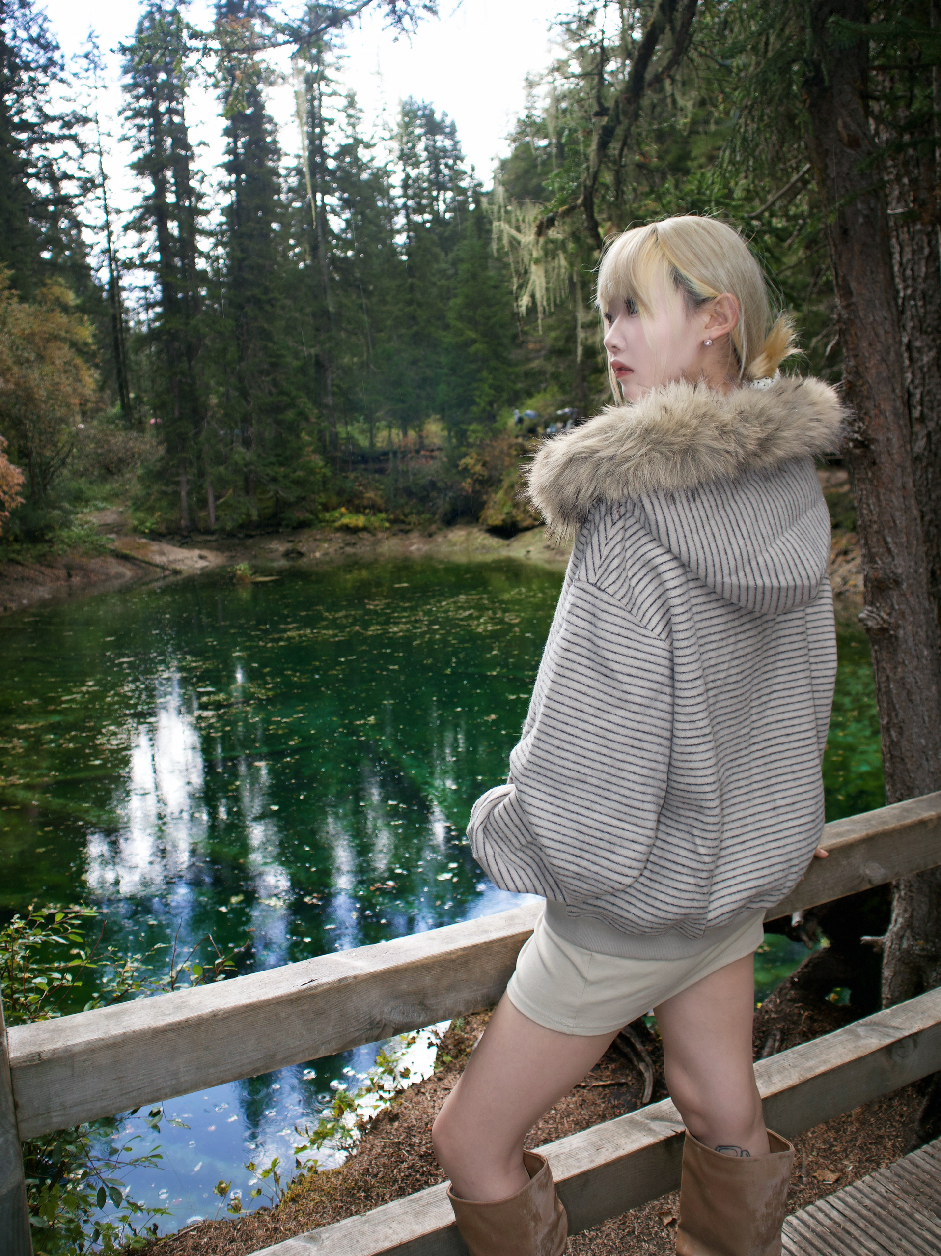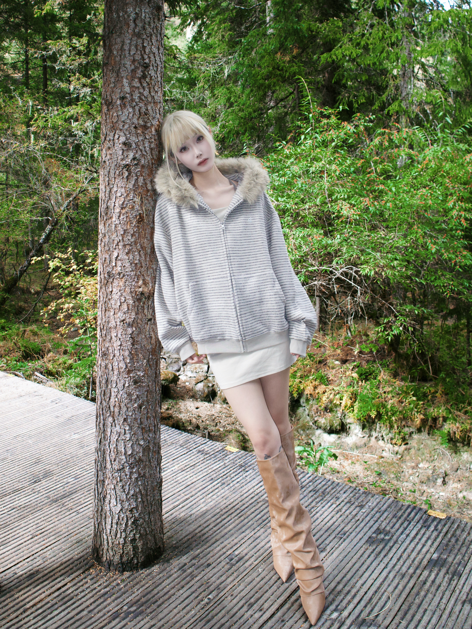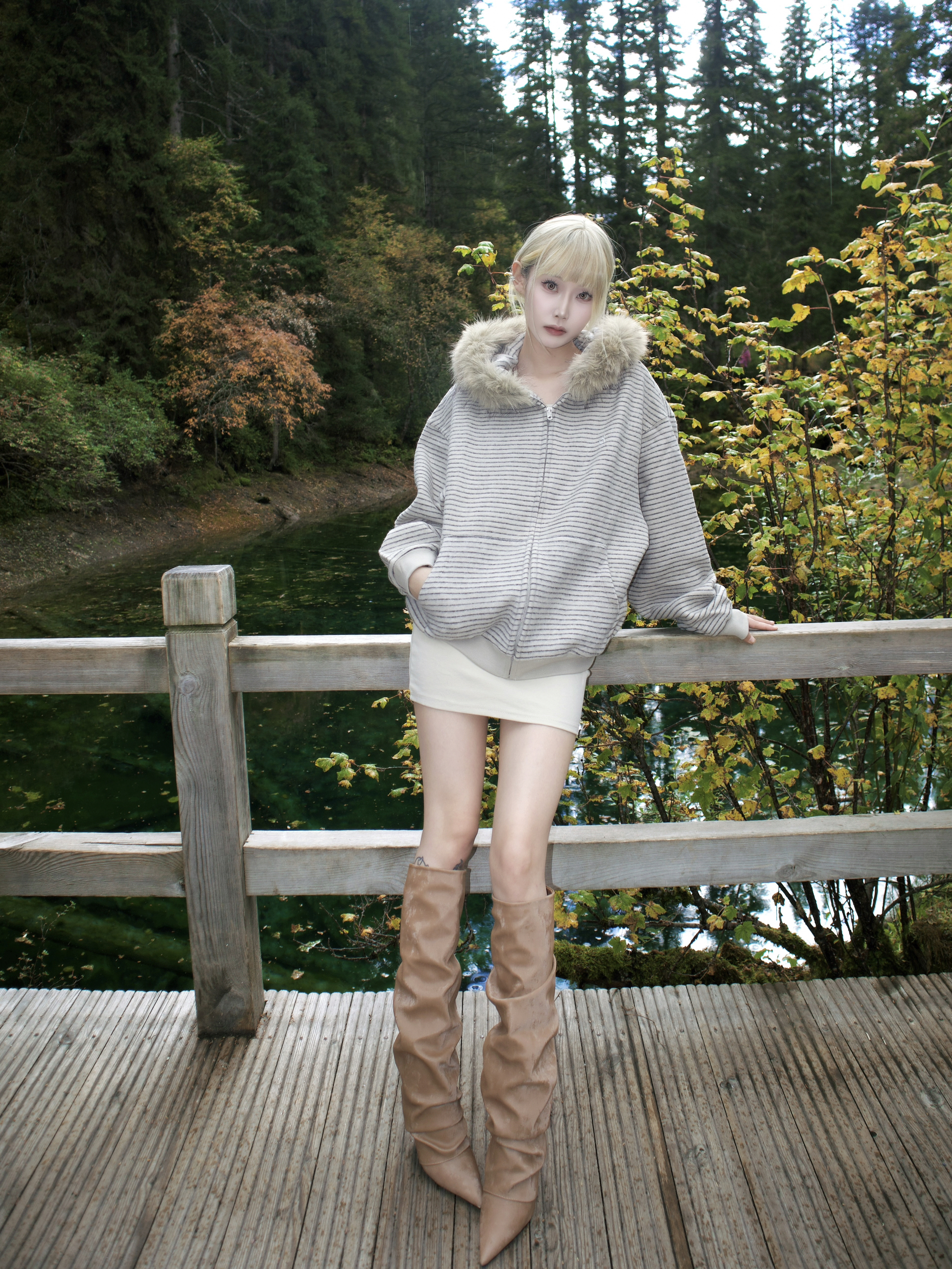 去二道海这种地方 穿搭既要舒服能走 又想拍出好看的照片 这套杏色系搭配真的完美达标!🤎 杏色的连帽卫衣外套 毛领帽子一戴 不仅保暖 氛围感立刻拉满 😻 里面我直接搭了件同色系的连衣短裙 看起来特别温柔 又省去了上下搭配的烦恼 浅棕色的尖头坡跟及膝靴!👢 它的皱褶设计和堆堆感 让靴子一点也不死板 特别时髦 坡跟走起路来太稳了 在户外完全无压力 而且超级显腿长! 浅棕色和杏色外套呼应得像天生一套