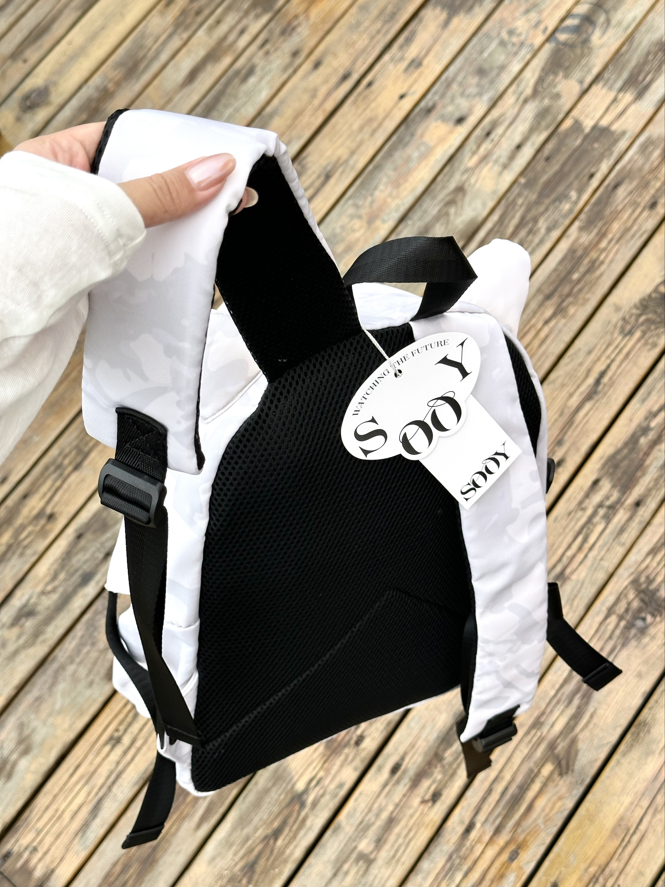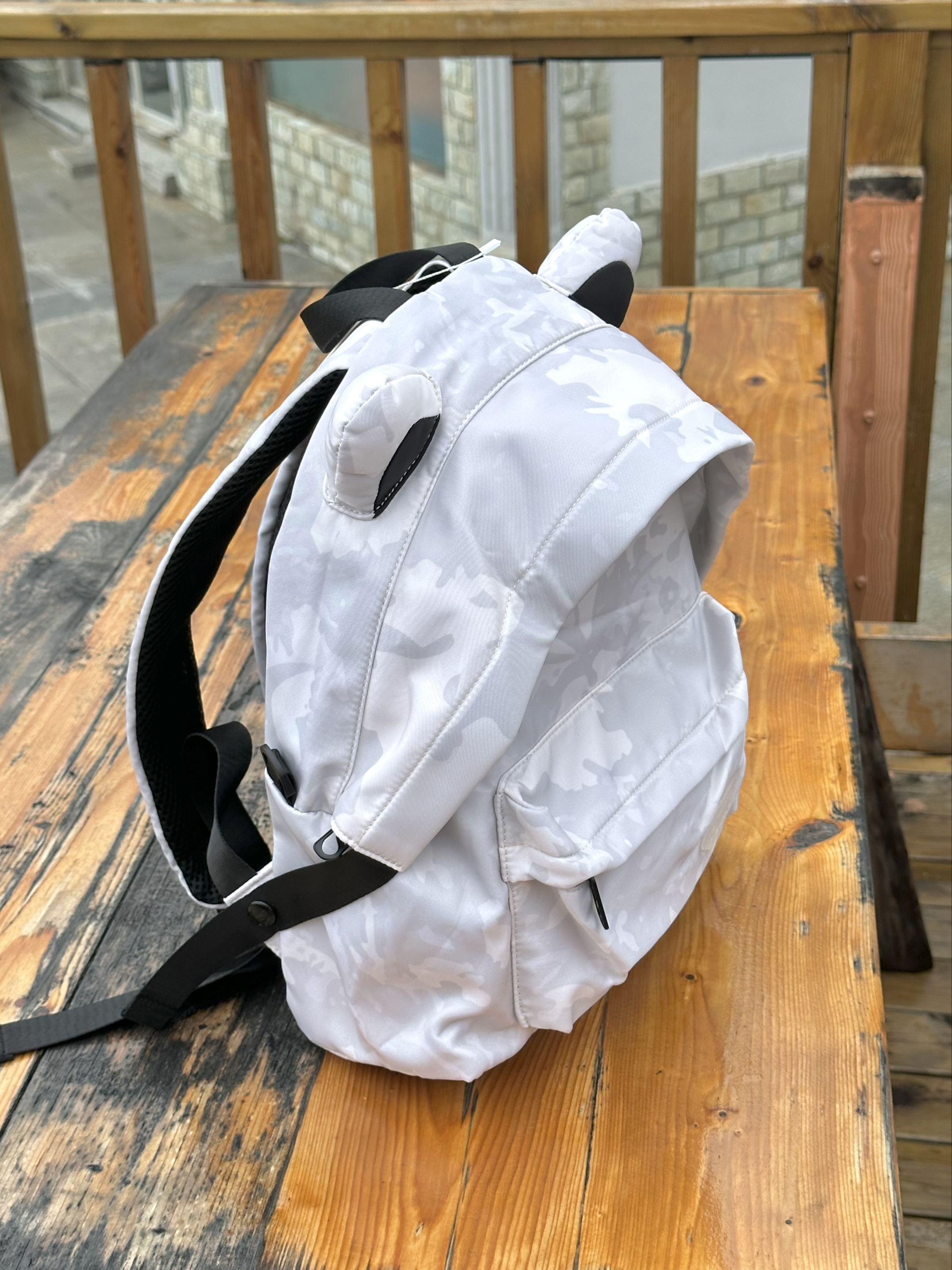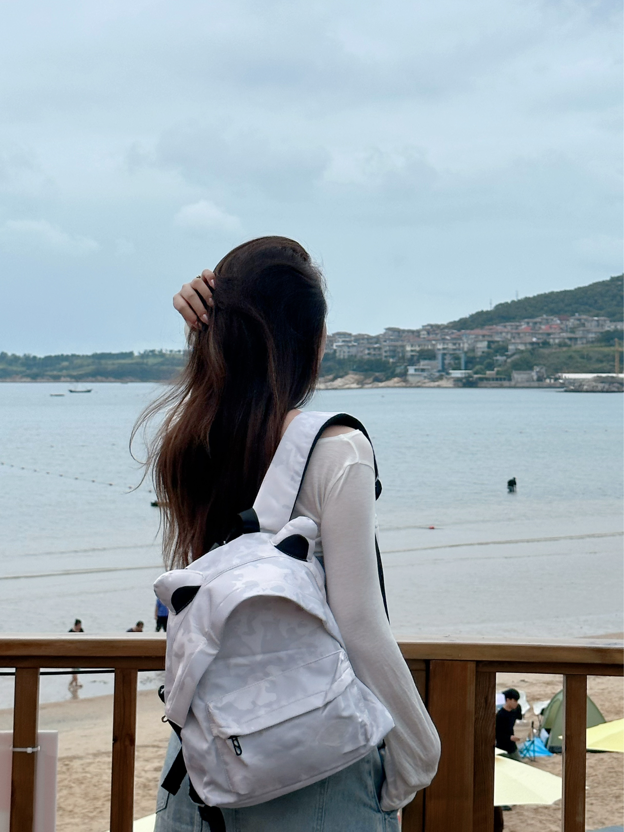 圆鼓鼓的身子搭配两个小耳朵 简直不要太可爱 今天去海边玩背着它,真滴好实用 多个隔层,装手机耳机的小物件蛮安全的 主袋容量也挺大,装得下厚外套 白灰配色很清新的 和我今天的穿搭还蛮配的!