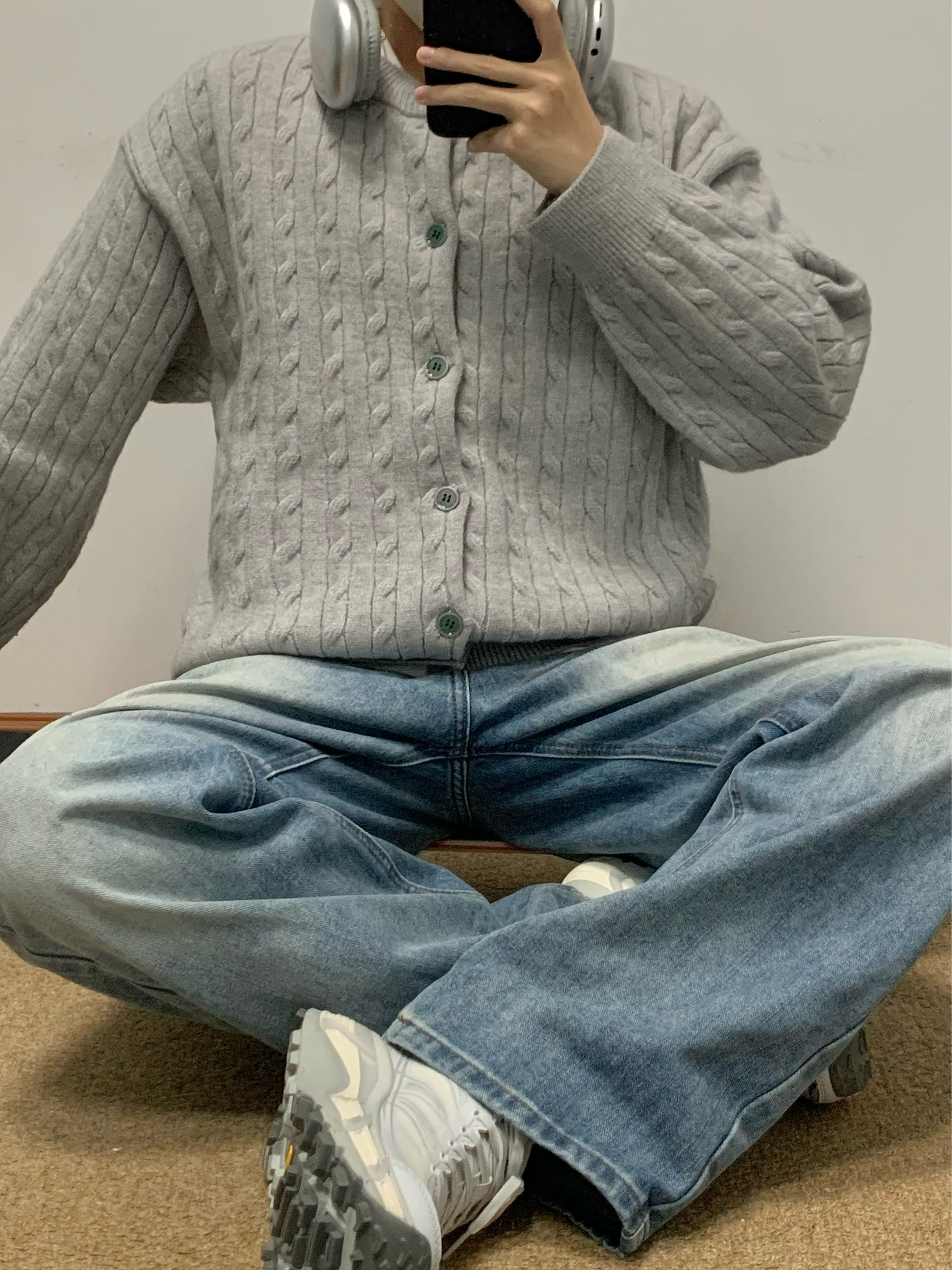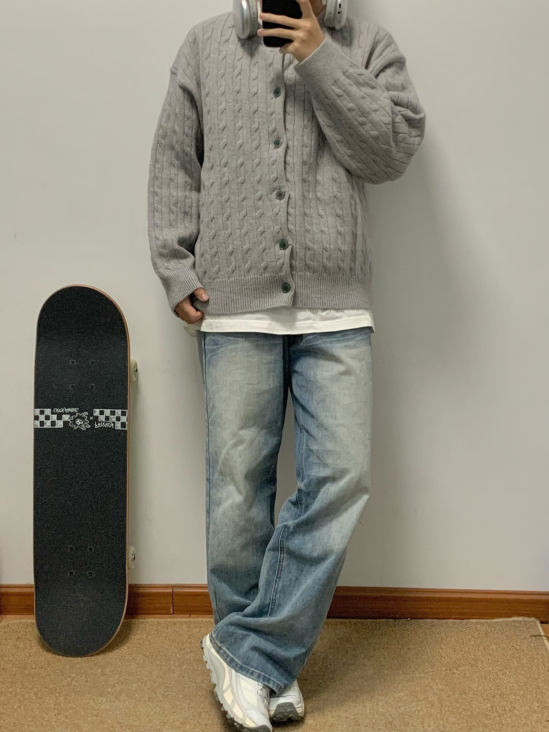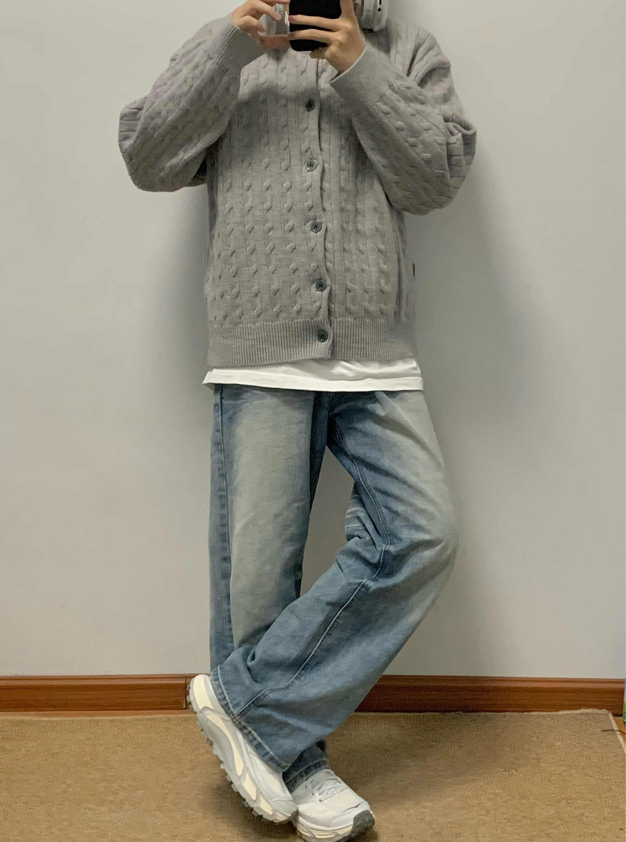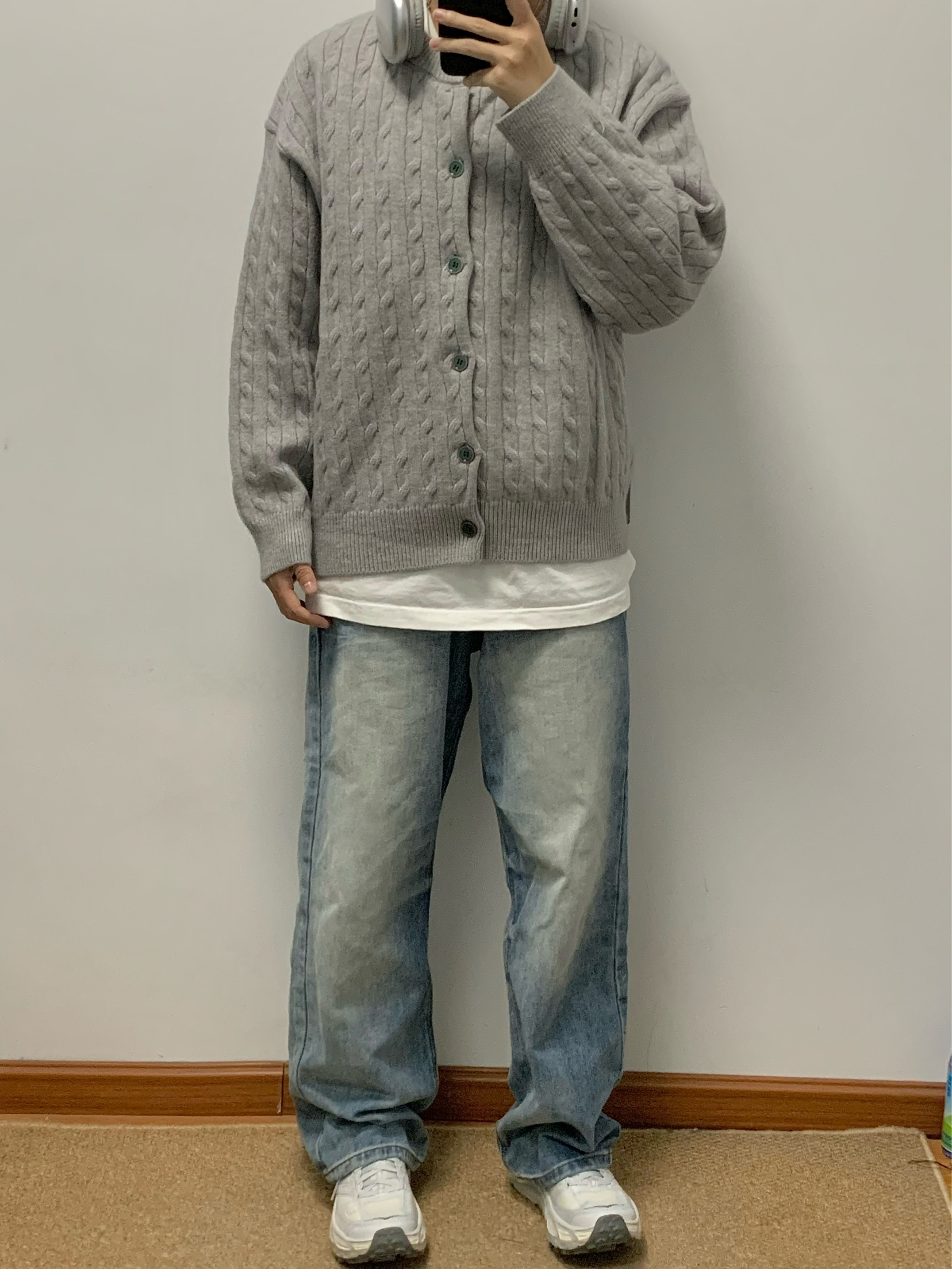 灰色毛衣开衫搭配蓝色牛仔裤 少年感十足 麻花纹理设计 质感软糯 上身舒适 内里搭配一件白T 松弛感拿捏 入秋就穿这一身 包帅的!