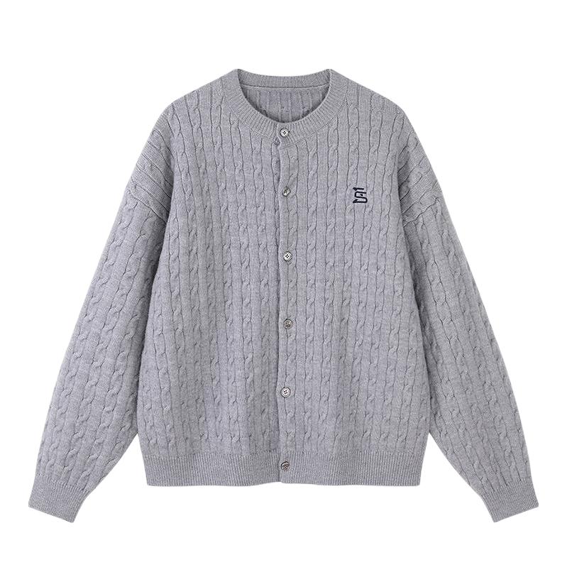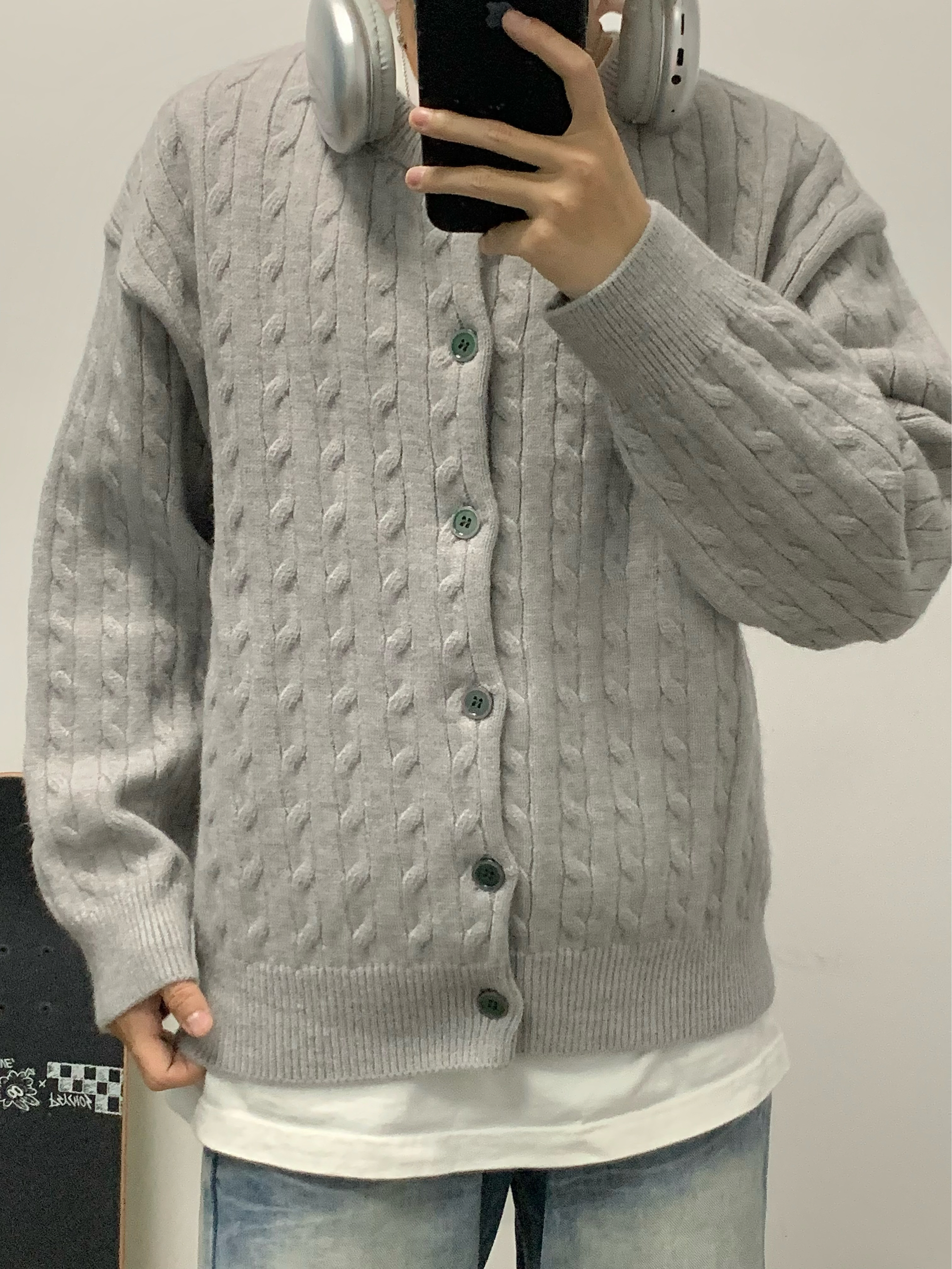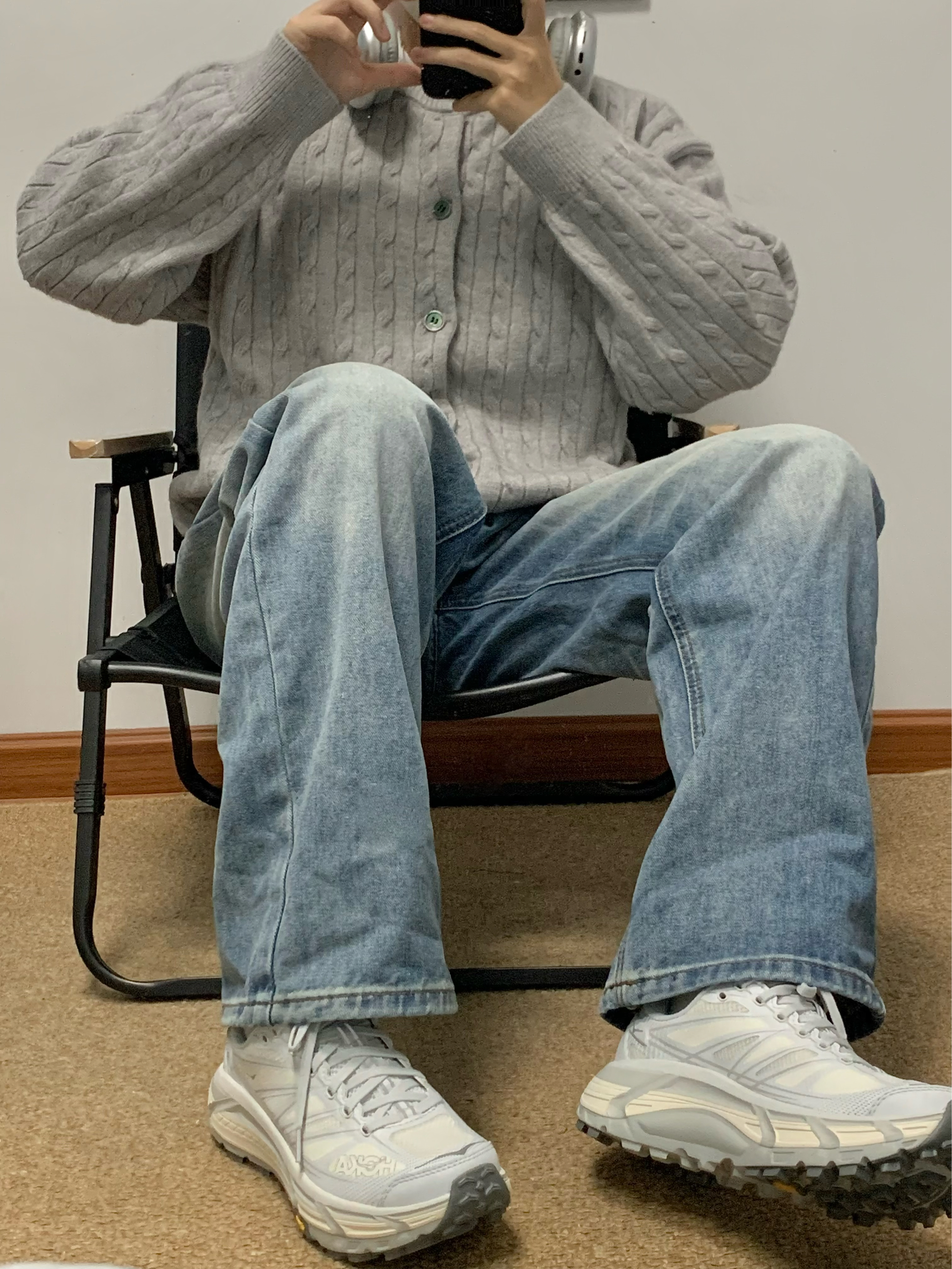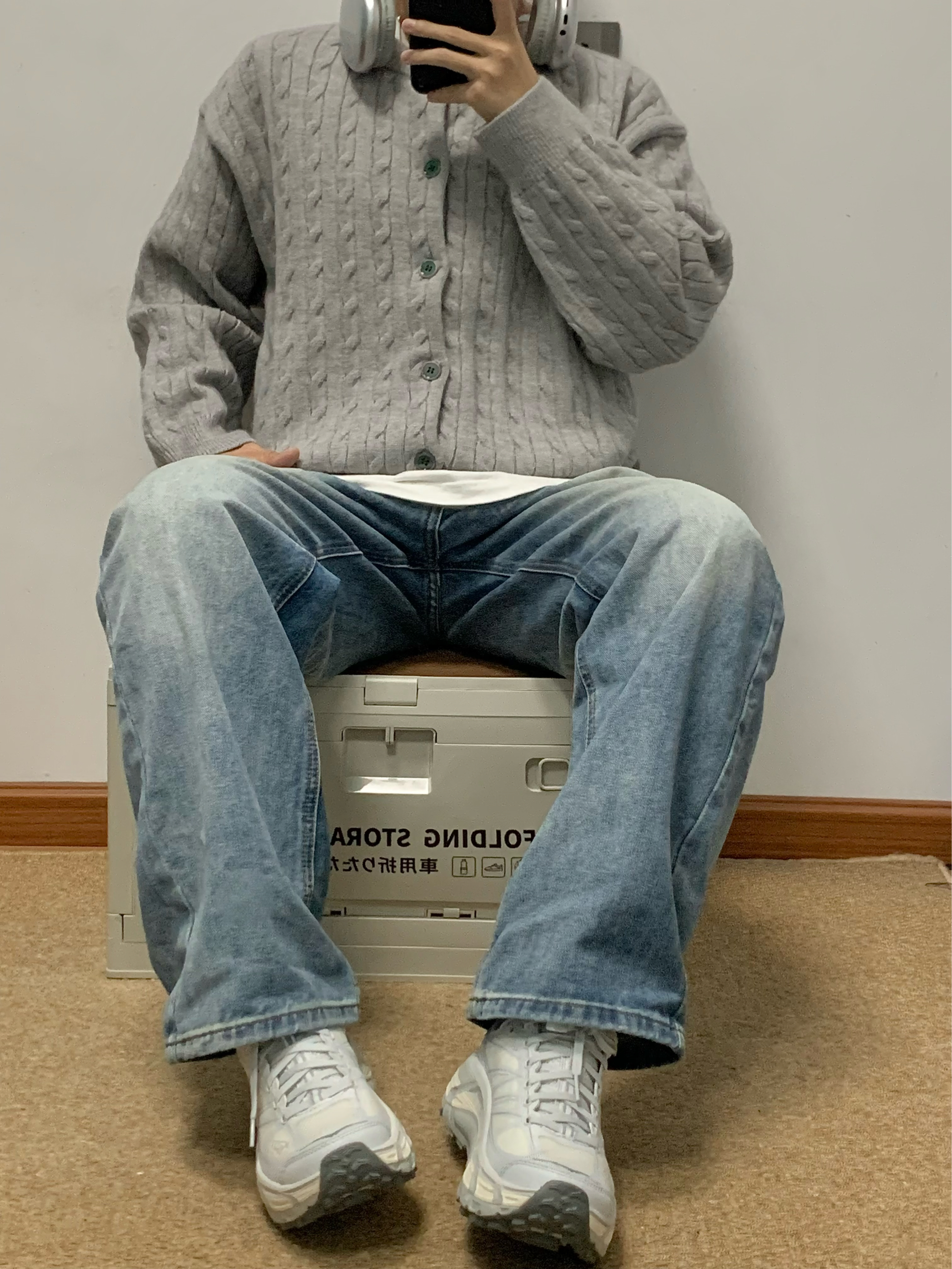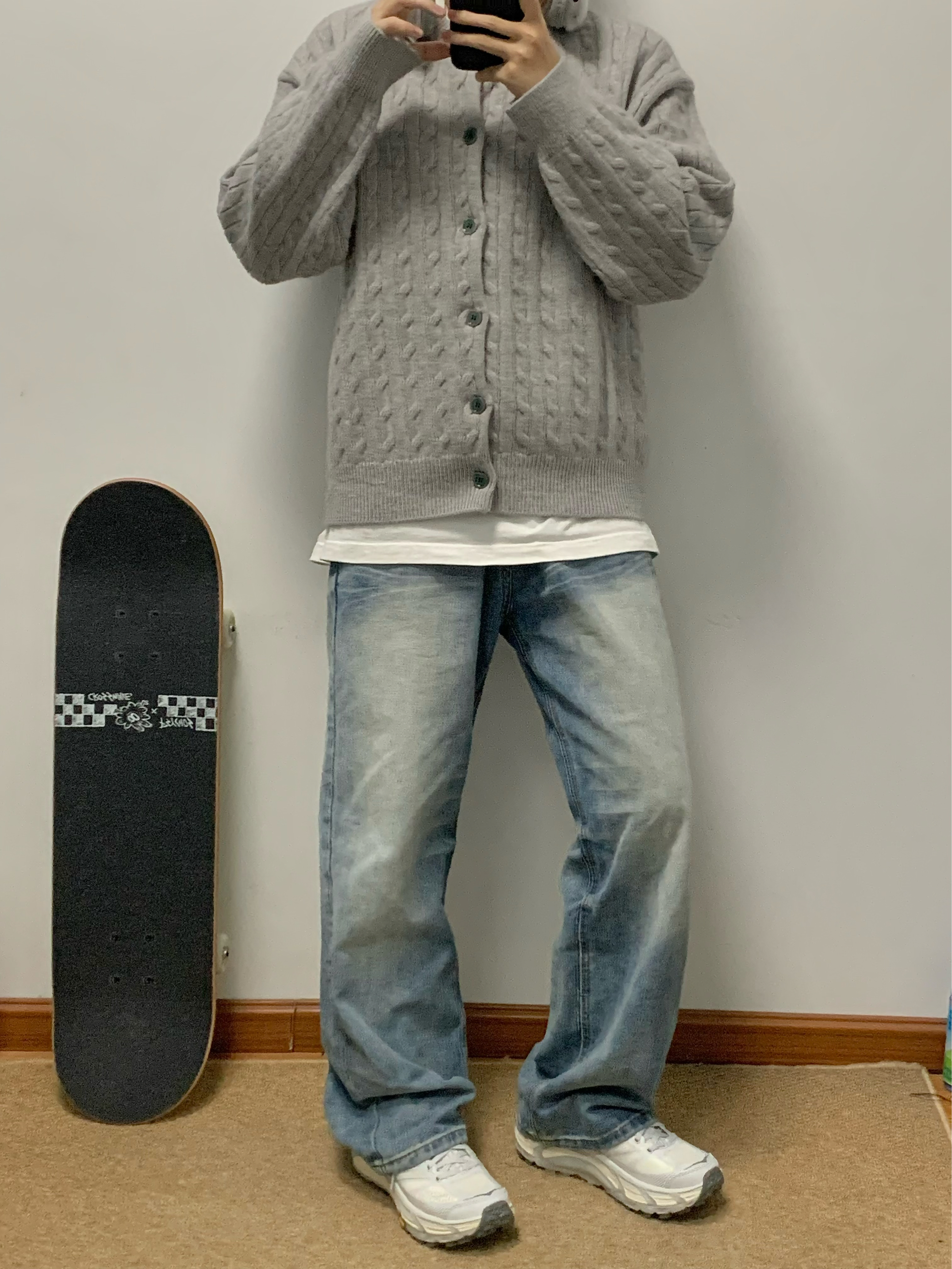 灰色毛衣开衫搭配蓝色牛仔裤 少年感十足 麻花纹理设计 质感软糯 上身舒适 内里搭配一件白T 松弛感拿捏 入秋就穿这一身 包帅的!