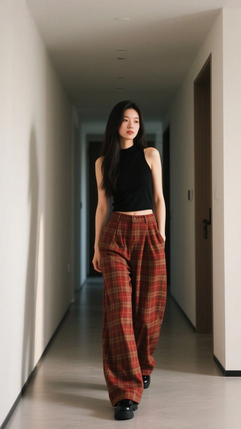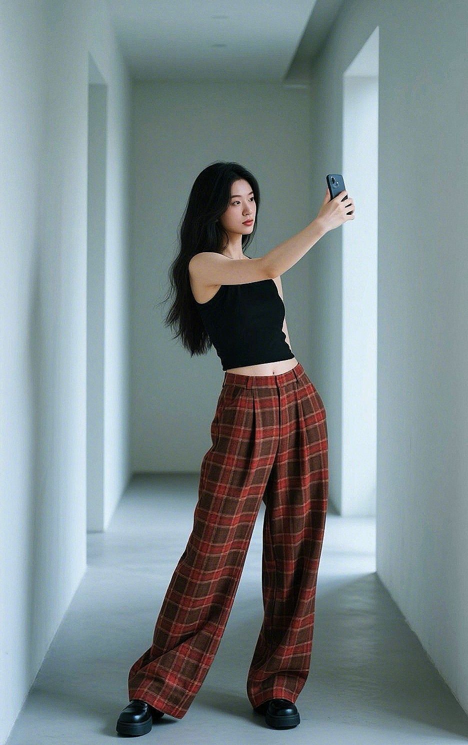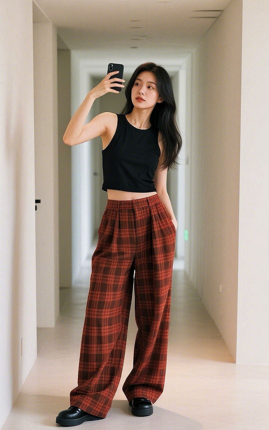 当复古红棕格纹阔腿裤遇上极简黑色短款背心,再踩一双厚底乐福鞋,慵懒随性中又透着毫不费力的高级感。 格纹裤的复古腔调自带故事感,宽大的裤型慵懒又遮肉,行走间尽是洒脱姿态;黑色背心利落剪裁,露出腰线瞬间拉高比例,将酷感与性感巧妙融合。厚底鞋的加入,让整体造型多了几分街头潮酷,又平衡了阔腿裤的松弛感。 不管是日常出街还是随性通勤,这套穿搭都能让你在复古与现代的风格里自如切换,轻松成为人群中辨识度...