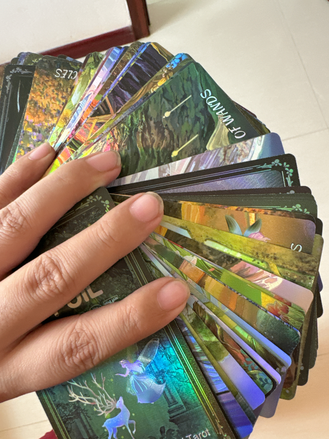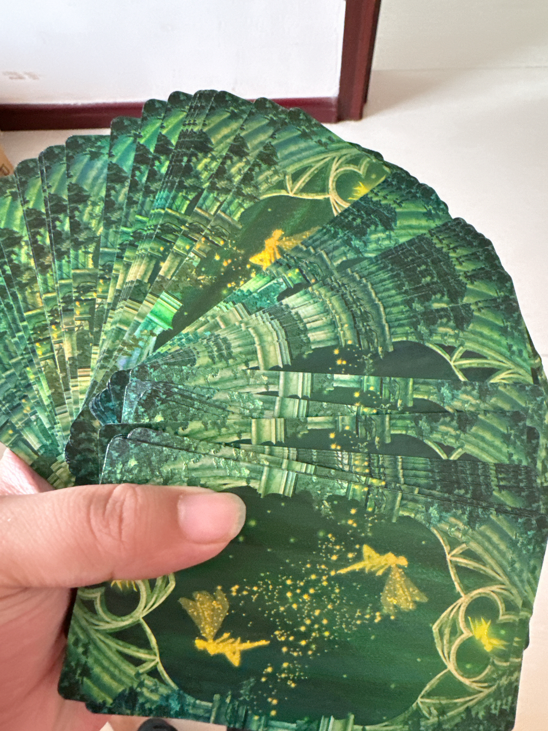 我最近入了套桌游卡牌,PVC材质手感蛮好,就是拿的时候有点滑~卡牌上金箔闪闪的,颜值很戳我!打开时书味重得有点刺鼻,通通风就好很多啦😄 说明书全英文,我这种英语菜的得慢慢研究…不过架不住它格子内部设计很神秘高级! 平时和朋友聚会、自己研究玄学都能玩~喜欢这类风格的可以试试,我觉着性价比还成,就是刚上手得适应下那些小缺点~