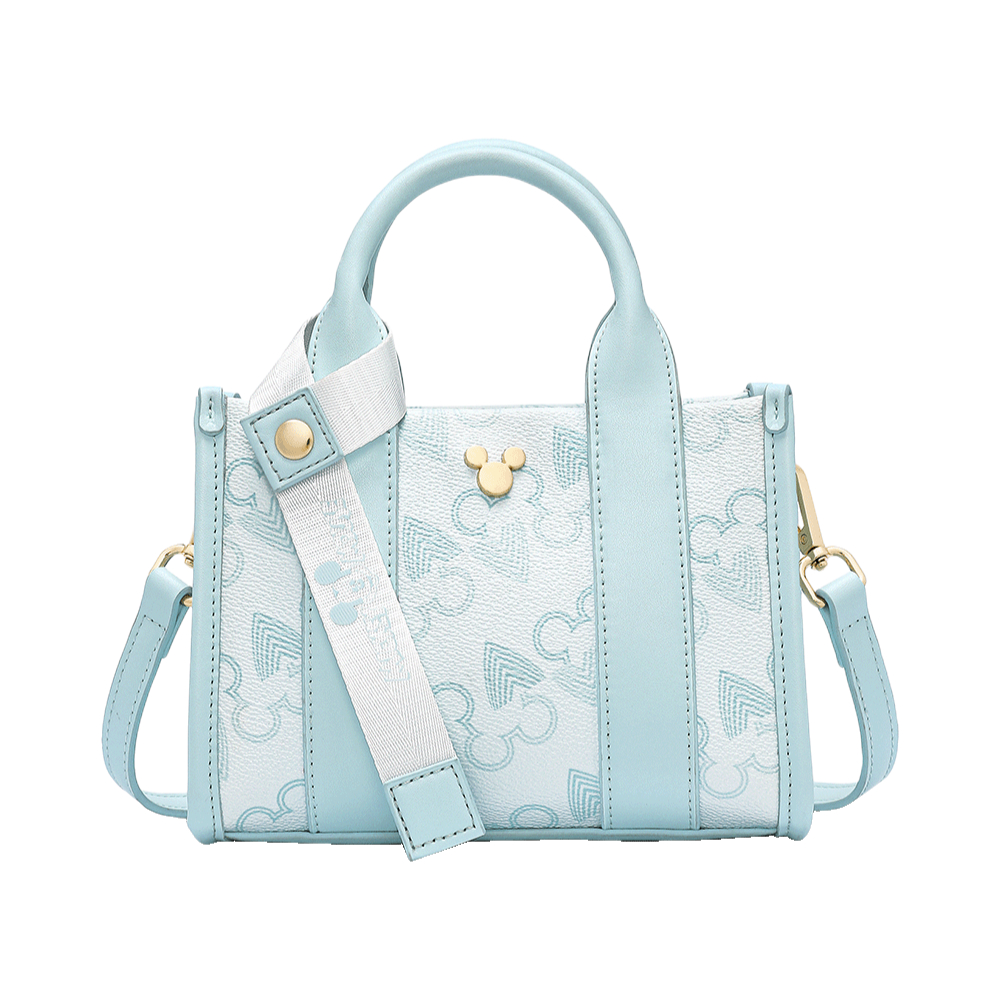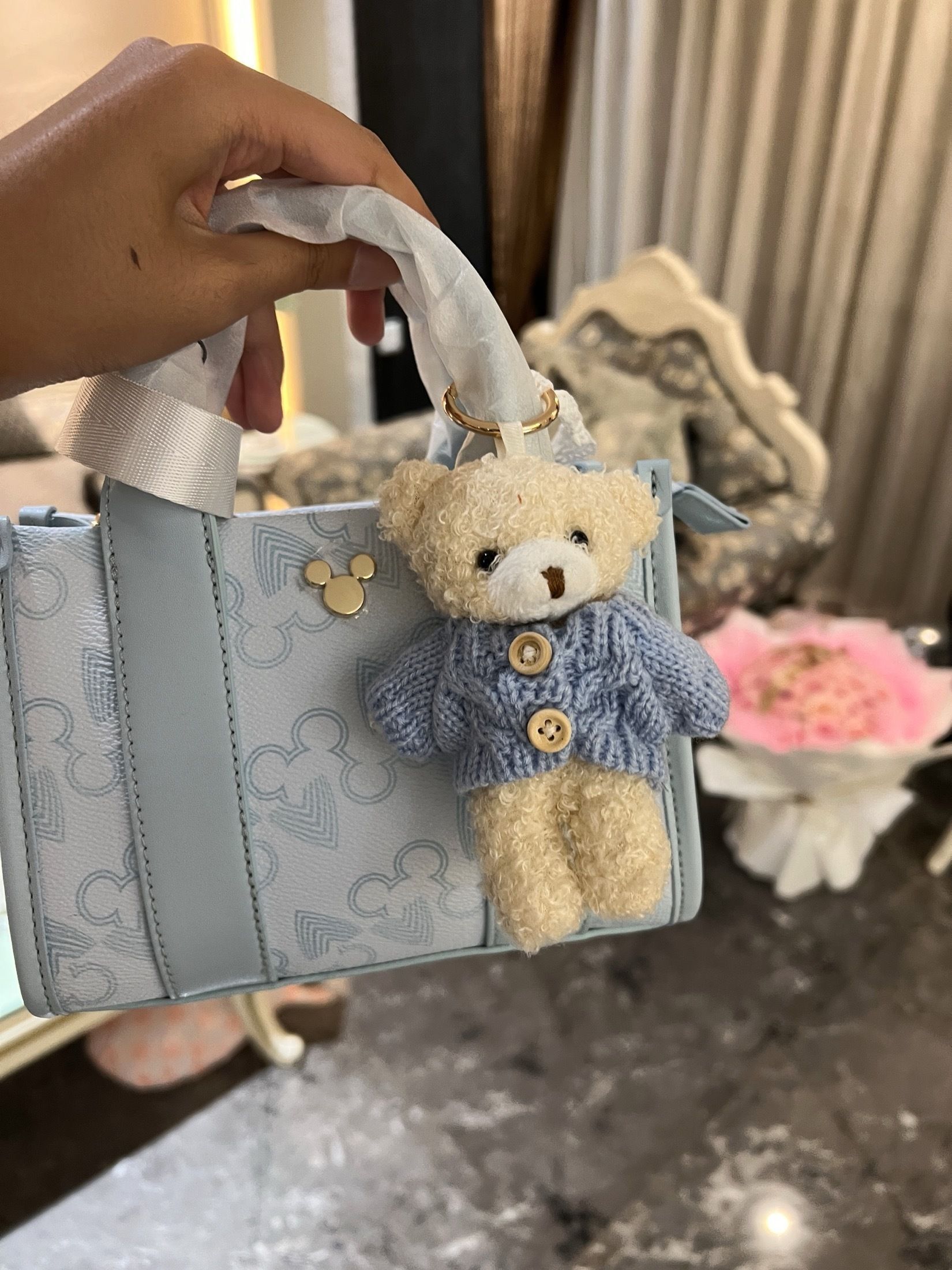 米奇元素邂逅浅蓝温柔,搭配针织小熊挂饰,可爱值拉满!手提设计精致百搭,日常出街装下小物,让你甜妹感十足。 白色亮面质感,经典包型配精致五金,可爱与质感并存。不管是通勤还是逛街,有它在,轻松打造元气少女风。
